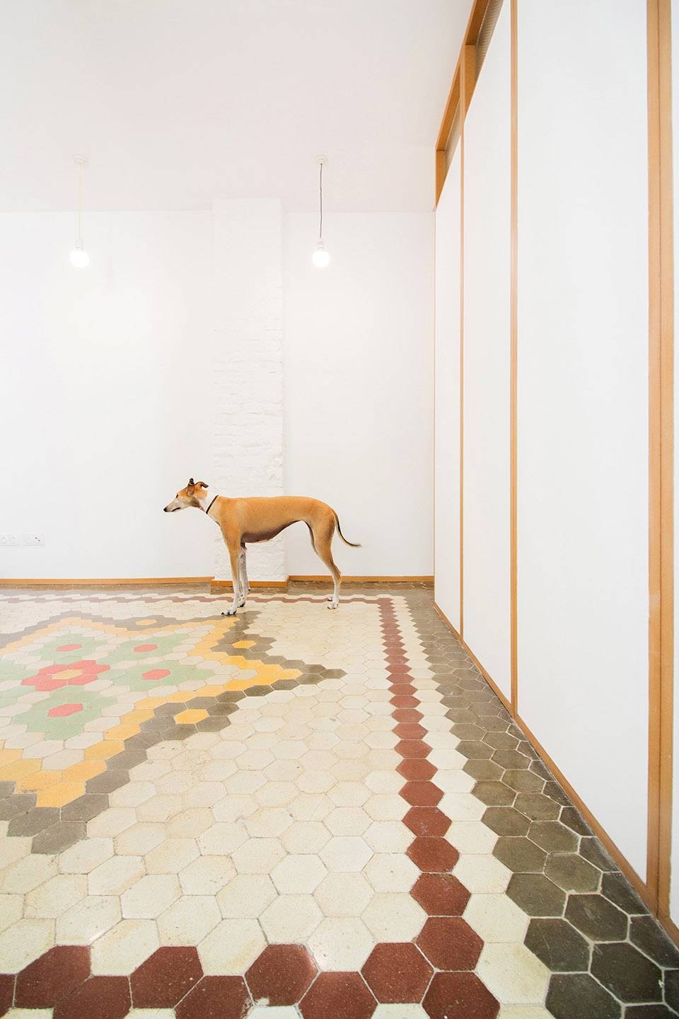 ▼原先液壓式六角形馬賽克磚地板的修復(fù)區(qū),有著豐富的色彩和幾何圖案
