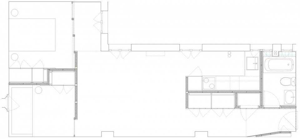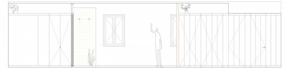 因此,本項(xiàng)目的設(shè)計(jì)重點(diǎn)便集中在兩片相對(duì)的墻體上。為此,建筑師采用40毫米厚的MDF板作為骨架,在其中填充金屬輪廓線和石膏板,打造這兩片相對(duì)的室內(nèi)墻體。這種設(shè)計(jì)處理旨在強(qiáng)調(diào)隔墻作為非正式家具在室內(nèi)空間中的作用,從而在這個(gè)簡(jiǎn)單的經(jīng)濟(jì)性居住空間內(nèi)通過(guò)隔墻來(lái)完成空間的劃分,這也呼應(yīng)了原始空間的布局干預(yù)手段。