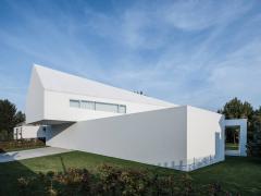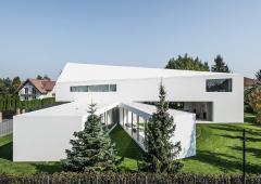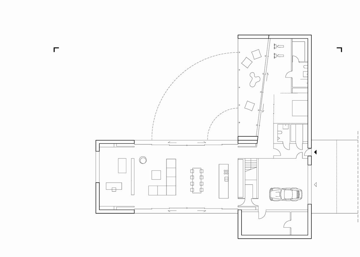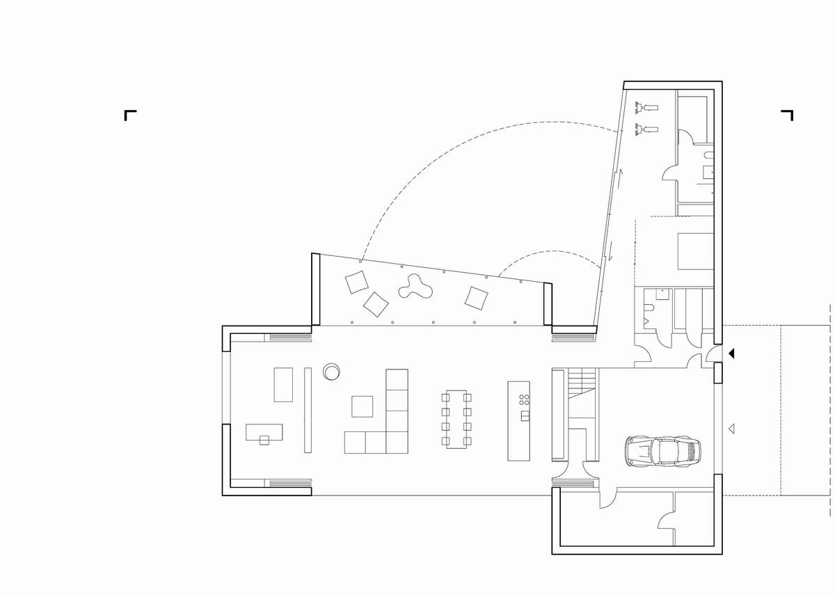 然后我們將底層的一部分旋轉(zhuǎn),以便在靠近道路的一側(cè)獲得盡可能多的私密空間。被“切割”的空間包含起居室和屋頂層,并向花園打開。在Living Garden House中可以找到類似的策略,即夜間活動區(qū)域在地板上,而日間區(qū)域成為花園的一部分。建筑與景觀之間的界限被模糊化了。