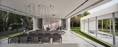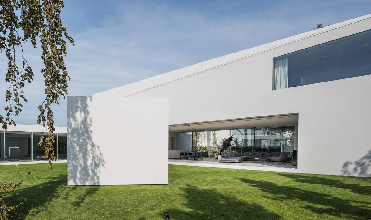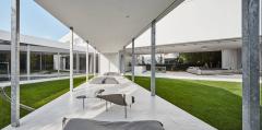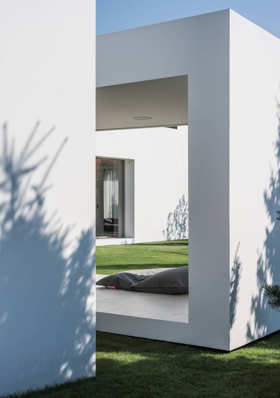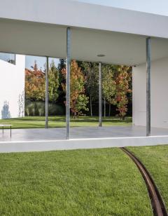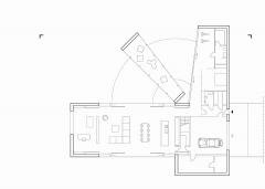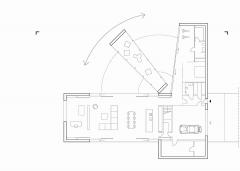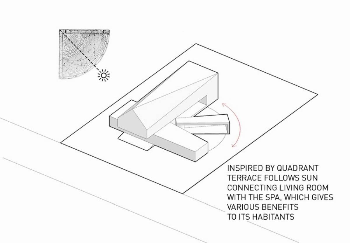 起居室和SPA區(qū)域相互垂直,位于花園中。業(yè)主希望房子能夠?qū)μ柕奈恢米鞒龌貞?yīng),因此我們借用了象限儀(一種用來確定星辰位置的古老設(shè)備)的形式。我們設(shè)計了一個對太陽做出回應(yīng)并跟隨其運動的露臺:住戶可以坐在它的影子下,愉快地吹風; 在一年中的不同時間,它能夠調(diào)節(jié)相鄰空間中的陽光量:在夏天提供遮陽,在冬天使得更多的陽光進入室內(nèi)。