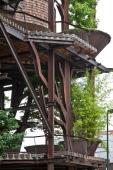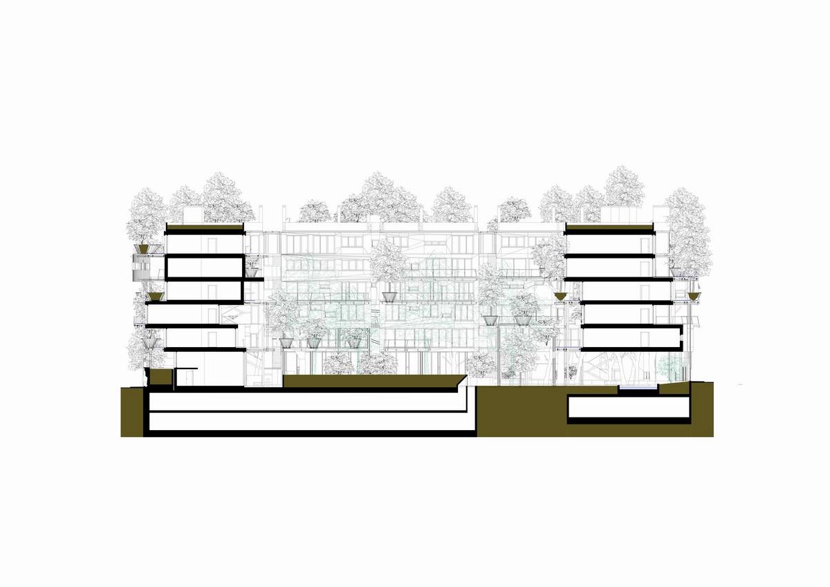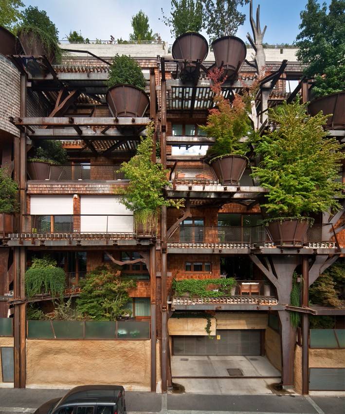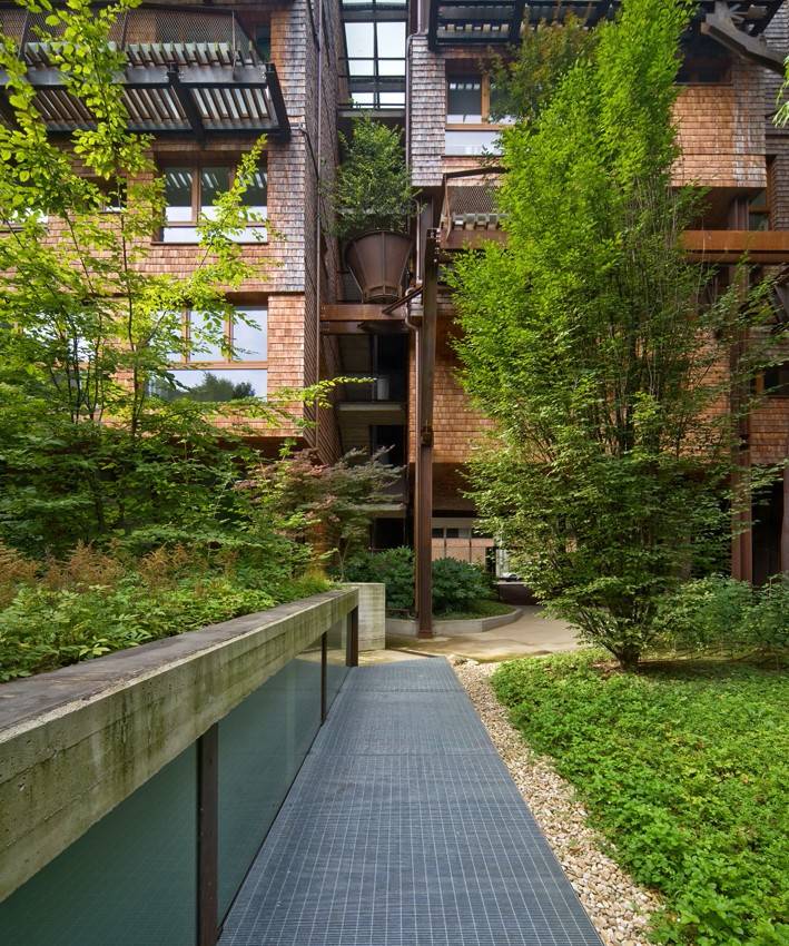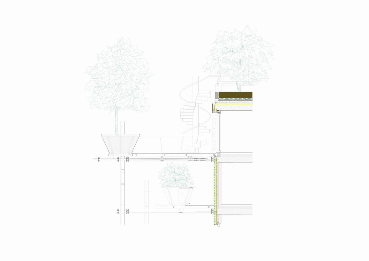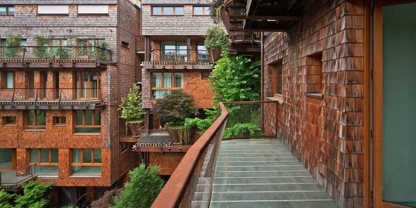陽臺(tái)上的實(shí)心木條在夏季將陽光過濾,在冬季又轉(zhuǎn)而將縷縷陽光引入室內(nèi)。落葉松木瓦壁板是一種較柔軟且有活力的表面。樹形的鋼結(jié)構(gòu)從整棟大樓的底層向著屋頂“生長”,托起每層陽臺(tái)的木板。這些鐵紅色大樹和陽臺(tái)上高高低低的綠植纏繞著,呼應(yīng)著,使得這棟大樓的外立面獨(dú)具一格。