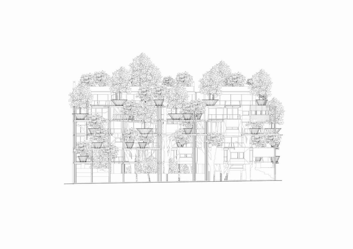 這棟大樓的獨(dú)特之處在于它是鮮活的。150顆樹被分別植入陽臺(tái)上高高的植物箱中,所以整棟大樓也隨之茁壯成長著,呼吸著,變化著。此外,庭院內(nèi)種有50顆大樹,它們制造氧氣,吸收二氧化碳,減少空氣污染,降低噪音,遵循自然的季節(jié)更替,一天天的成長,這便在整棟樓內(nèi)形成了完整的小氣候以減少夏季室溫太高和冬季太低的煩惱。
