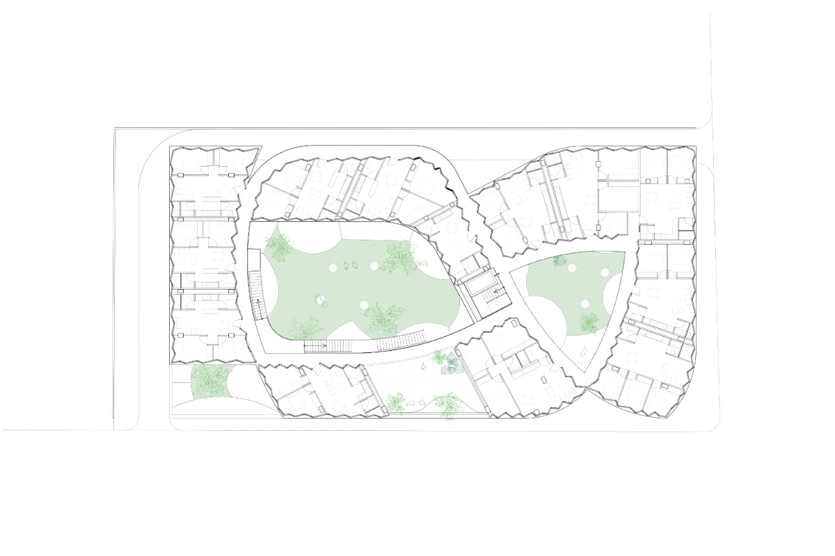 沿著外部走廊布置的單元面向庭院空間,并提供朝向附近的景觀。 重要的是,這些房屋提供自然的交叉通風(fēng),無(wú)需機(jī)械冷卻。 布局支持多代人的生活,為祖父母騰出空間,父母可以在父母上班的同時(shí)觀看孩子。 此外,沒(méi)有兩個(gè)單元彼此面對(duì),增強(qiáng)了隱私和所有權(quán)的感覺(jué)。