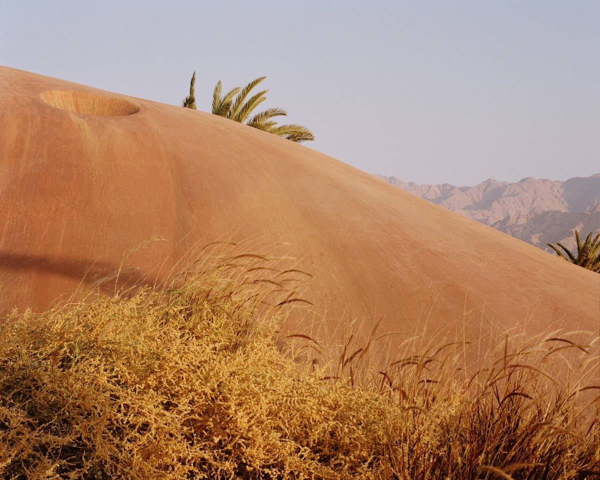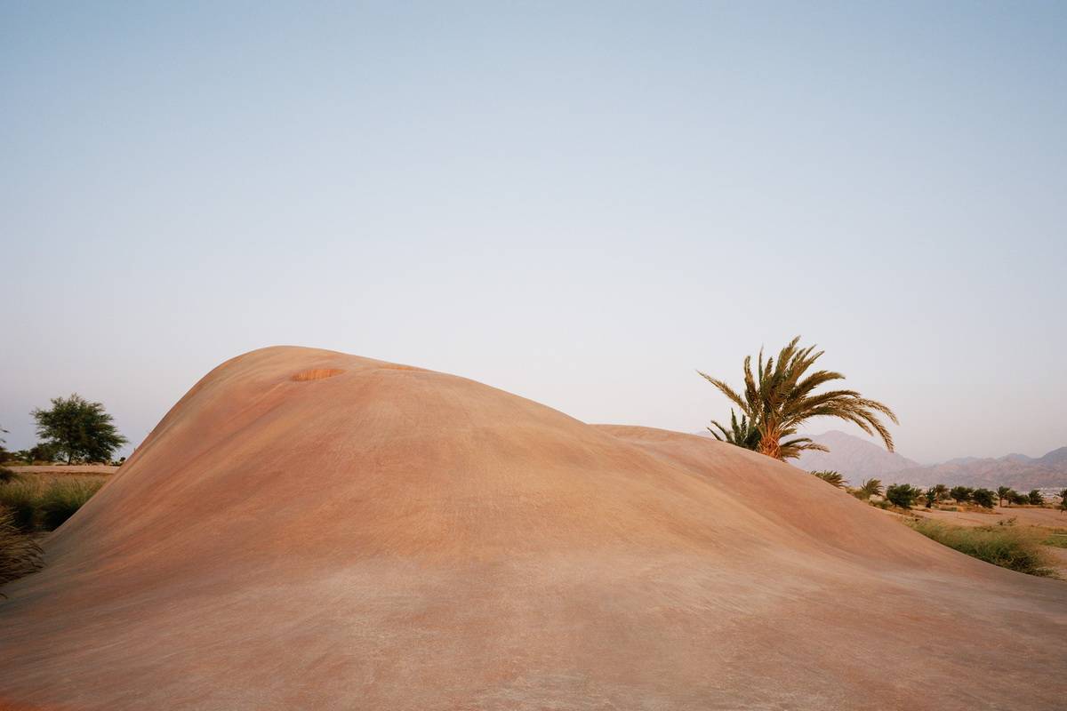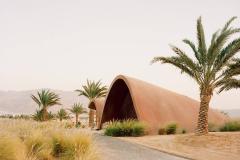 弧形的噴漿混凝土外殼與沙丘融為一體,打破了墻壁和天花板的傳統(tǒng)形式。弧形的開(kāi)口讓人們一覽高爾夫球場(chǎng)以及色彩斑斕的亞喀巴山脈的美景。陽(yáng)光透過(guò)穿孔的耐候鋼屏墻,該設(shè)計(jì)參考了傳統(tǒng)的阿拉伯風(fēng)格花窗(Mashrabiya),在引入自然光的同時(shí)又保證內(nèi)部空間的私密性。受到約旦圖案啟發(fā),屏墻上采用三角形開(kāi)口,而周圍山脈的色調(diào)與噴漿混凝土和金屬粗獷的顏色相呼應(yīng)。