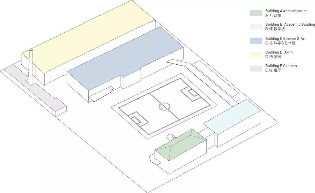傳統(tǒng)與現(xiàn)代、西方與東方的有機(jī)結(jié)合,是整個(gè)校室內(nèi)空間的核心。我們提取兩者的精華,盡可能利最自然的材料以及保證充足的采光,建立起能夠讓學(xué)生精神層面自由生長(zhǎng)的環(huán)境, 在占地面積并不大的基地空間中,利用建筑之間的空間,布局了若干處室外公共空間,給予學(xué)生們?cè)诮淌抑獬浞纸涣骰顒?dòng)的場(chǎng)所。