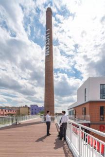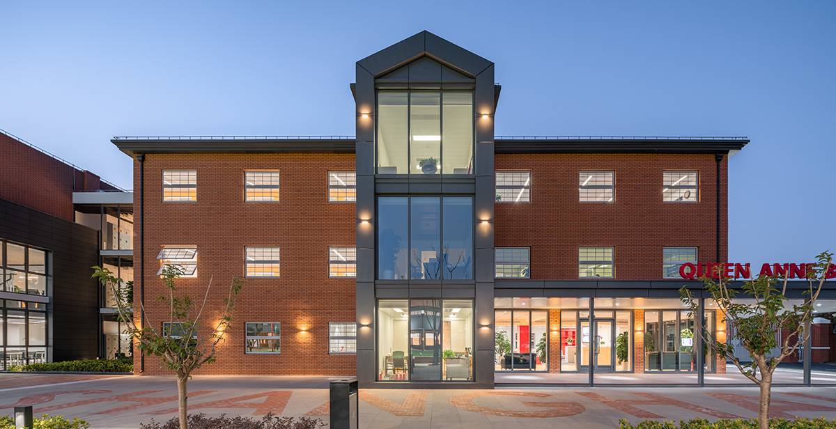 英國(guó)的萊克頓學(xué)校是安妮皇后式巴洛克風(fēng)格建筑, 在上海萊克頓A棟行政大樓的外立面設(shè)計(jì)中,我們將繁復(fù)的山墻雕飾簡(jiǎn)化為更具有視覺(jué)沖擊力的坡屋頂,借以向傳統(tǒng)致敬,同時(shí)把功能空間豎向排布在主體中間,以裸露的灰色鋼結(jié)構(gòu)和通透的玻璃強(qiáng)調(diào)空間的公共屬性,并借此打破厚重的紅磚墻面,實(shí)現(xiàn)新與舊的對(duì)話。