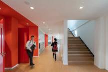 在C棟的科學(xué)藝術(shù)樓上,我們把貫穿整個(gè)樓的主樓梯作為一個(gè)box放置在主體中間,利用灰色鋼結(jié)構(gòu)和通透的玻璃面把交通空間作為整個(gè)樓的亮點(diǎn)。學(xué)生可以直接從空間里眺望操場(chǎng)上的活動(dòng)。在晚間,明亮燈光透出整棟樓點(diǎn)亮整個(gè)校園。