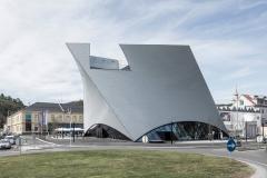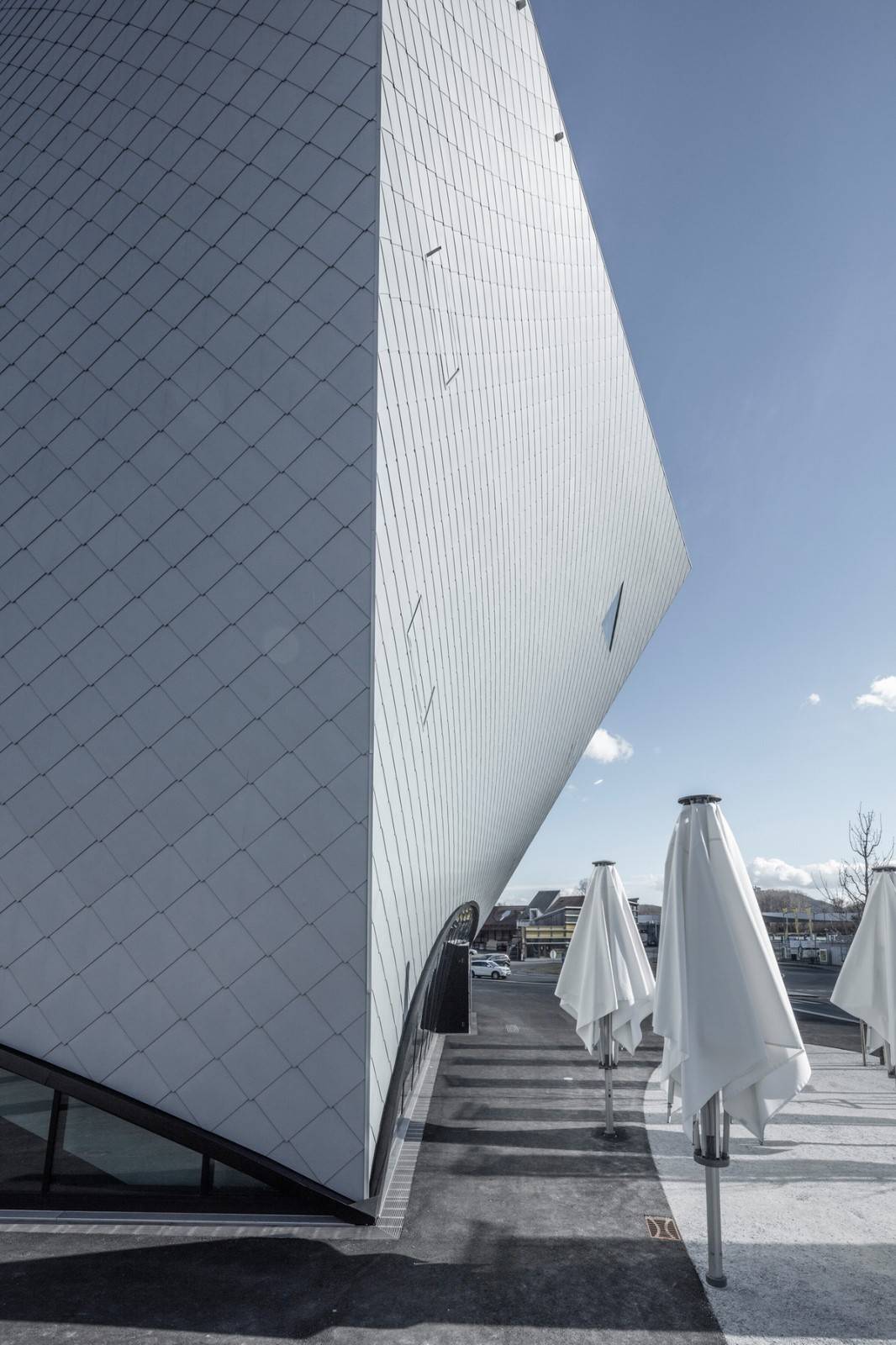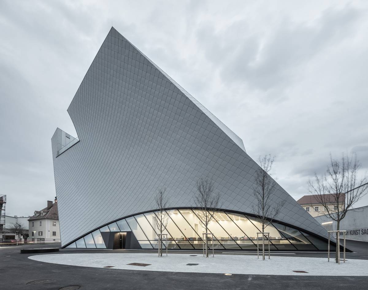 與阿道夫·克里斯蒂尼茨(Adolf Krischanitz)以前的煙草工廠簡(jiǎn)樸的藝術(shù)館以及旁邊由古斯塔夫·佩克爾(Gustav Peichl)設(shè)計(jì)的漫畫博物館有趣的鋸齒形屋頂相比,這座獨(dú)立的州立美術(shù)館建筑明確地表現(xiàn)出了它的藝術(shù)特點(diǎn),并以一種引人注目的方式與它所處的位置巧妙的結(jié)合起來。該建筑的結(jié)構(gòu)與其說是建筑,不如說是一座雕塑,為讓游客更好地欣賞,它不斷改變自己的表現(xiàn)形式和形狀,它沒有按比例繪制,而是選擇了力量相互作用的具體表現(xiàn)。圍繞建筑西北軸線的扭轉(zhuǎn)產(chǎn)生了大量的超拋物面。
