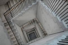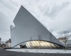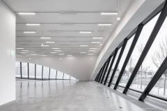 從其它方面來看,這座可塑型結(jié)構(gòu)從外面看就像是一座封閉的建筑。由菱形啞光鋅板材料組成的外觀鱗甲結(jié)構(gòu)將這個(gè)“四條腿”的混凝土巨人變成了一個(gè)帶著騎士盔甲的犰狳。在室內(nèi),兩個(gè)混凝土塔構(gòu)成了建筑的垂直元素,既是一個(gè)參考點(diǎn),也可以協(xié)助引導(dǎo)方向,還有一個(gè)埃舍爾式的樓梯。兩個(gè)消防樓梯形成了一個(gè)DNA螺旋結(jié)構(gòu),它既引導(dǎo)了觀眾,也迷惑了觀眾。由于外墻的強(qiáng)大扭曲造型,讓每一層都有它們自己獨(dú)特的布局。