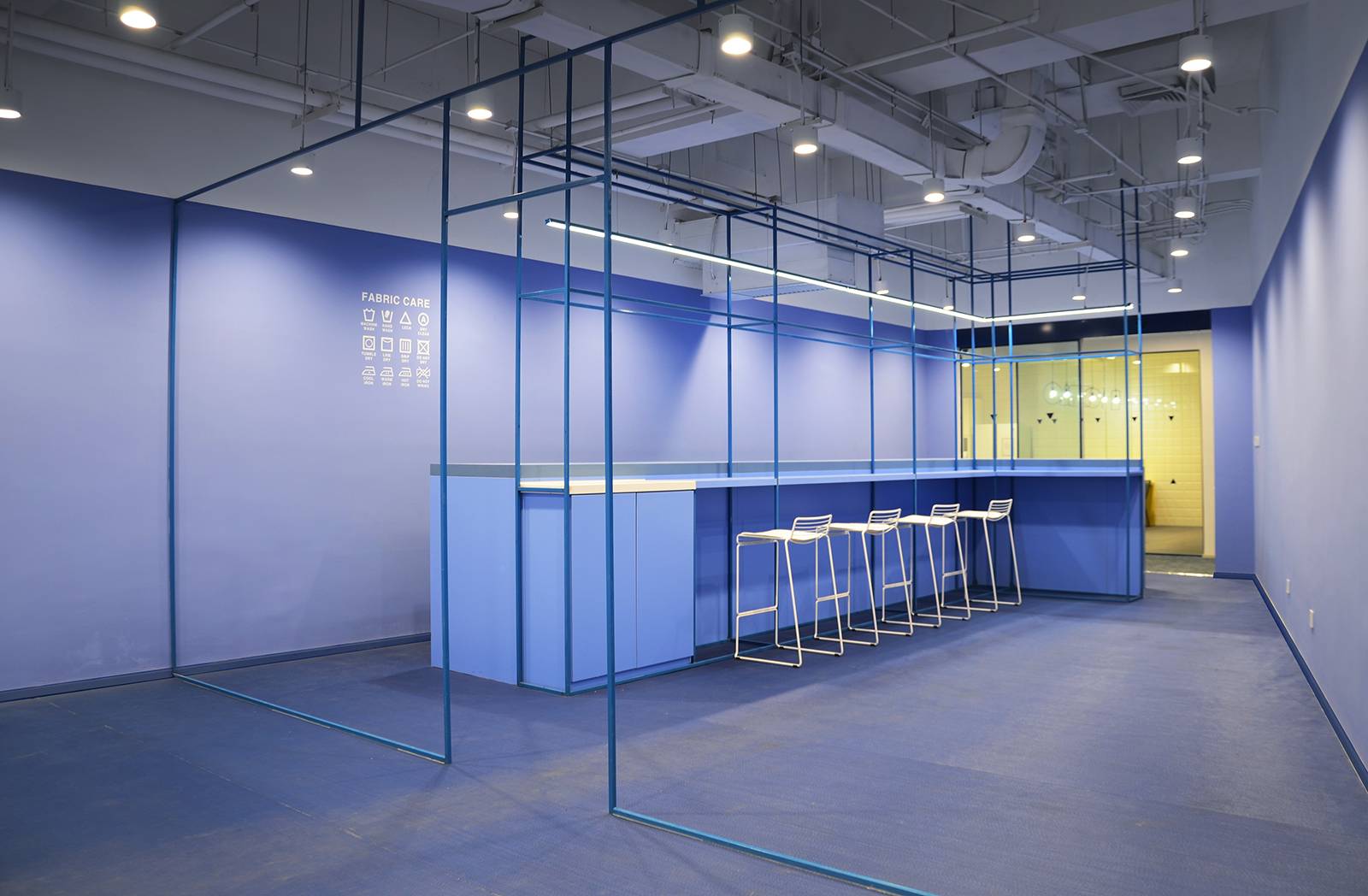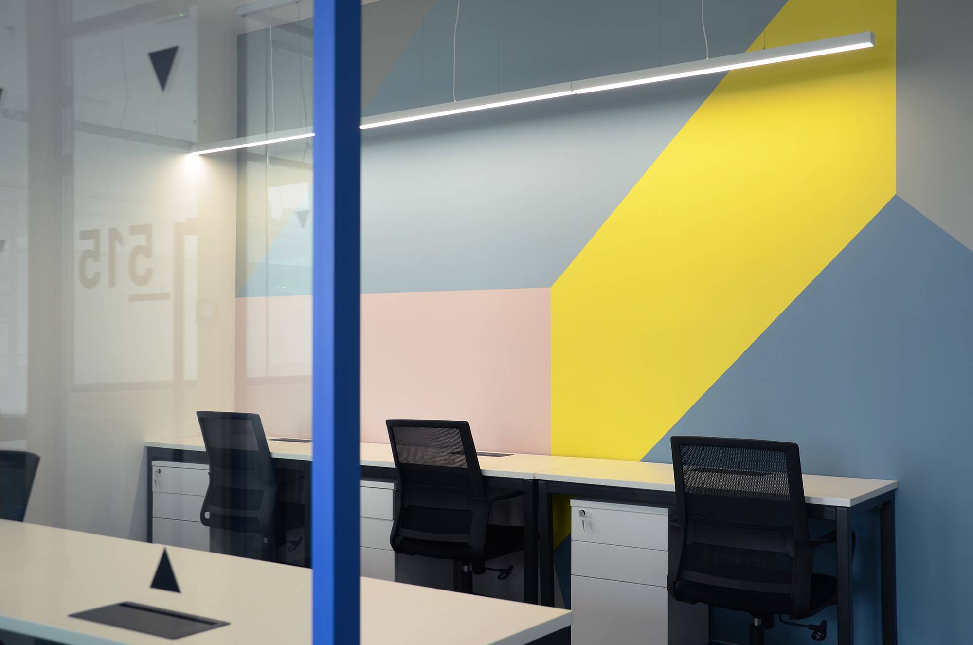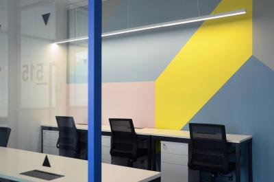 空間中的設(shè)計語言以彩色的線性元素貫穿始終,滿足功能性的同時達到視覺統(tǒng)一的效果。簡化設(shè)計使整個空間仿佛形成一個白色畫布,再配以明快的彩色線條,從隔斷到墻面圖案,如同跳動的音符躍然紙上,增強了空間的立體感和活力氛圍,元素的重復(fù)使用打造了具有記憶點和活力氛圍的共享空間環(huán)境。