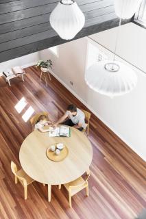 首層是個(gè)連續(xù)的開放平面布局空間,將房屋中不同區(qū)域的活動(dòng)聯(lián)系起來,同時(shí)又不使其相互干擾。懸空的小屋形成了后方的露臺(tái),劃分出了家庭聚會(huì)冗余空間以及休閑活動(dòng)空間。