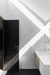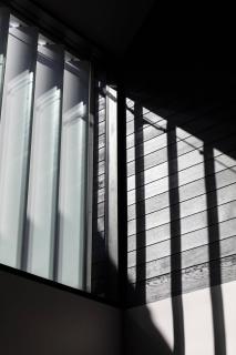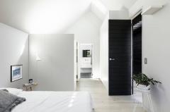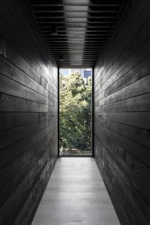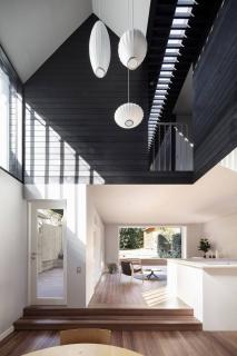 該項(xiàng)目將從前密閉少光的家庭變?yōu)橐粭澴匀还獬渥愕拈_放式布局的家庭起居空間。巨大的空腔和北向的引入強(qiáng)烈自然光的高窗被引入建筑內(nèi)部。光線被黑色的雪松木墻削弱變?nèi)岷?,形成了下方舒適的集會(huì)空間。