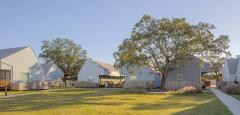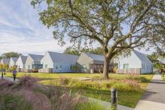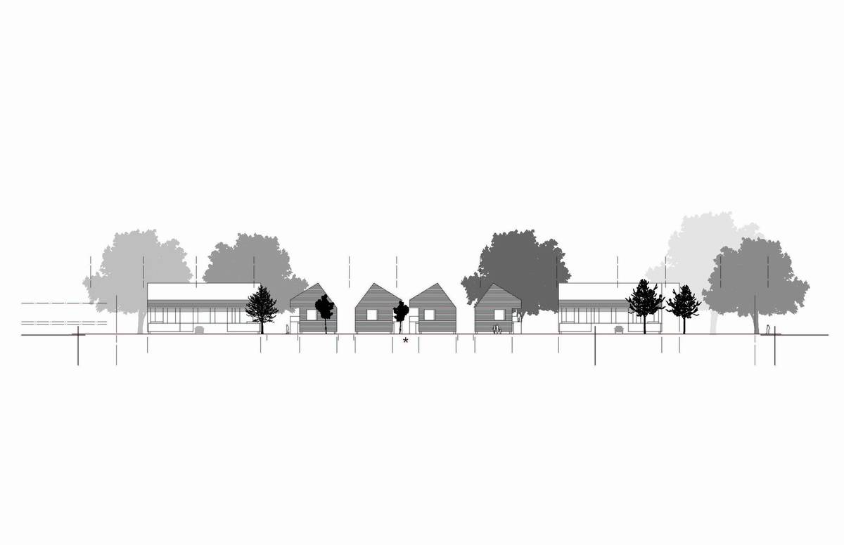 在住房規(guī)模上,基本單元兩兩配對(duì):每棟住宅由兩個(gè)連接的單元組成,并且面向另一棟住宅,有效地創(chuàng)建了一個(gè)由四個(gè)鄰居共享的開放式庭院,確保居民之間形成積極的社交網(wǎng)絡(luò)。每個(gè)組團(tuán)被安插在原有橡樹之間,通過較大的中央庭院聯(lián)系,將居民與社區(qū)連接起來,同時(shí)仍與周圍社區(qū)保持開放的關(guān)系。