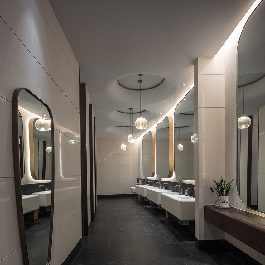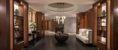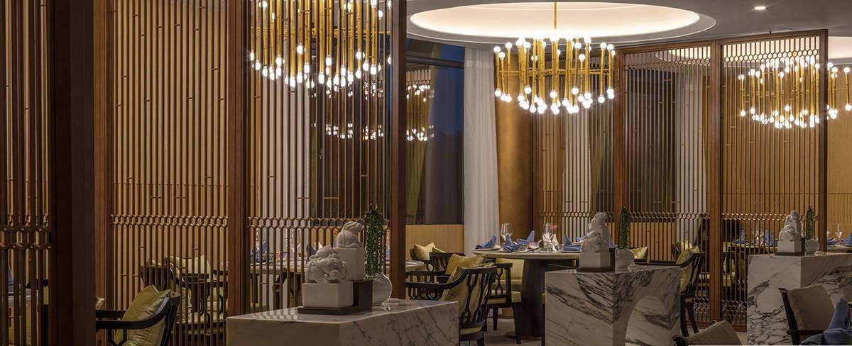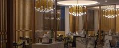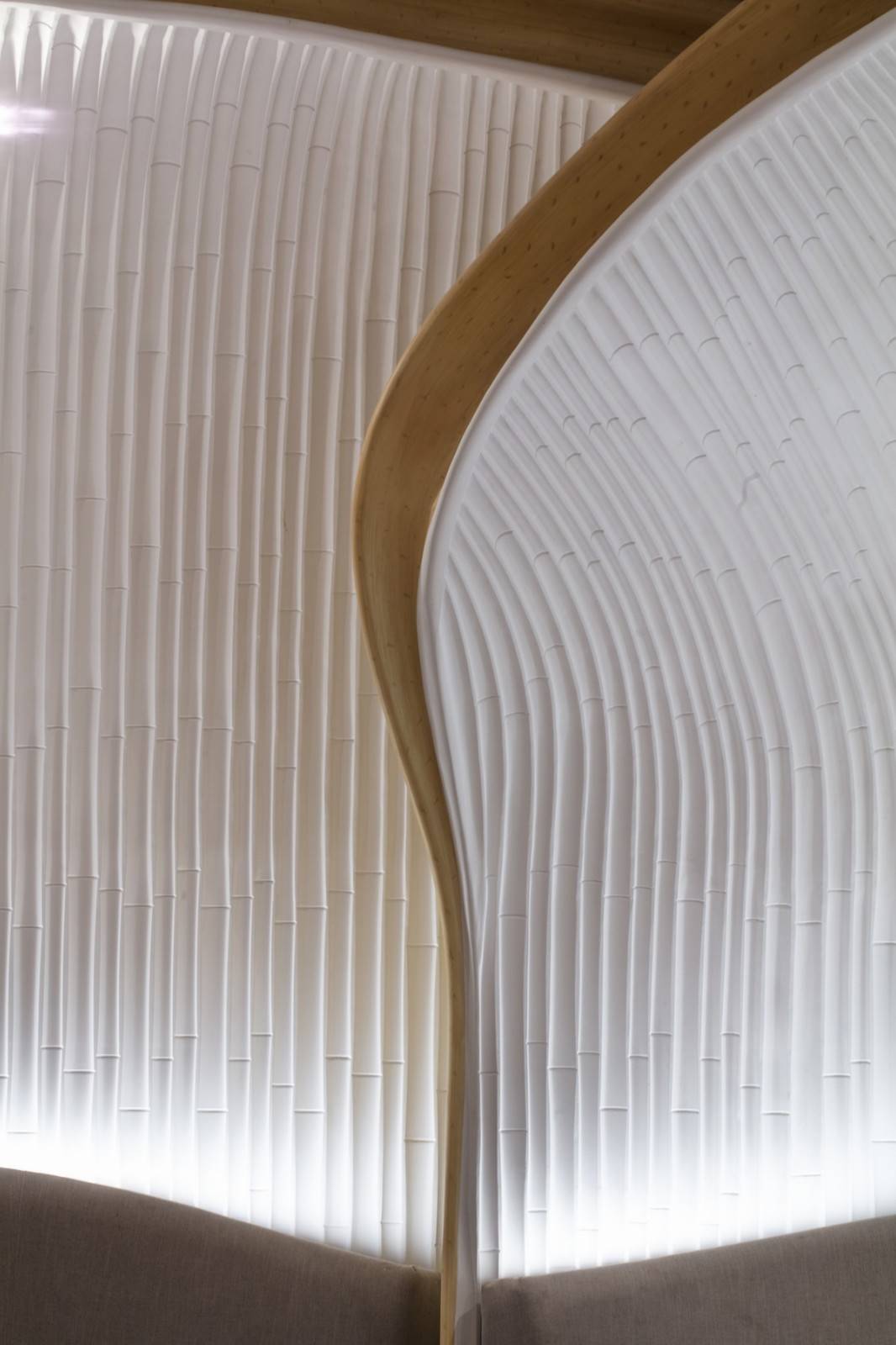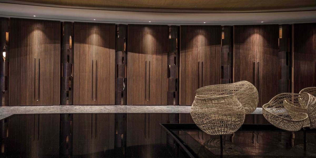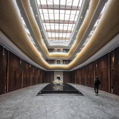 遵循總體設(shè)計DNA,宴會廳和大堂茶室靈感來自于莫干山周邊地區(qū)的原生茶花。在茶室,黃芽茶花花瓣被擴大重新詮釋為屏風(fēng)為客人提供半開放的私密空間,在宴會廳黃芽茶花化身為天花及墻身造型,形成強烈的視覺沖擊感,并與現(xiàn)代化水晶吊燈形成一體,創(chuàng)建壯觀及精致優(yōu)雅的氣氛,影音設(shè)備及相關(guān)的機電設(shè)備被巧妙的隱藏于其中,配合著酒店進行各種場合的設(shè)定及使用。