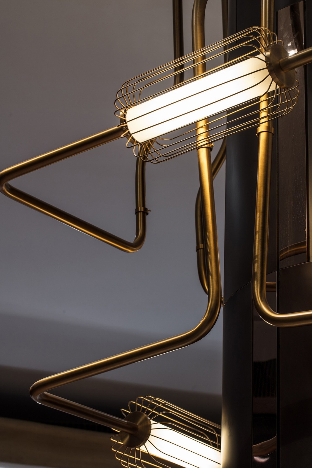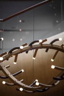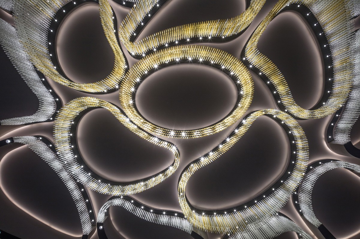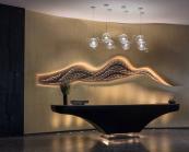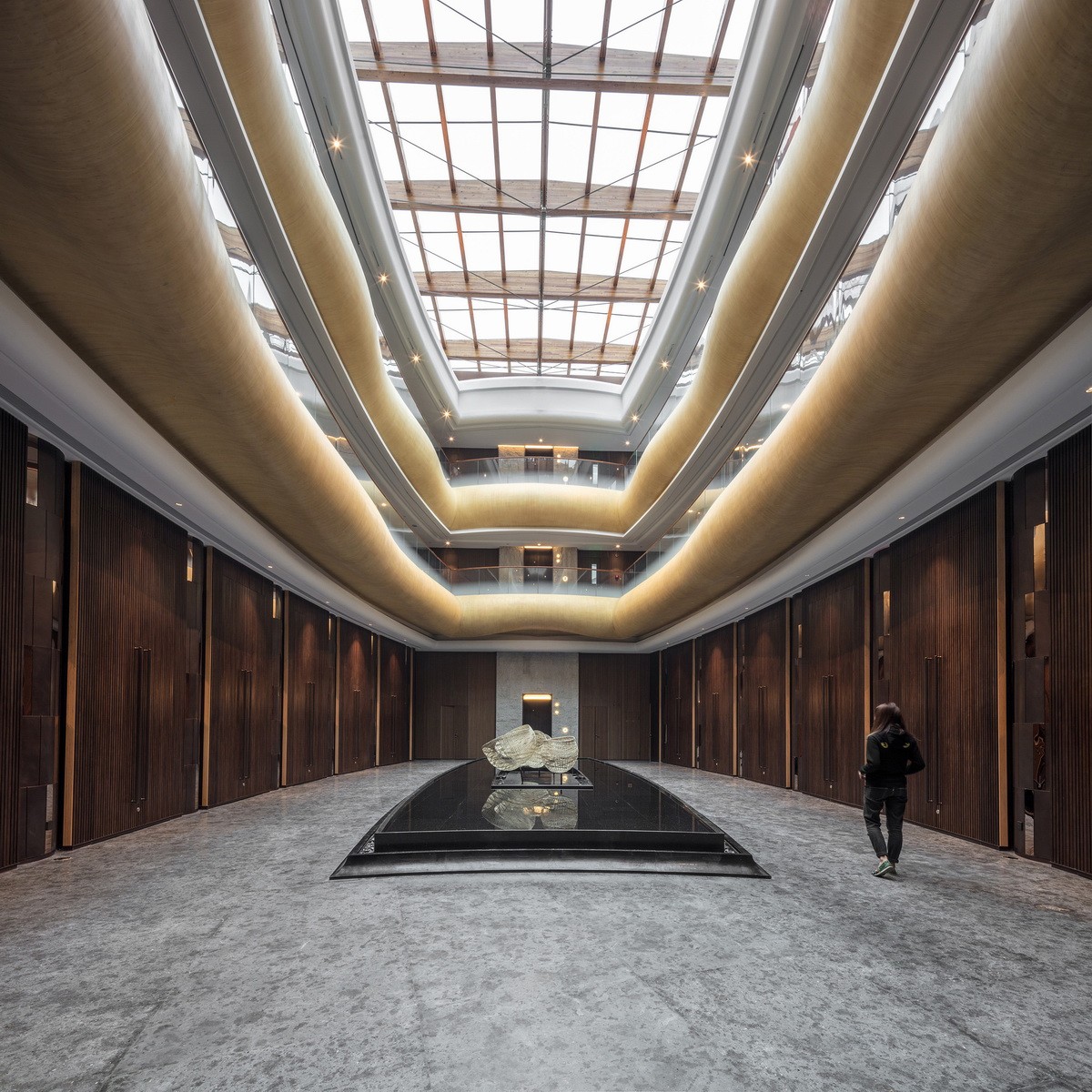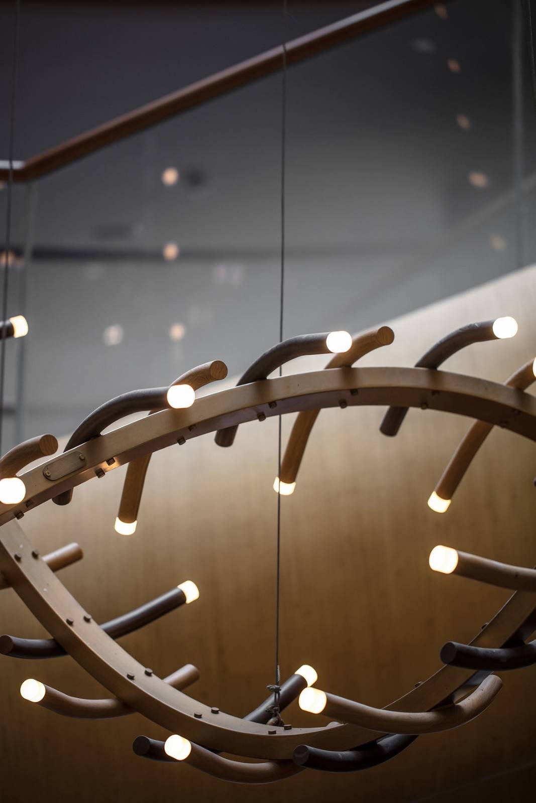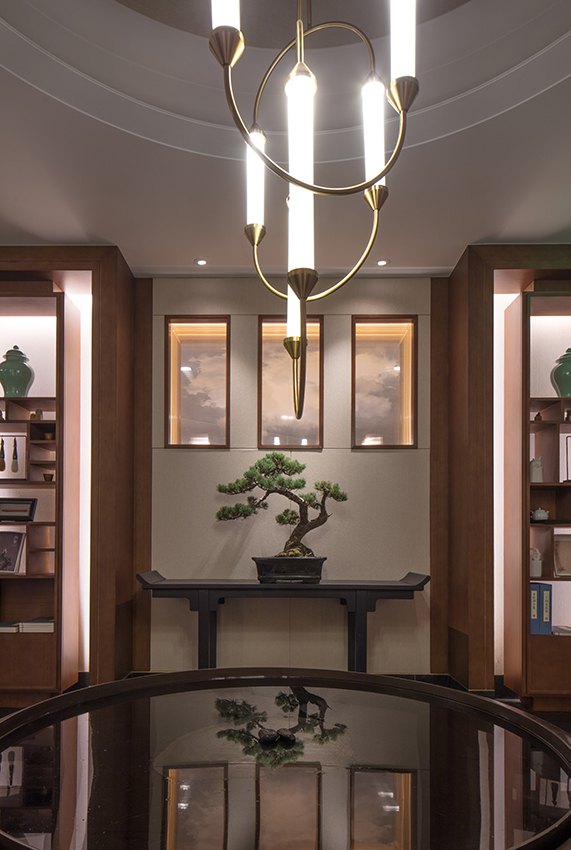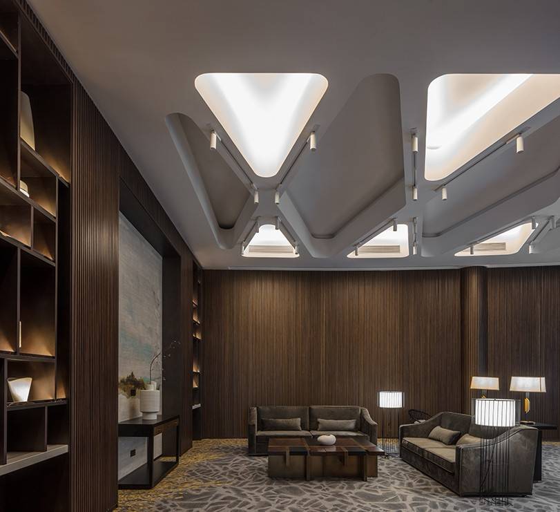 陽光通過建筑天窗投影至室內(nèi),和建筑形體構(gòu)成共鳴的定制特色四環(huán)竹鰭吊燈輝影著室內(nèi)空間。