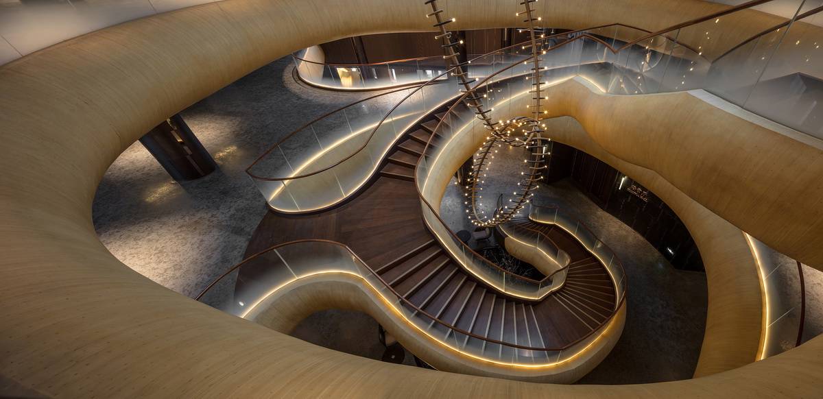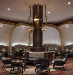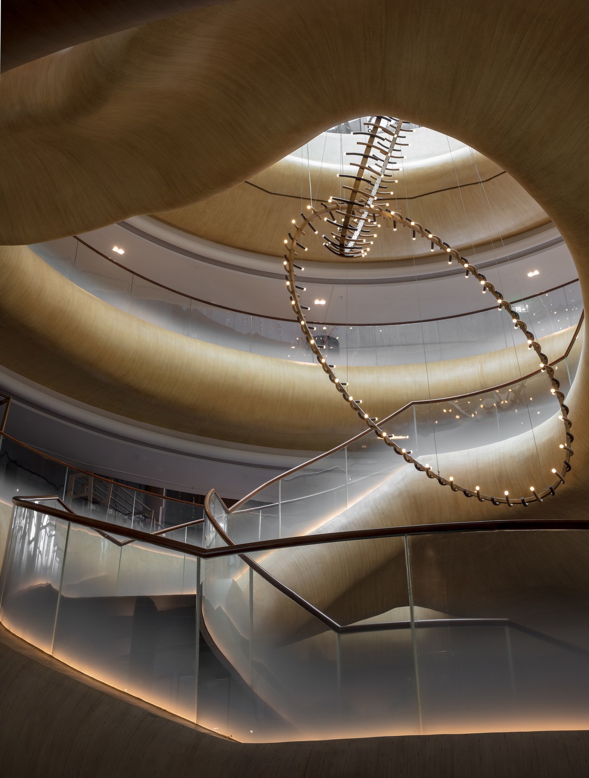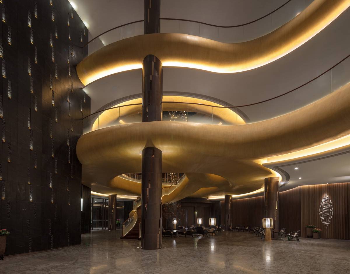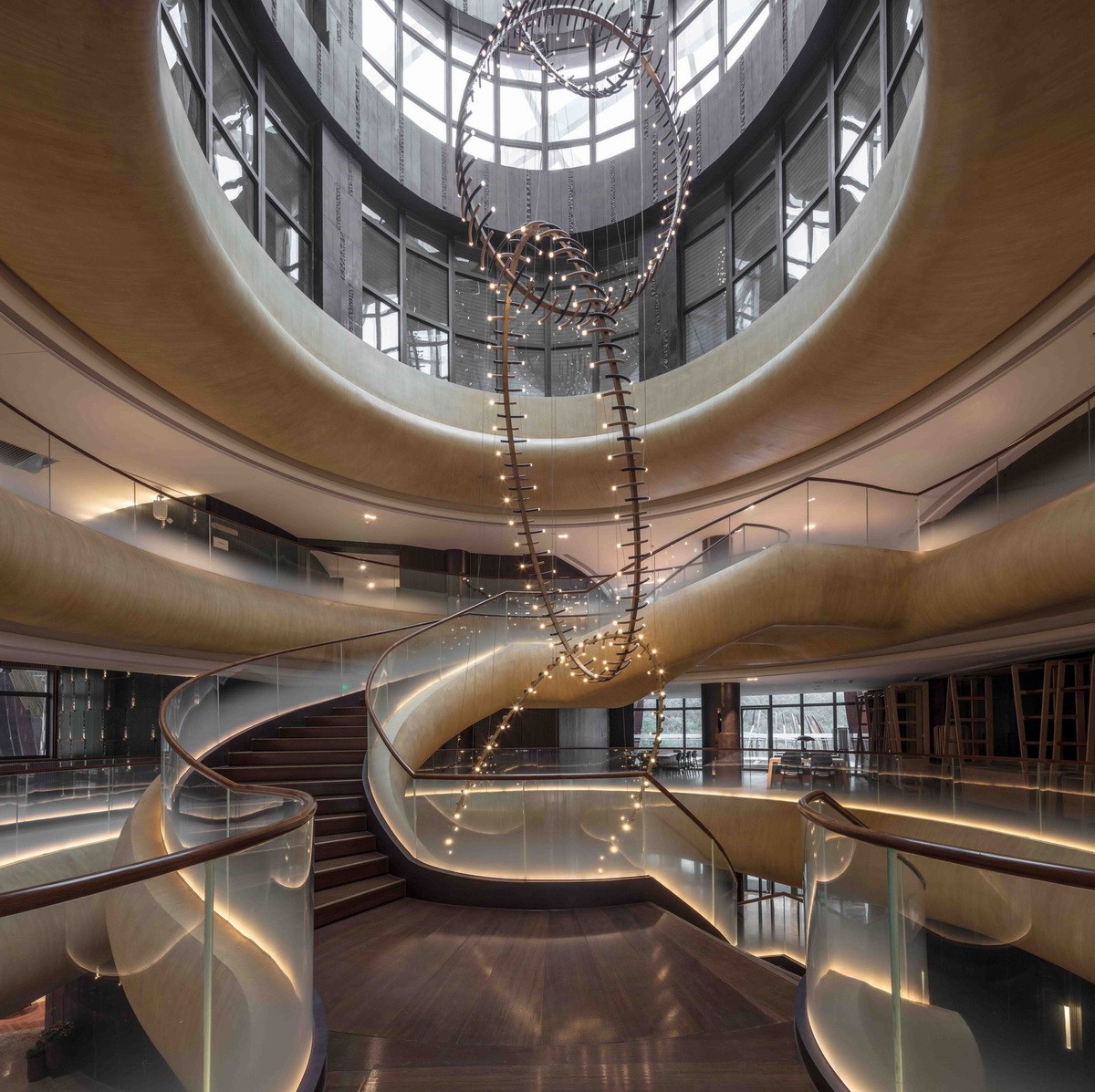 當(dāng)客人步入酒店大堂就會被一個戲劇性的“竹云”樓梯迎接,由燈光帶領(lǐng)下,他們可以像采茶農(nóng)慢慢攀至酒店各層的不同空間。