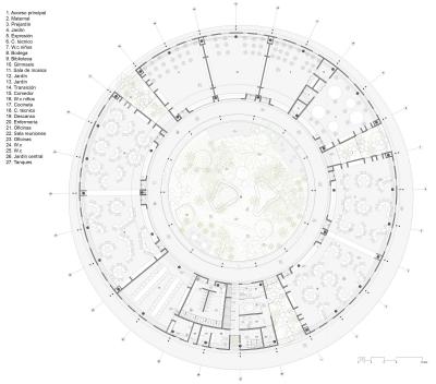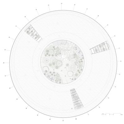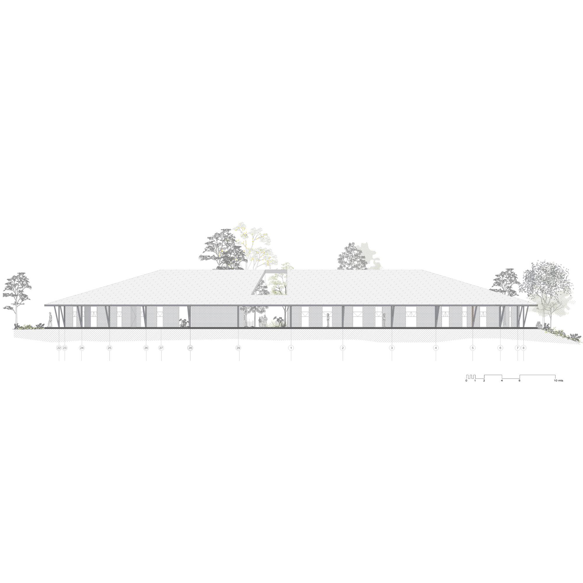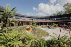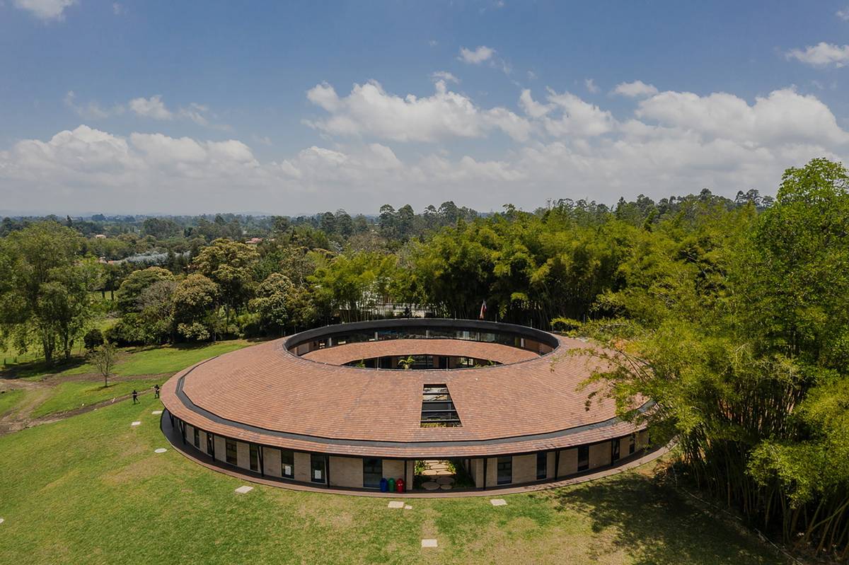 建筑師將教室安排在場(chǎng)地較高的區(qū)域,較低的平坦處則用于運(yùn)動(dòng)。每一棟教學(xué)樓都呈圓環(huán)形,中央則配有一個(gè)與四周相連的中心花園。建筑師用密閉的外部走廊將這兩部分串聯(lián)在一起,形成校園內(nèi)的一個(gè)單獨(dú)整體。整個(gè)項(xiàng)目是分階段進(jìn)行的,先根據(jù)實(shí)際所需進(jìn)行整體規(guī)劃上的調(diào)整擴(kuò)張,后進(jìn)行每棟圓形教學(xué)樓的定制設(shè)計(jì)。