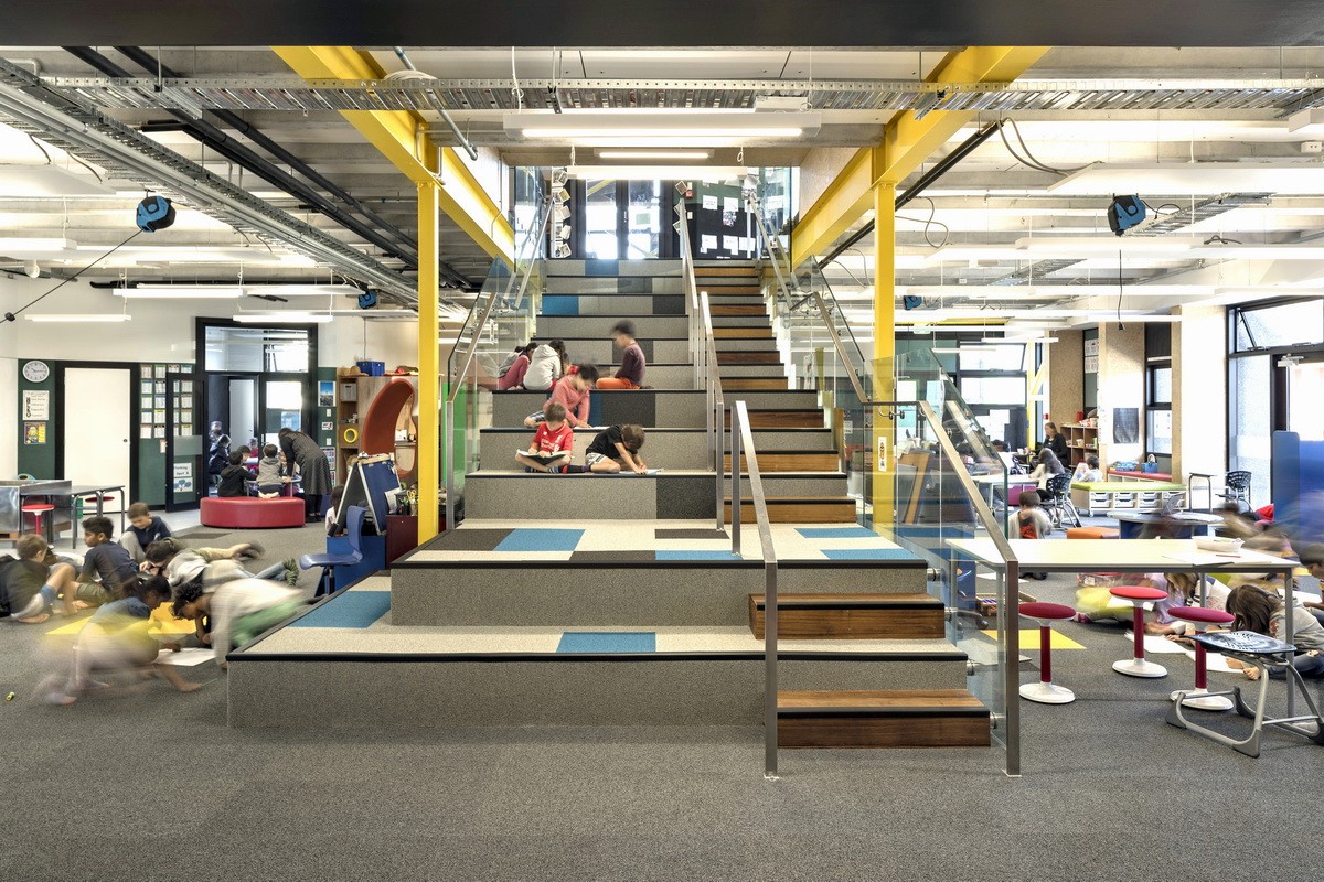 1960年代所建造到老校舍以及停車(chē)場(chǎng)設(shè)施被移走,使得一條路得以穿過(guò)新的入口雨蓬進(jìn)入向新的中心庭院所開(kāi)放的四棟新樓,這里非常適合進(jìn)行社交活動(dòng)和戶外學(xué)習(xí)活動(dòng)。建筑上充滿活力而豐富的顏色代表了社區(qū)中多種多樣的文化以及兒童們不同的種族背景。