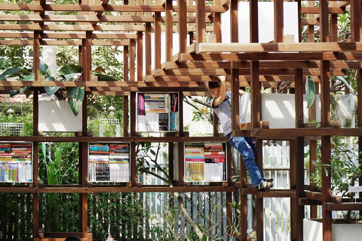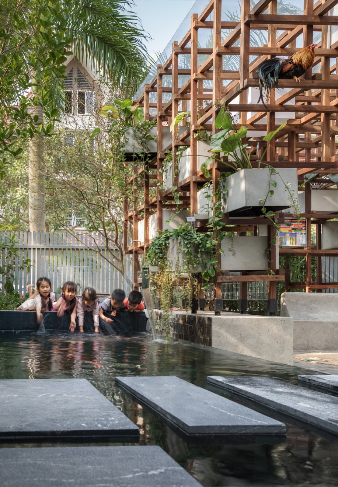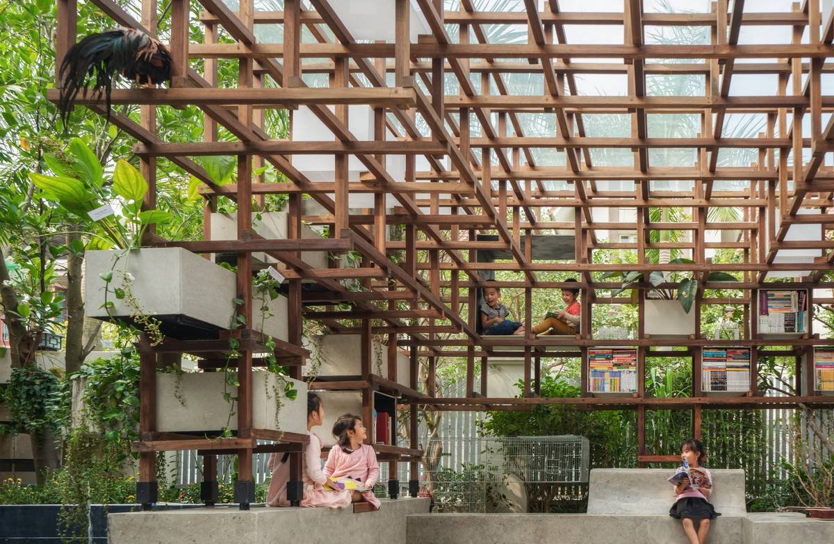VAC 圖書館使用一種源于木制框架的語言。這種技術(shù)形式有助于創(chuàng)建靈活和可適應(yīng)的結(jié)構(gòu)。這也是一個(gè)空間組織,劃分為不同的功能區(qū)域。VAC 圖書館也是面向兒童開放的圖書館空間。該地區(qū)和其他地方的孩子可以來這里一起玩耍,閱讀書籍,并在建筑中直觀地了解這個(gè)生態(tài)模型。孩子們會(huì)知道錦鯉不僅是觀賞寵物,還知道它們的排泄物將如何被帶到蔬菜種植機(jī)上,水如何被供應(yīng)到蔬菜上,然后過濾回池塘。在旁邊的籠子里養(yǎng)的雞會(huì)下蛋和吃飯,它們的糞便也有利于園藝。