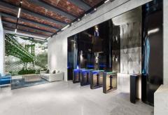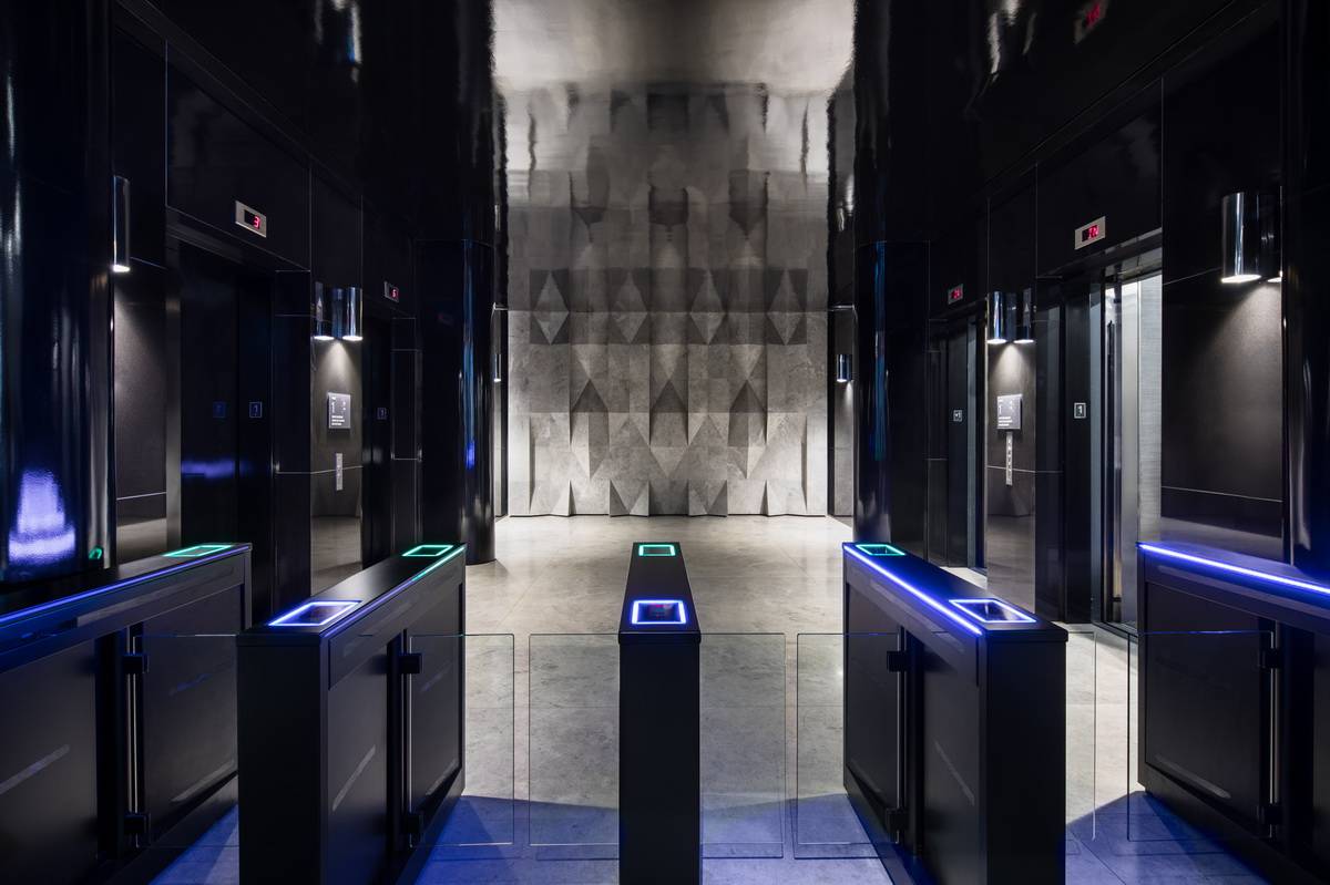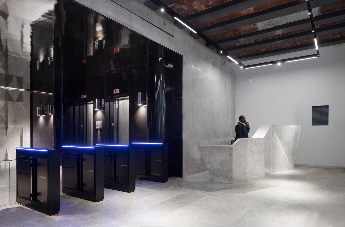 大堂里裝飾著藝術(shù)家 Andrew Antonaccio 用苔蘚制作的曼哈頓大橋藝術(shù)墻,面積約為366 x 396 厘米。電梯間有著一面約為518 x 396 厘米的混凝土背景墻,其圖案形似該建筑外立面的晶體結(jié)構(gòu)。