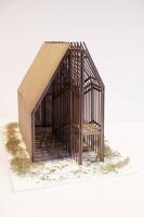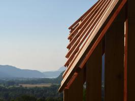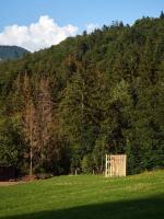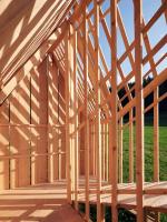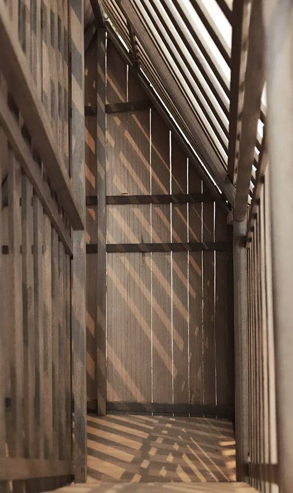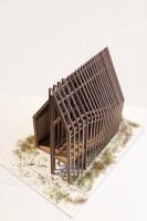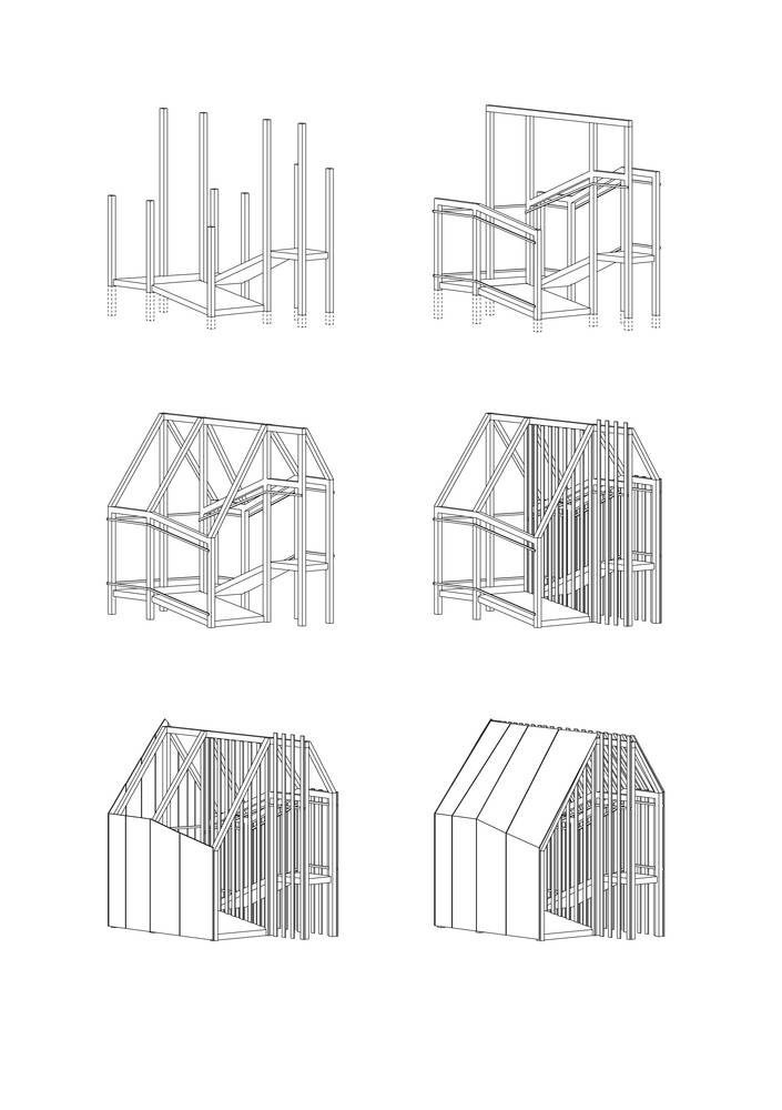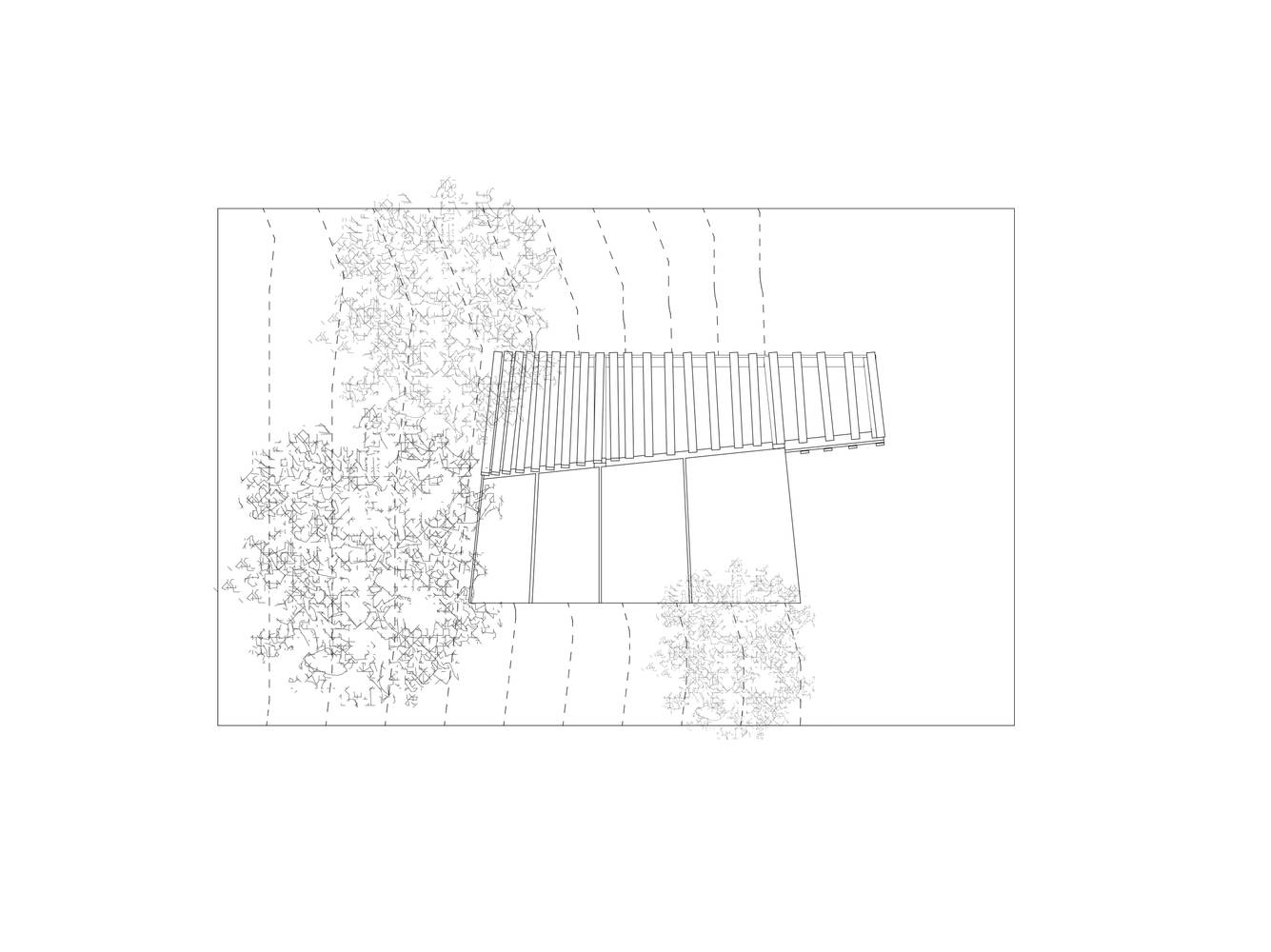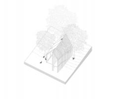 觀望臺開放式結(jié)構(gòu)繪制了一個微型的路線,將行人或者“觀望者”引導(dǎo)到一個小型高架平臺,明確地提供一個俯瞰附近景觀的平臺。這個路徑是經(jīng)過不同方向的學(xué)習(xí)和推演得來的,為了加強和整合這個場所和環(huán)境。輪椅和嬰兒車也能通行的通向這個平臺的緩坡,完善了現(xiàn)有場地的坡道帶來的不便。木板條過濾了日光,用一種明暗畫法的方式呼應(yīng)了森林和空地:游客從一個不透明的屋頂下進入這個觀望臺,適應(yīng)了黑暗環(huán)境之后,在走向觀望窗口的之前,就沐浴在了陽光中。