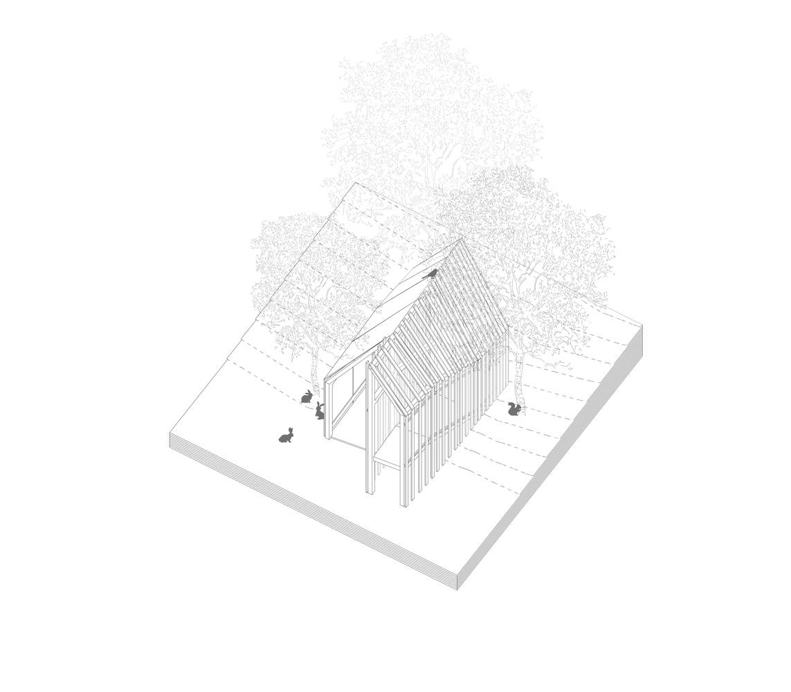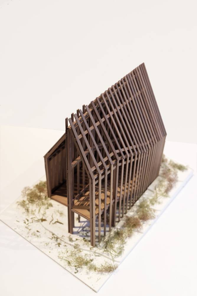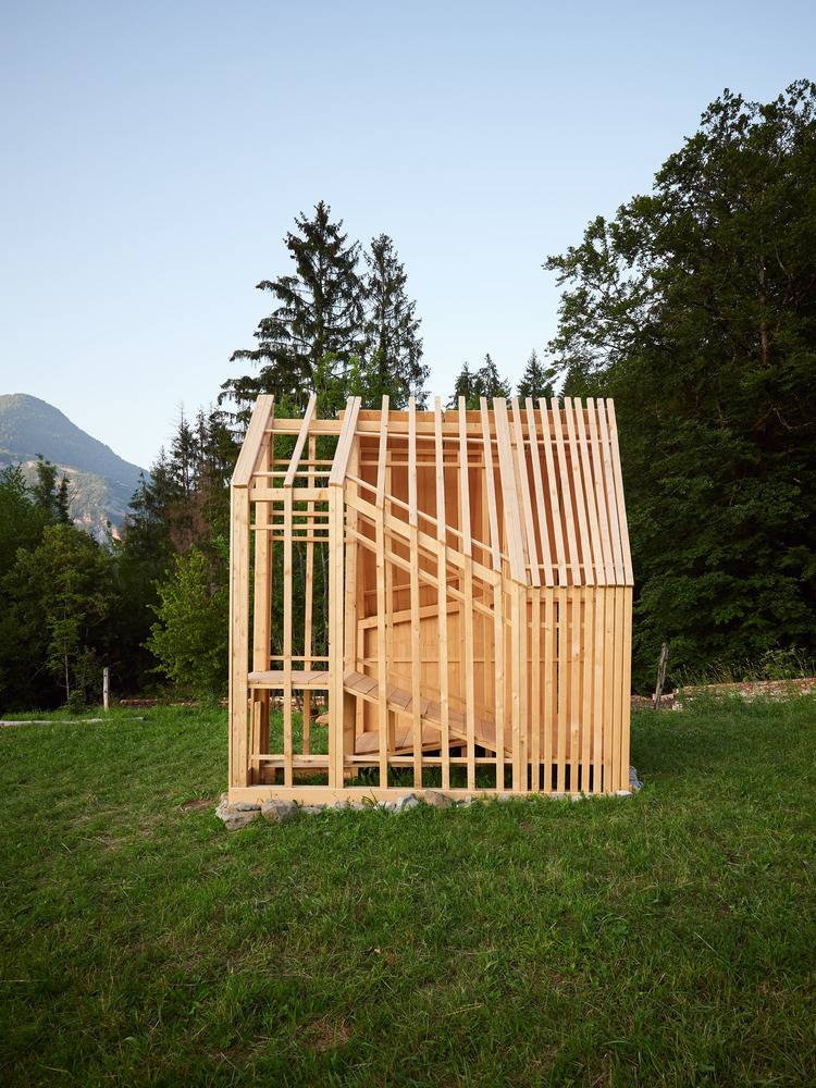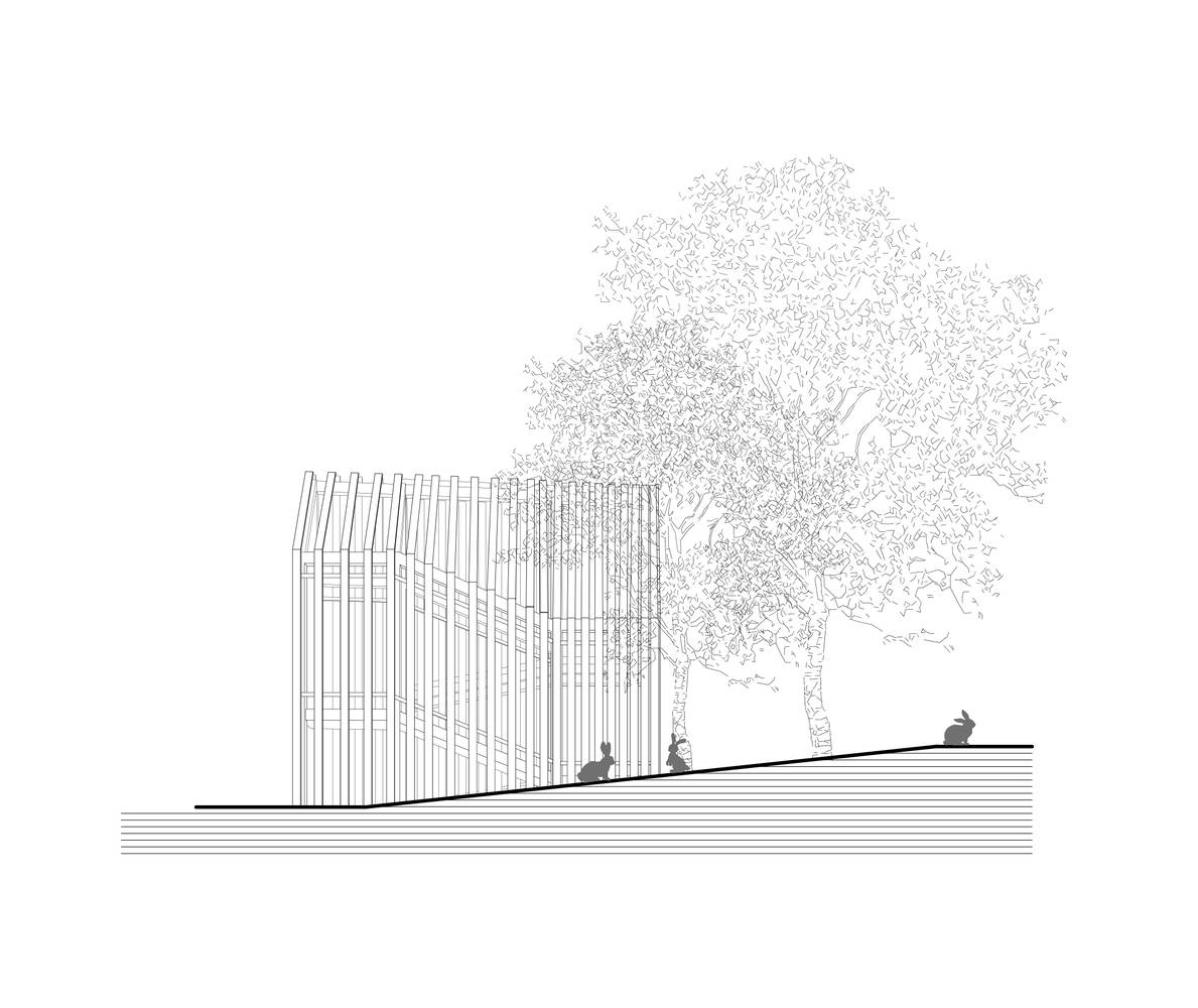 觀望臺有雙面屋頂以及柔和的比例,讓人想起傳統(tǒng)小木屋的樣子,只是通過圖形線條重新塑造。完美地和周圍自然環(huán)境融合,這個小木屋不僅僅讓人能夠觀察到附近動植物,同時也能參與到當?shù)氐纳鷳B(tài)系統(tǒng)中,多虧其多孔的設(shè)計,滲透到一些能在這兒找到棲身之地的植物和物種中。