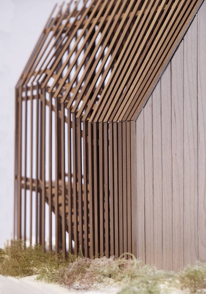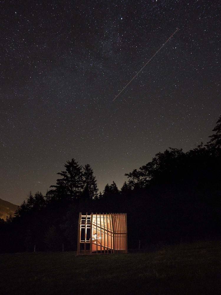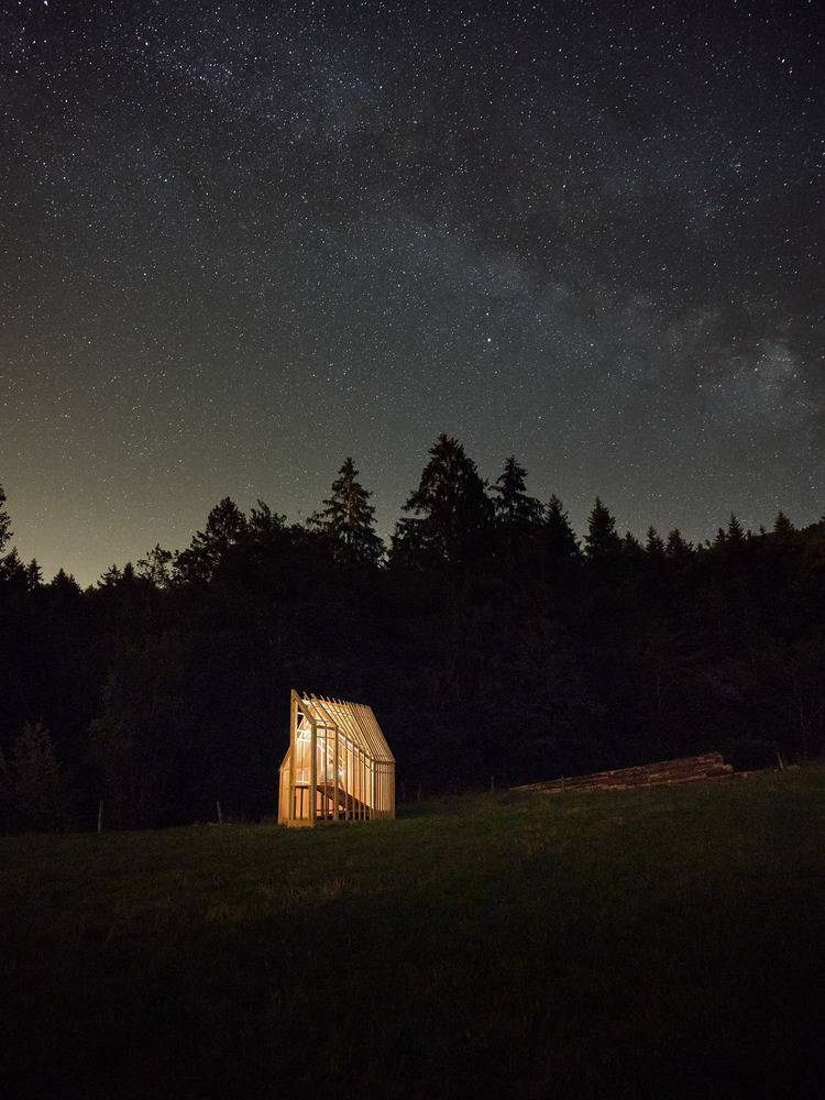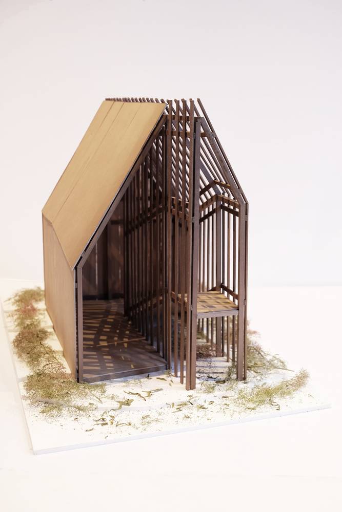 觀望臺有雙面屋頂以及柔和的比例,讓人想起傳統(tǒng)小木屋的樣子,只是通過圖形線條重新塑造。完美地和周圍自然環(huán)境融合,這個小木屋不僅僅讓人能夠觀察到附近動植物,同時也能參與到當?shù)氐纳鷳B(tài)系統(tǒng)中,多虧其多孔的設(shè)計,滲透到一些能在這兒找到棲身之地的植物和物種中。