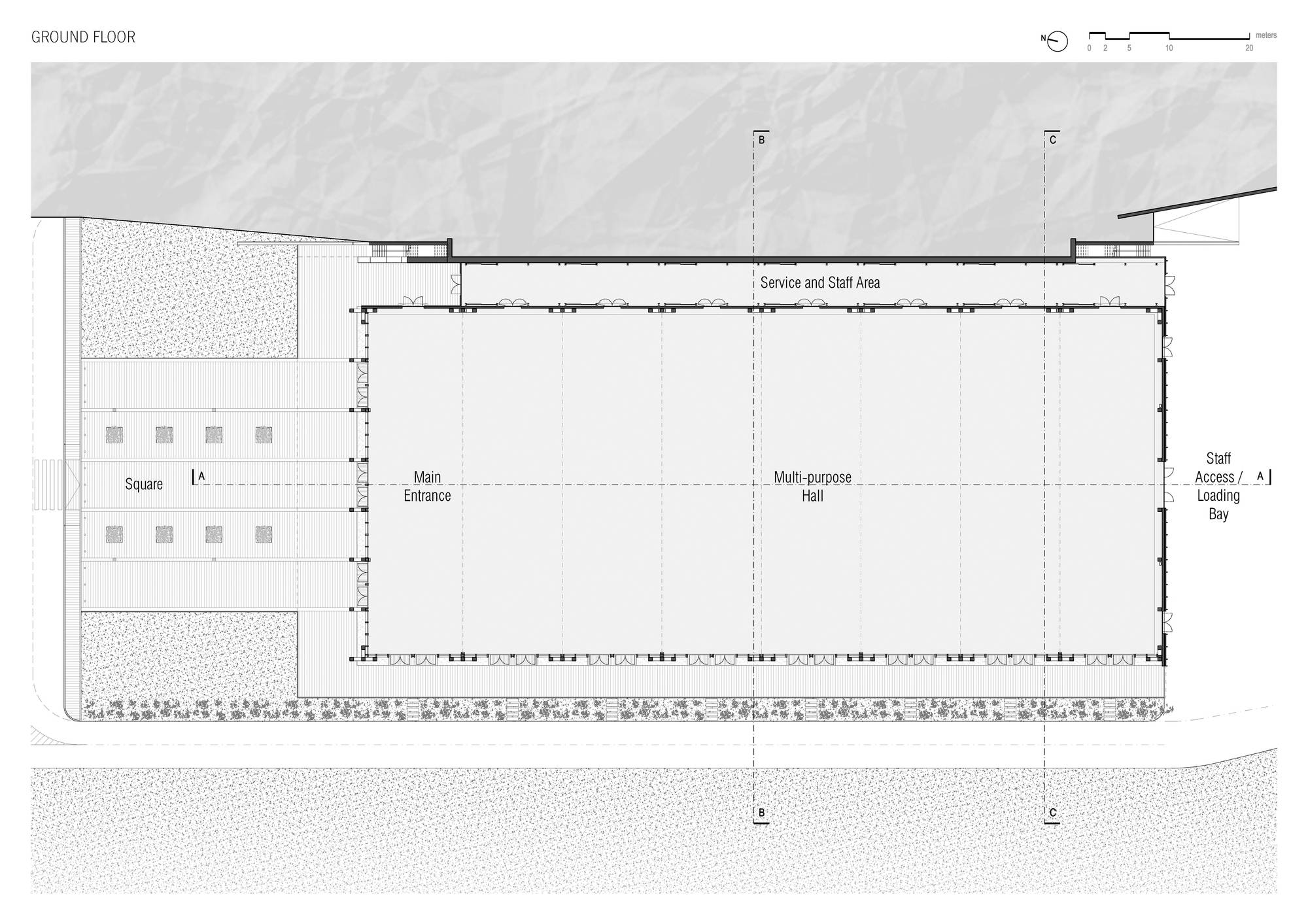 雖然位于城市聚落之外,但它具有很強(qiáng)的戰(zhàn)略性質(zhì),并且與公共網(wǎng)絡(luò)(學(xué)校、休閑中心、基礎(chǔ)設(shè)施)很好地連接。這座建筑有幾個(gè)不同的功能,比如為當(dāng)?shù)厣鐓^(qū)舉辦聚會(huì)活動(dòng)、表演和娛樂活動(dòng)。它將用于音樂會(huì)、戲劇表演、會(huì)議、藝術(shù)展覽和博覽會(huì)。