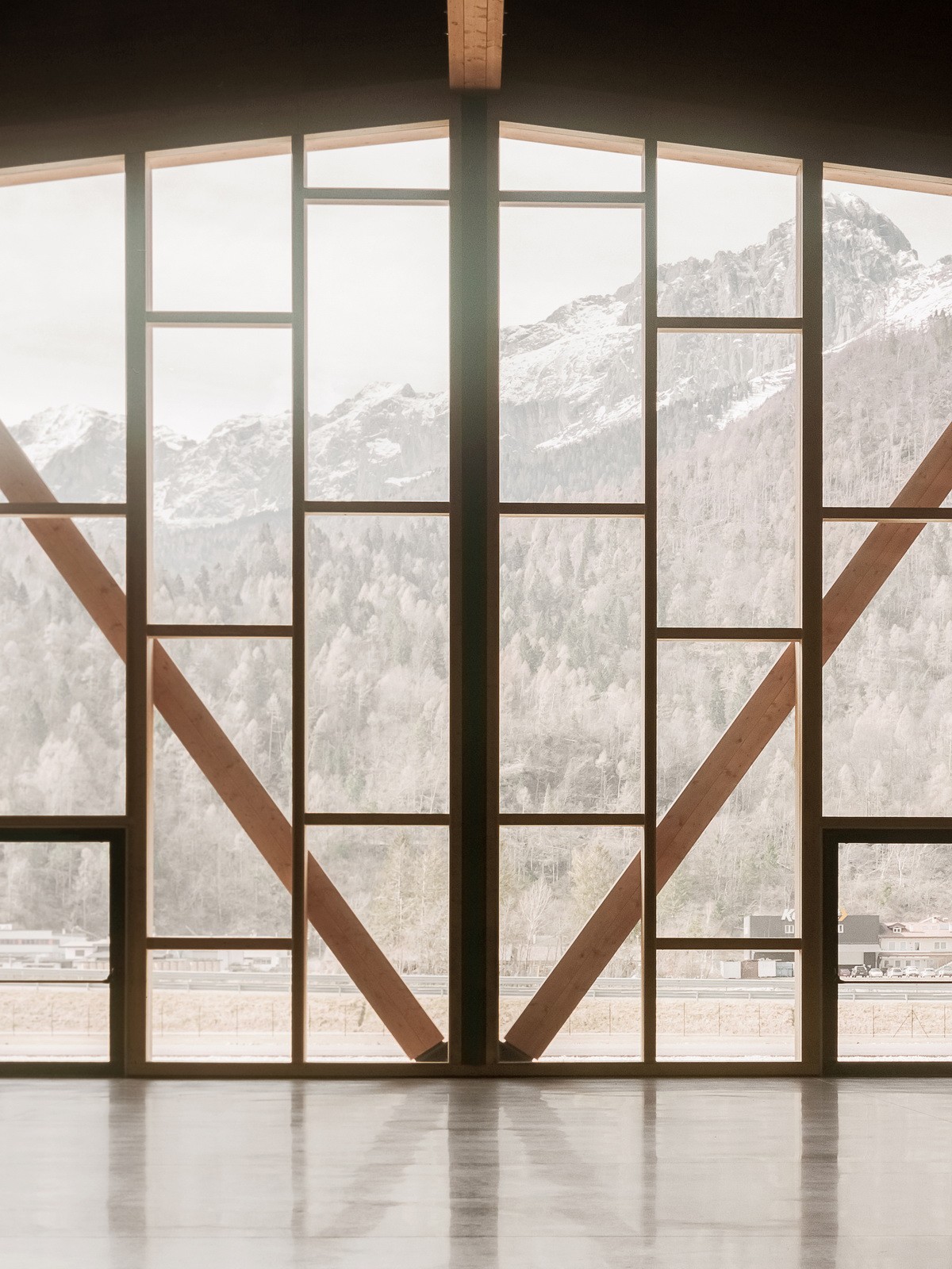 北部和西部的立面設(shè)計(jì)成面向景觀的大型透明玻璃幕墻,以便從主廳眺望群山。相反,東立面和南立面是封閉的,分別朝向傾斜的綠地和提貨間。