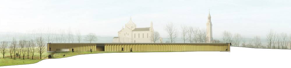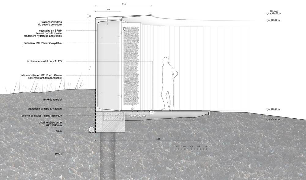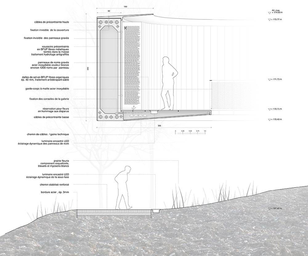 這個(gè)周長328米的水平環(huán)體呈褐色,等待參觀的人們前往重新發(fā)現(xiàn)和平。而人們到了環(huán)體的內(nèi)向的一側(cè),則會(huì)發(fā)現(xiàn)這里呈金色,500個(gè)金屬折面被鍍金,上面篆刻著參展士兵的名字,無任何等級(jí)之分。這種陳列所體現(xiàn)出的平等是對(duì)人性的尊重和對(duì)團(tuán)結(jié)的敬仰。環(huán)體最大的懸挑距離達(dá)到了60米,如此藝術(shù)的效果是通過新型材料實(shí)現(xiàn)。建筑會(huì)采用了超高性能的纖維增強(qiáng)混凝土,打造出這個(gè)無視時(shí)間,具有永恒效果般的環(huán)體。