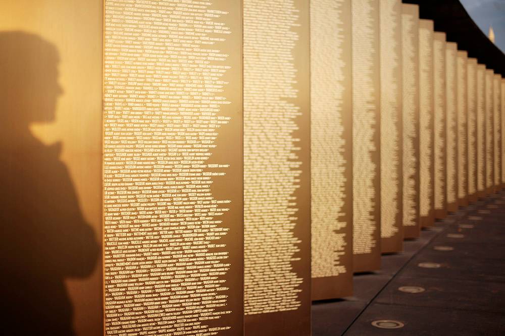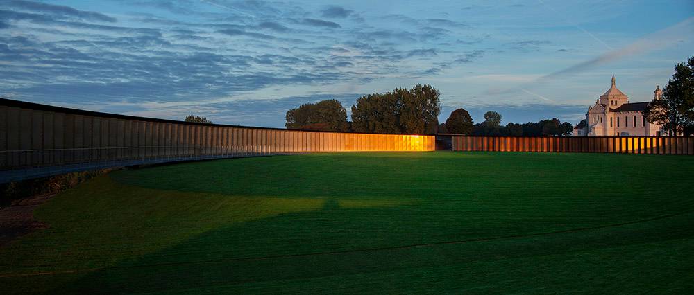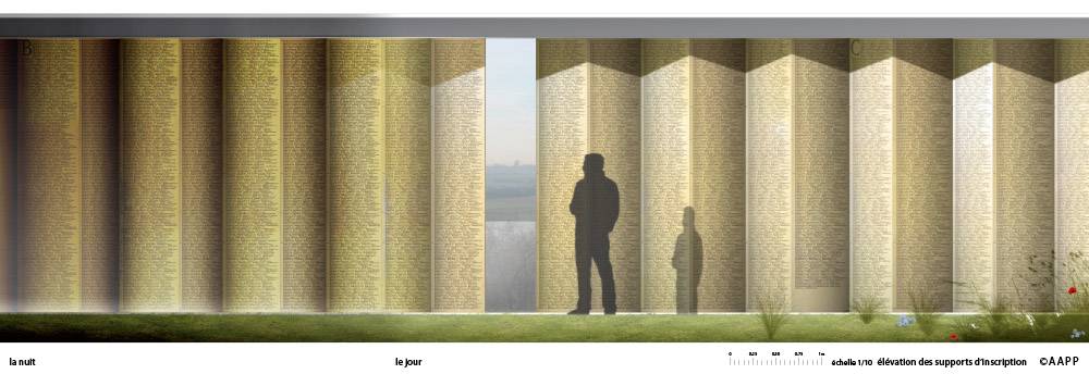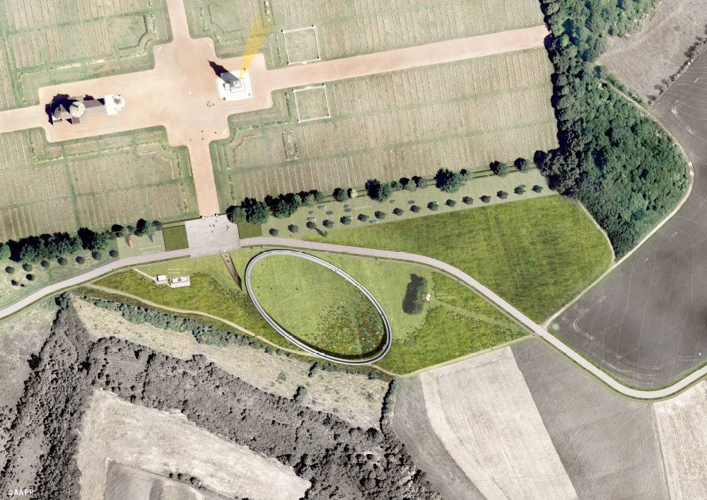 人們相互牽手而圍成一個(gè)圈。借意于此,建筑師在這個(gè)代表團(tuán)結(jié)和永恒的環(huán)中安放了參加Nord-Pas-de-Calais大戰(zhàn)的600,000官兵的名字,讓這些姓名,這些字母形成一個(gè)排名不以先后,沒有軍銜和國籍區(qū)分的循環(huán)。環(huán)體入口朝向墓地,另一側(cè)是阿圖瓦平原。
