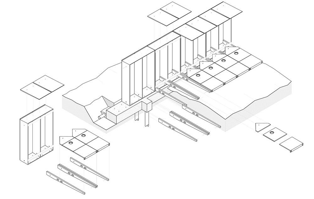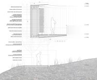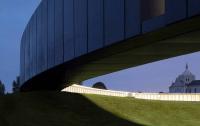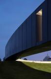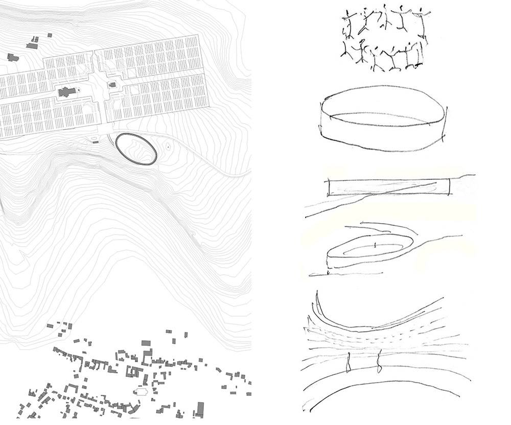 這個(gè)巨大的環(huán)體以水平之姿恒立在大地上,就像是一個(gè)完美的無重力浮體,其與起伏的地形形成巨大的反差,為此,壯觀的懸挑因而出現(xiàn)。環(huán)體在坡地上長距離的懸挑也仿佛在提醒人們,和平是脆弱的。