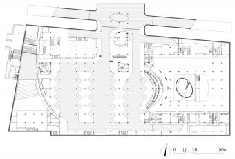 勝利之墻后面的坡道是勝利之路,緩緩上升,通過曲面屋檐及坡道的寬窄變化形成峽谷式的空間效果,走到坡道的頂端為巨大懸挑的平臺(tái),豁然開朗。在這里人們能夠俯瞰勝利廣場(chǎng),象征著勝利之路由“黑暗走向光明”。由勝利之路進(jìn)入紀(jì)念館,室內(nèi)一個(gè)核心的空間也是貫穿各層的橢圓型的圓臺(tái)體量,是紀(jì)念館的序廳,主要的上下聯(lián)系流線圍繞著這個(gè)體量周圍展開。圓臺(tái)體量頂上一圈橢圓型的天窗,撒下柔和自然光線,增加了館內(nèi)靜謐的氣氛。