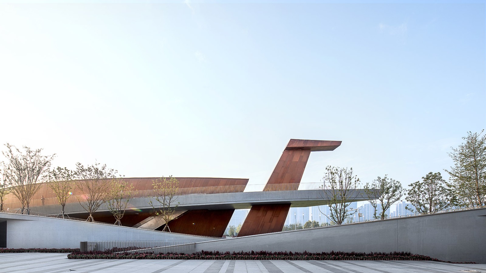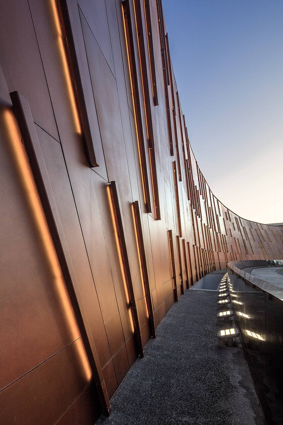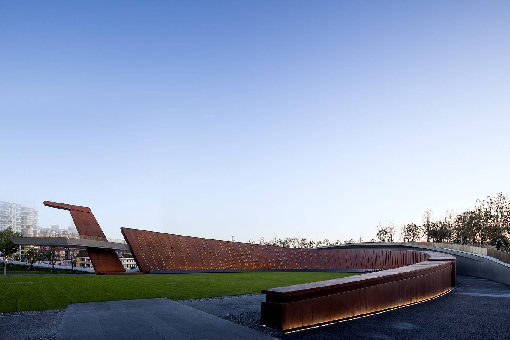 在柔和的綠色的襯托下,暗紅色的弧形勝利之墻分外醒目。勝利之墻材質(zhì)采用了能夠凸顯歷史感與滄桑感的暗紅色銹蝕鋼板。勝利之墻由負(fù)一層延伸出來,墻面為三維曲面,通過鋼板的分割與嵌入燈槽形成表面肌理,象征著中華民族“浴火重生”的歷史記憶,并成為開闊綠色廣場(chǎng)日夜的主要景觀。勝利之墻的最高點(diǎn)是勝利火炬,火炬在重大活動(dòng)的時(shí)候會(huì)點(diǎn)燃熊熊烈火。