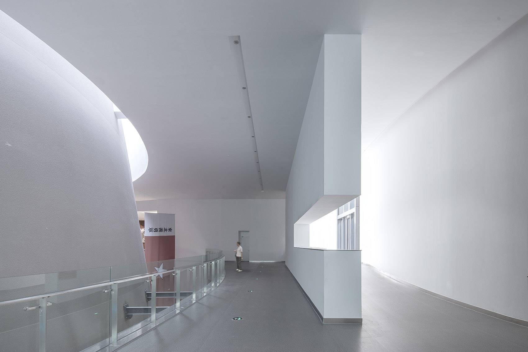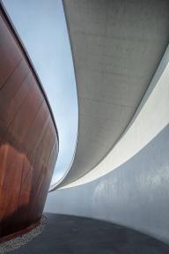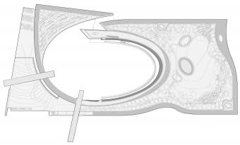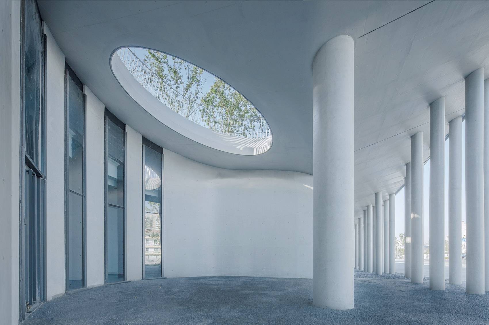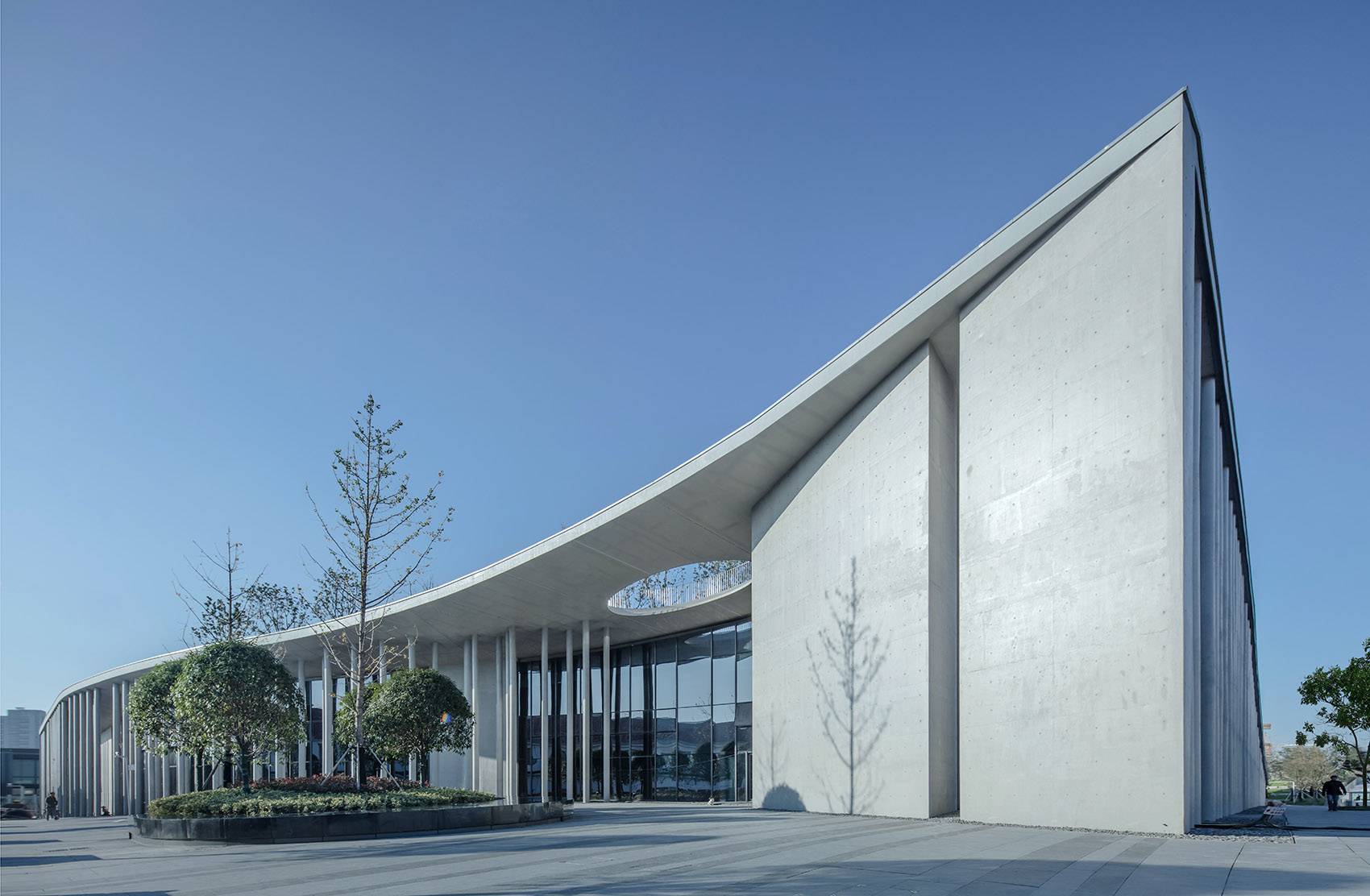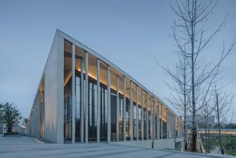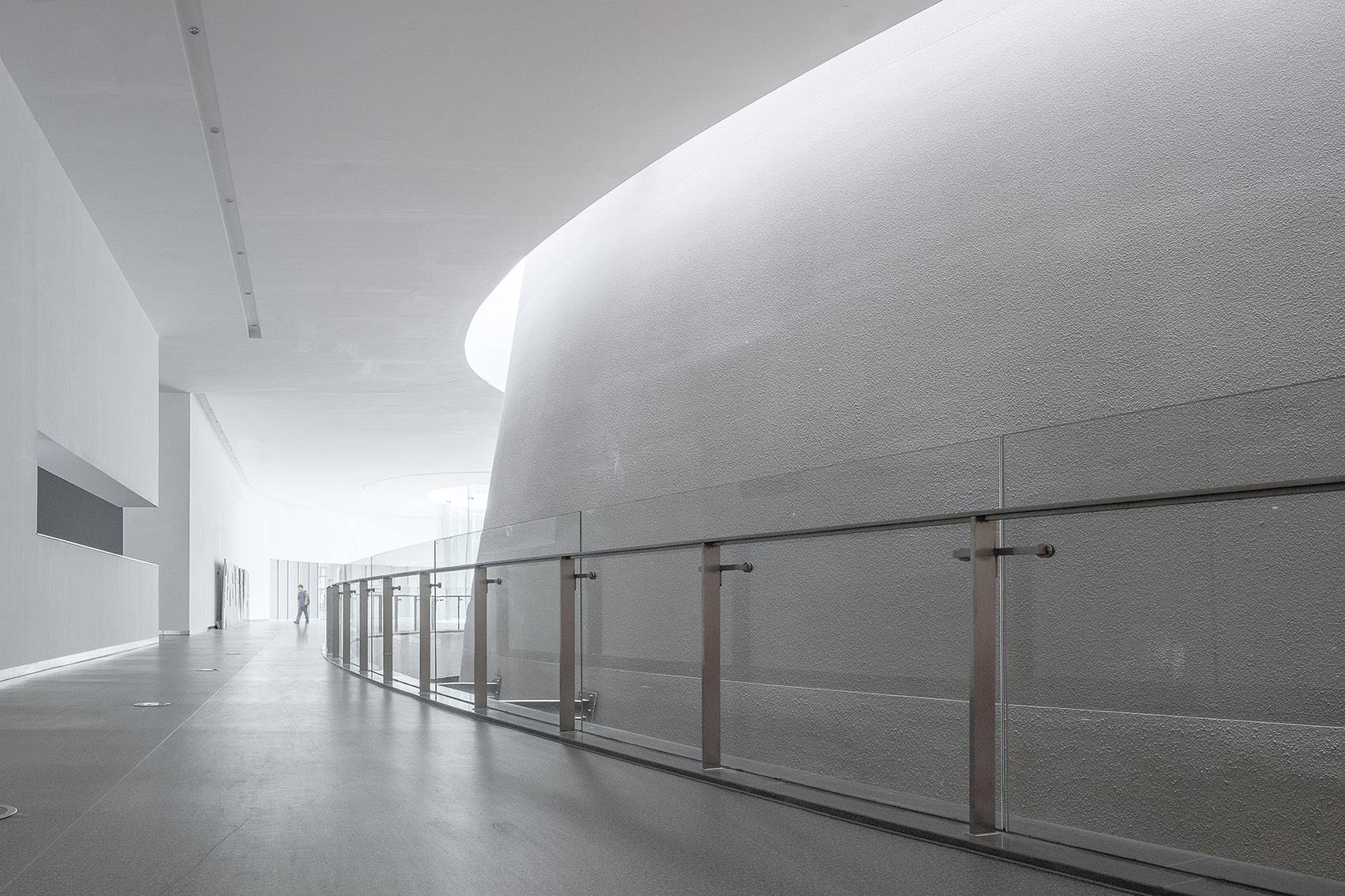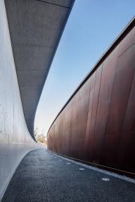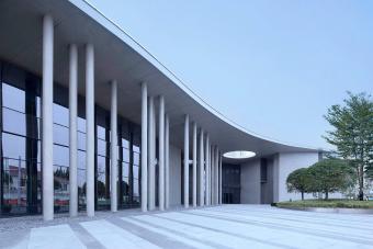 和而不同是方案的定位,建筑的整體形態(tài)與二期融為一體,也以更加開放包容的姿態(tài)、親切自然的方式融入城市生活。覆土地景式的建筑形態(tài)削弱對(duì)周邊城市建筑和空間的壓迫感,柔和的建筑曲線與綠色的樹木草地相得益彰、寧靜平和。新館立面延續(xù)灰色色調(diào),面對(duì)城市空間排列著清水混凝土柱,亦展現(xiàn)了新館的紀(jì)念性特征。