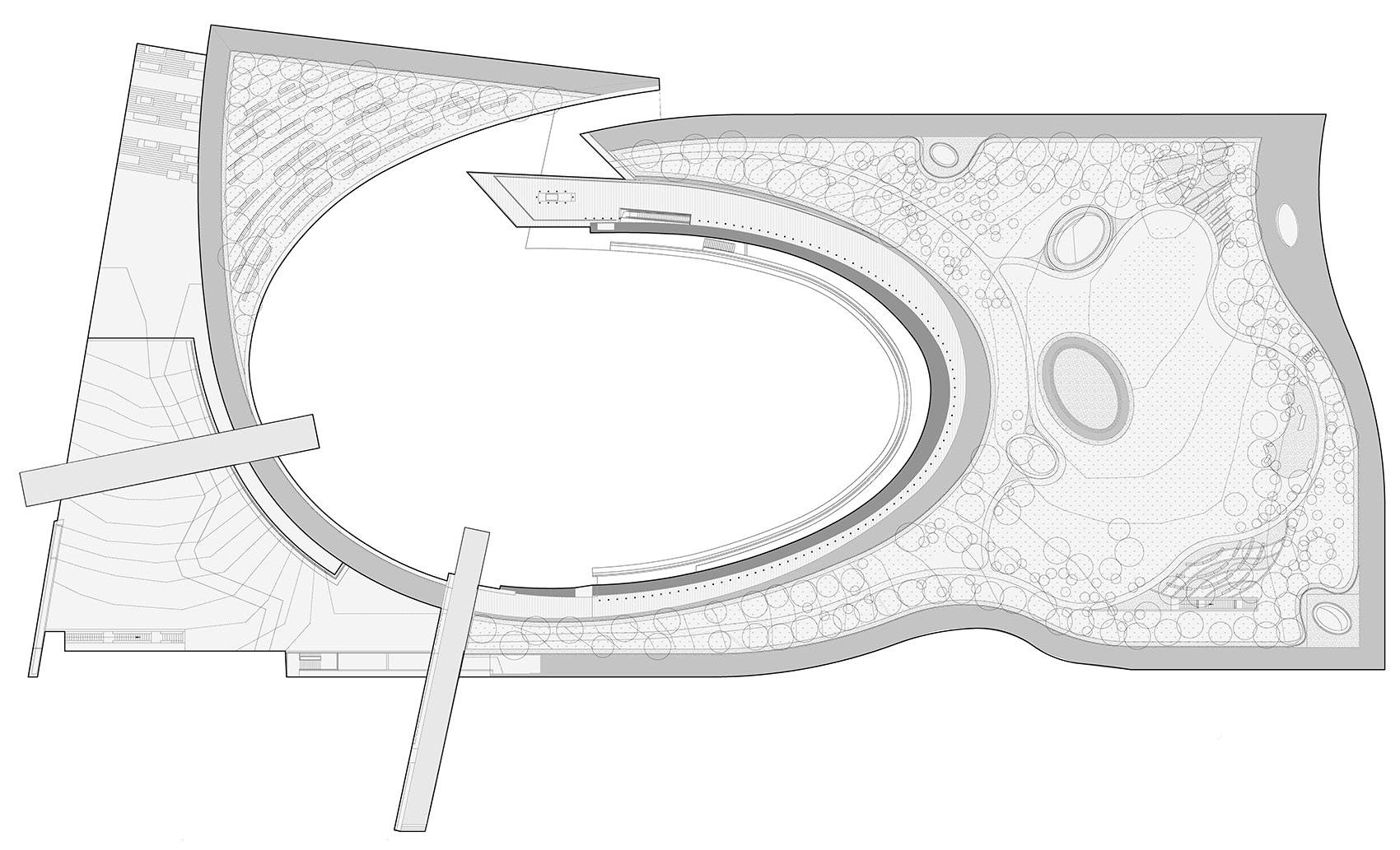 場(chǎng)地中心是橢圓形的紀(jì)念廣場(chǎng),寓意著中國抗戰(zhàn)勝利和“圓滿”的愿景。整個(gè)建筑物呈現(xiàn)謙遜柔和的空間形態(tài),是一個(gè)融于城市生活的綠色公園。其中,一條“勝利道路”穿行其中,象征抗戰(zhàn)勝利的艱難歷程。紀(jì)念廣場(chǎng)的四周地形微微隆起,形成半圍合的空間,結(jié)合綠樹設(shè)置屏蔽了部分城市干擾,保證廣場(chǎng)的安靜與私密,也為公眾提供了一處親切的放松游憩場(chǎng)地。人們?cè)趦?nèi)可以休憩、奔跑、漫步、交流,怡然自得。