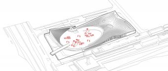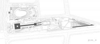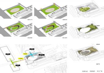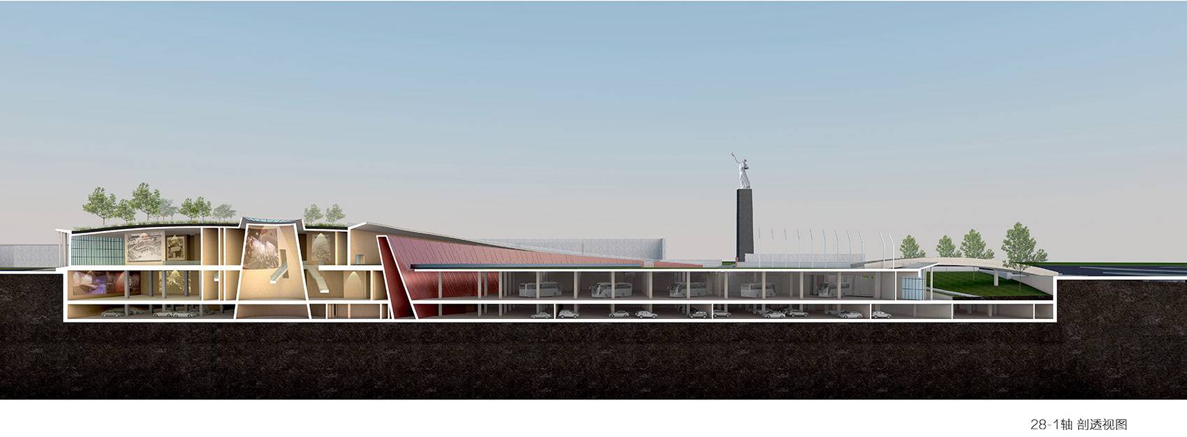 新館是一個(gè)功能復(fù)合開放的綜合體,除了勝利紀(jì)念廣場(chǎng)、綠化公園外,還容納了世界反法西斯戰(zhàn)爭(zhēng)中國戰(zhàn)區(qū)勝利紀(jì)念館、大巴車站、社會(huì)汽車庫、自行車庫、商業(yè)配套、辦公等功能設(shè)施。場(chǎng)地西側(cè)北側(cè)通過設(shè)置下沉庭院及坡道與地鐵、隧道、周邊城市空間對(duì)接與聯(lián)系。整體性對(duì)周邊城市交通進(jìn)行梳理與更新,有效的完善和補(bǔ)充了紀(jì)念館的參觀流線與交通組織,能夠?yàn)槌鞘刑峁┮粋€(gè)方便可達(dá)、開放復(fù)合的城市空間節(jié)點(diǎn)。開放式的設(shè)計(jì)是新館的一個(gè)重要特點(diǎn),當(dāng)紀(jì)念館及新館閉館后,其他功能仍然可以繼續(xù)提供社會(huì)服務(wù)。通過燈光照明的設(shè)計(jì),使廣場(chǎng)在日夜都形成不同的景色,成為一個(gè)公共開放的日夜公園。