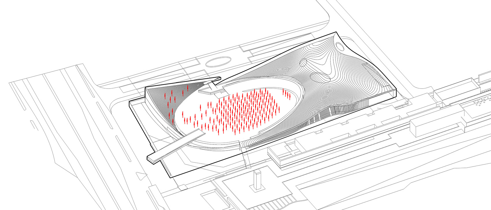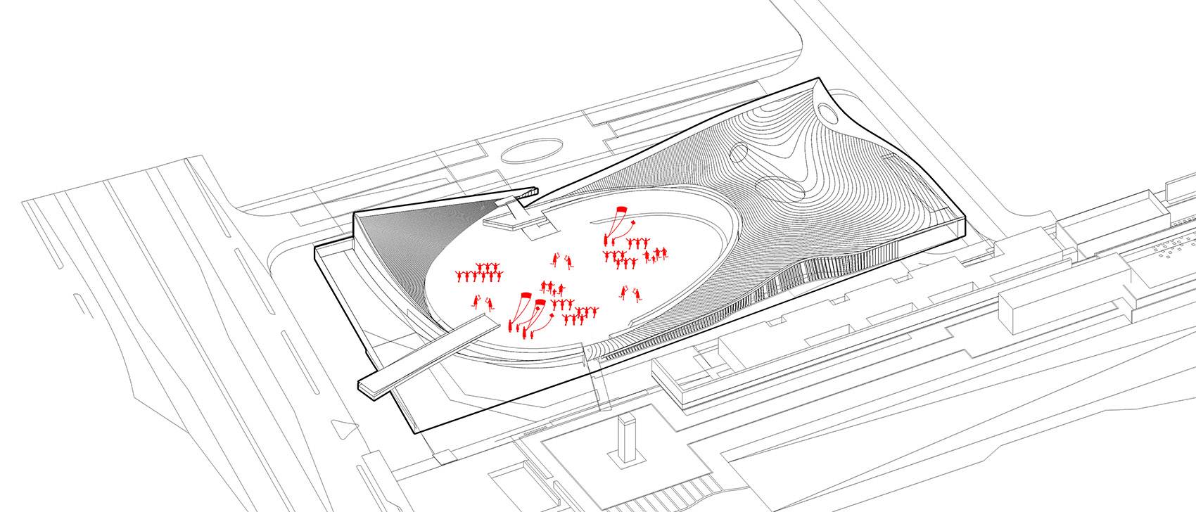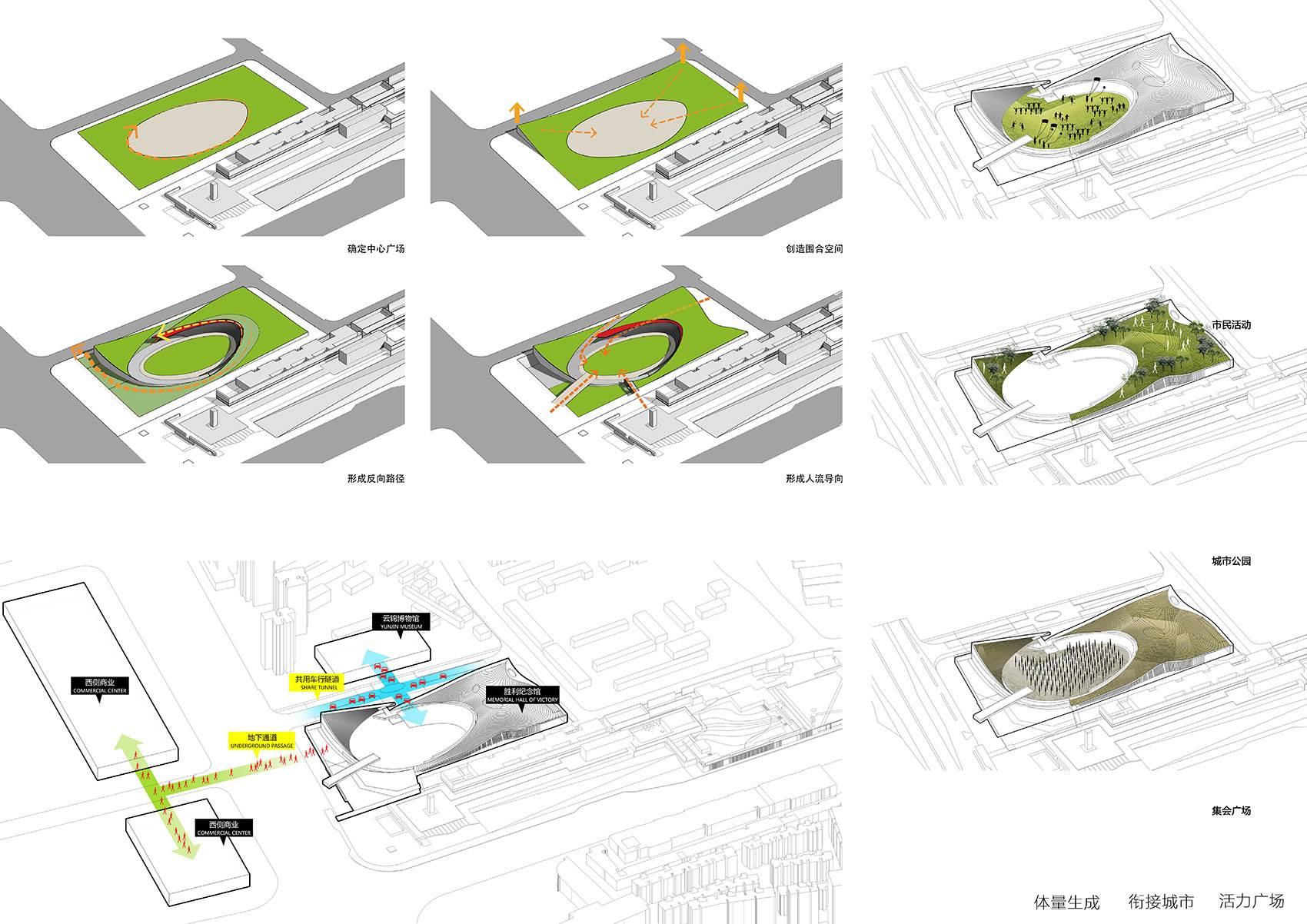 當(dāng)需要舉辦大型紀(jì)念活動(dòng)時(shí),整個(gè)橢圓形廣場(chǎng)亦可容納8000人集會(huì)。廣場(chǎng)的北面設(shè)有小型講演臺(tái),供集會(huì)活動(dòng)時(shí)候使用。廣場(chǎng)三面的抬起斜坡場(chǎng)地,使廣場(chǎng)更加具有向心感和聚合性,抬高的坡地下面容納著商業(yè)和展覽空間。在廣場(chǎng)與坡地交界區(qū)域組織著廣場(chǎng)主要交通流線,設(shè)計(jì)了獨(dú)特的紀(jì)念景觀要素。300位抗戰(zhàn)英烈的名字鐫刻于拋光黑色大理石之上,佇立于游人漫步的廣場(chǎng)一側(cè)。廣場(chǎng)西南側(cè)是與城市對(duì)接的重要出入口,設(shè)置了下沉廣場(chǎng)使紀(jì)念廣場(chǎng)與城市道路保持了一定的距離感。拱橋的巧妙連接則使得紀(jì)念廣場(chǎng)的空間具有指向性和聚合性。