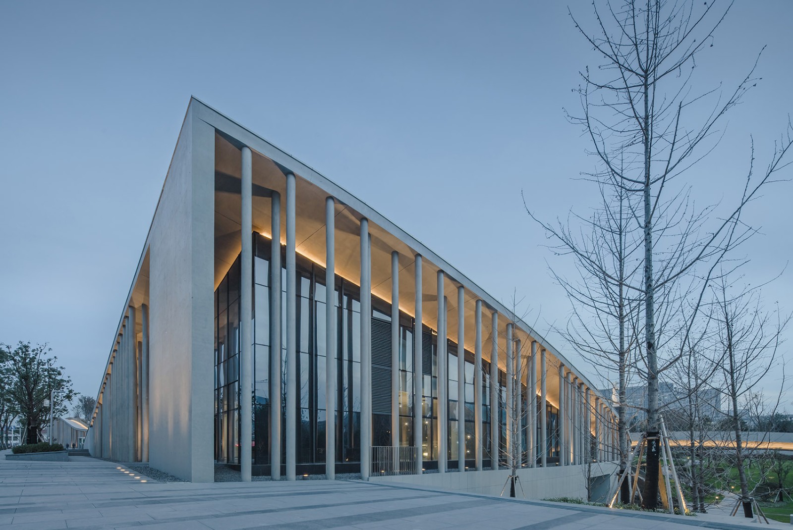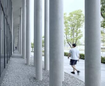 新館沿街立面均采用一次性澆筑的清水混凝土材質(zhì),質(zhì)樸厚重的清水混凝土既能夠凸顯建筑的紀(jì)念性特征,又符合安靜平和的建筑氣質(zhì)。外立面一列列混凝土柱陣將陽光切割成條條光影,形成無窮無盡的韻律感。柱廊下面鋪設(shè)灰色碎石,自然形成了與城市的緩沖,也加強(qiáng)了建筑的紀(jì)念性與場(chǎng)所感。