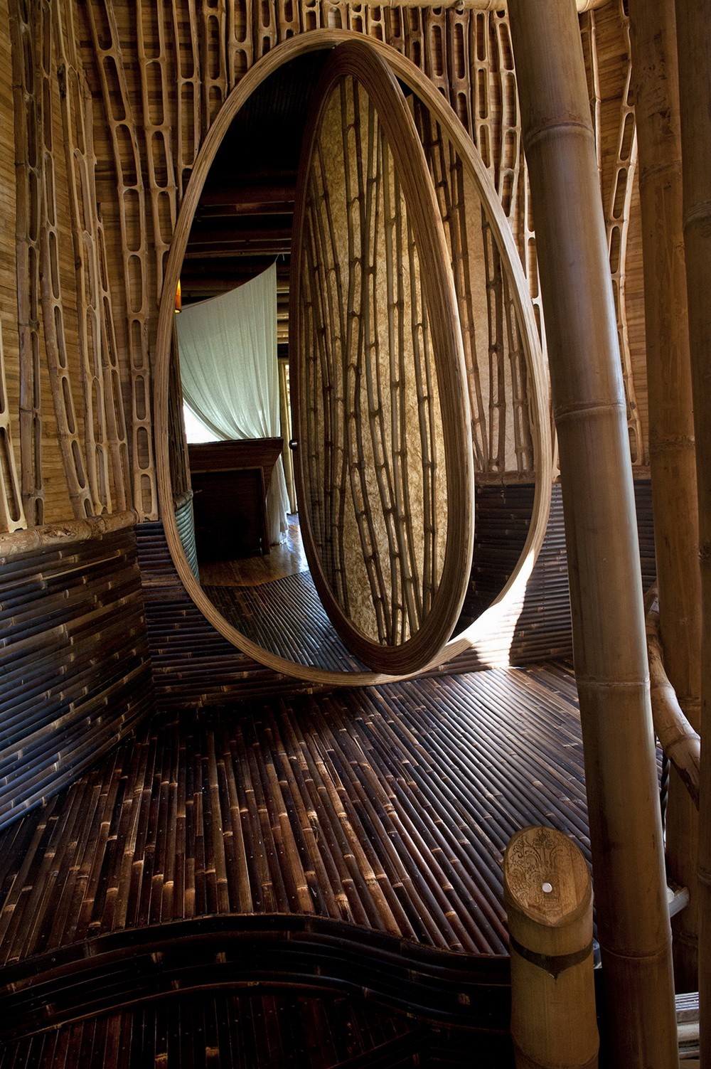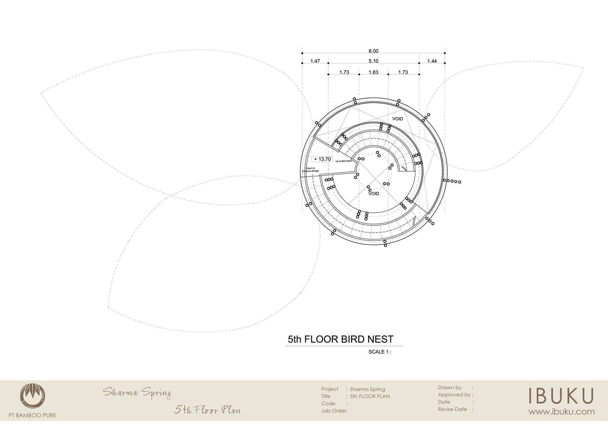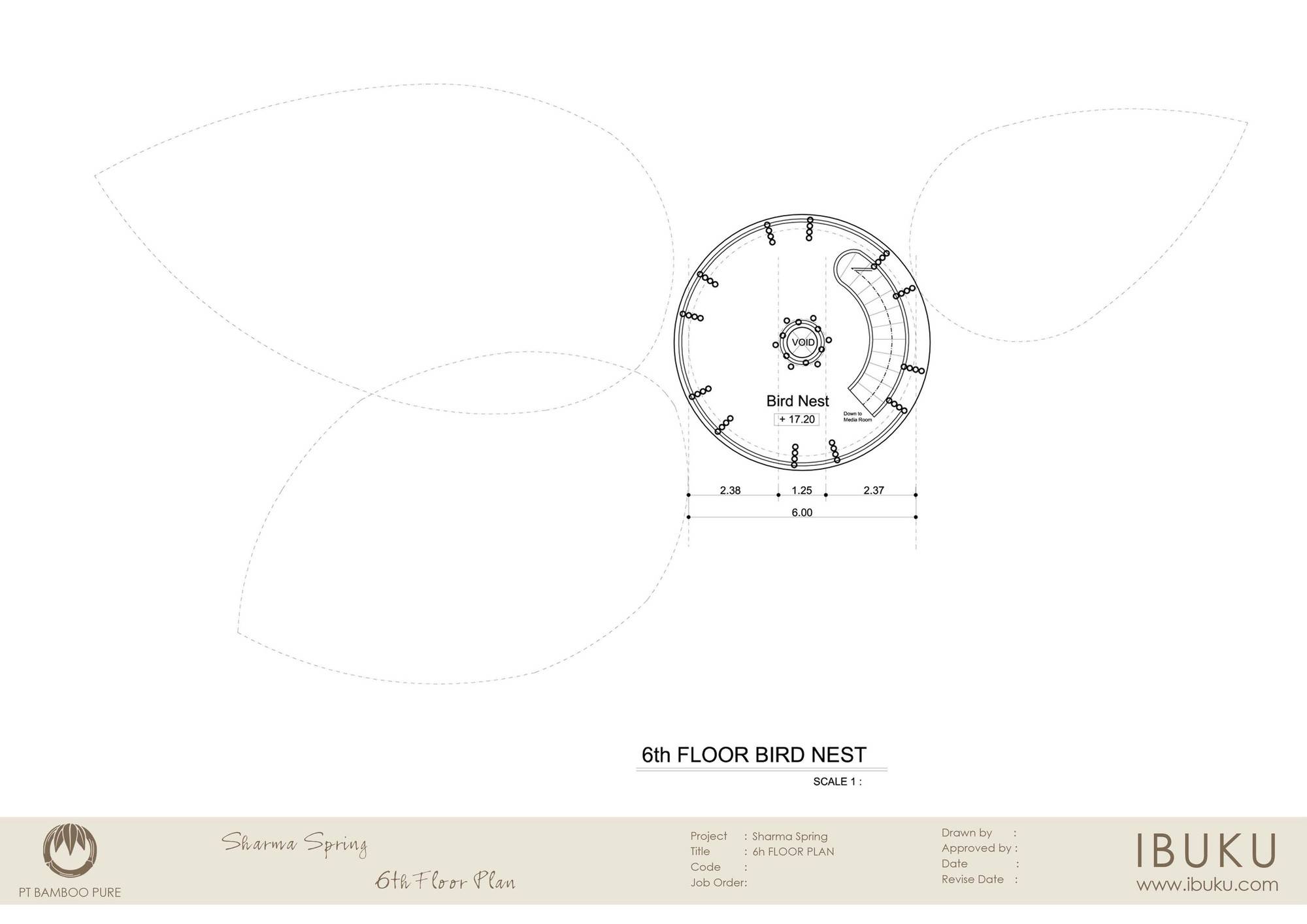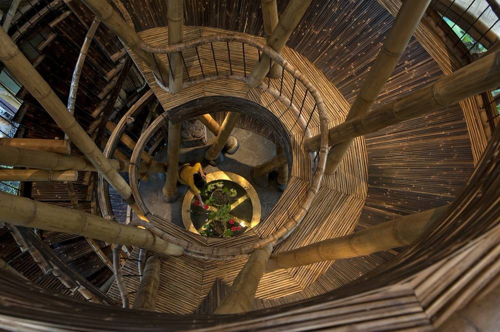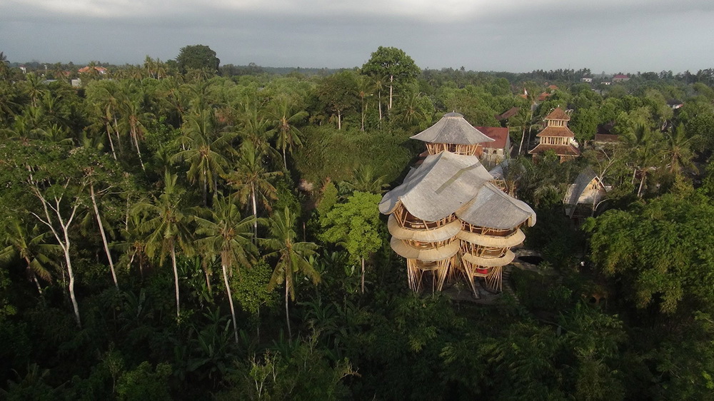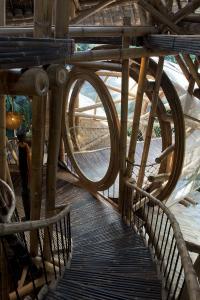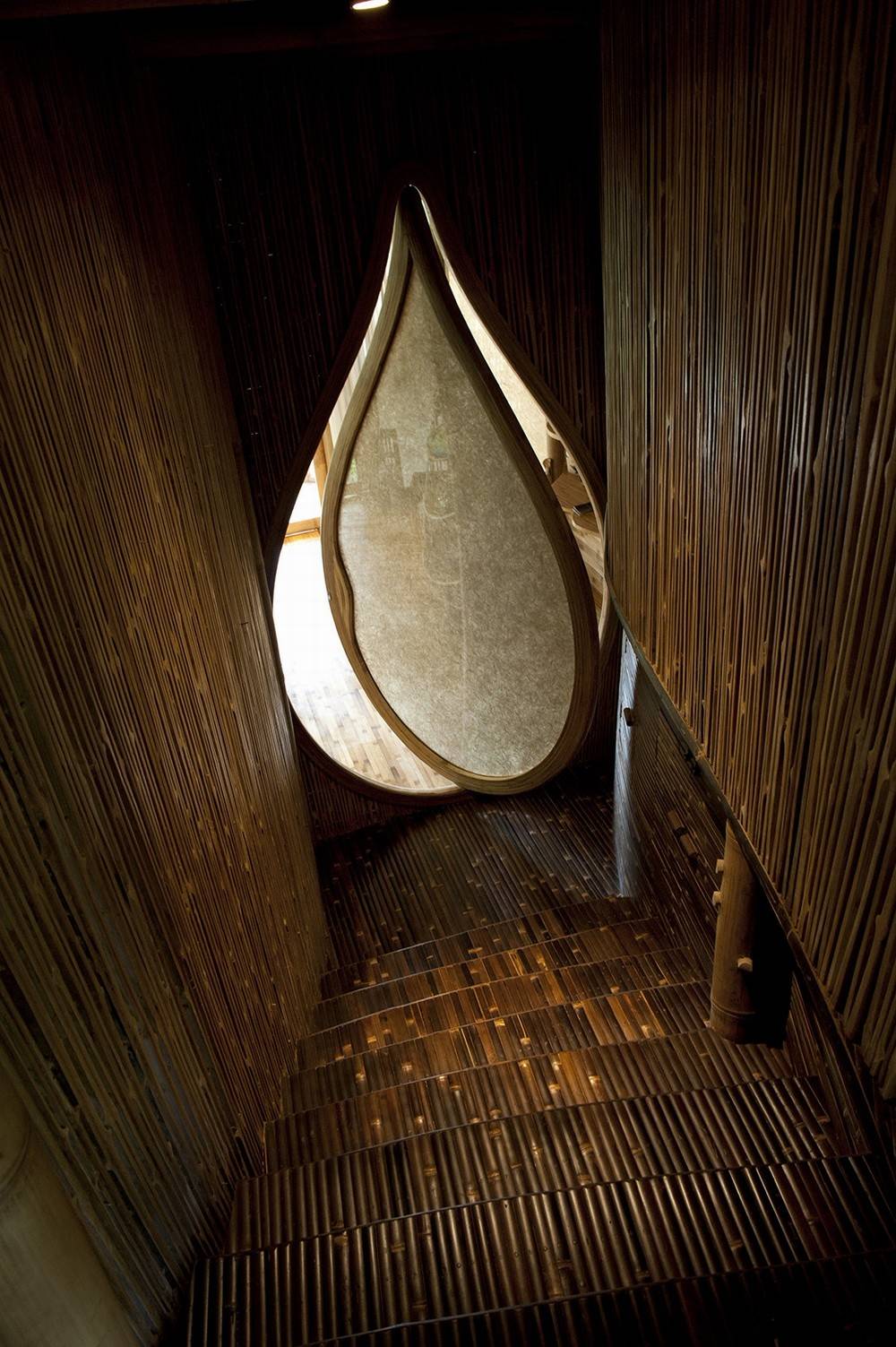 樓梯圍繞著中央塔旋轉至下方的樓層:一個游戲室,四個臥室和一個圖書館,每個房間都配有全長旋轉玻璃門窗,以便封閉起來使用空調。六層觀景臺是一個前傾的平臺,提供座位休息區(qū),可以欣賞到阿漾(Ayung)河谷和格林村令人驚嘆的日落美景。