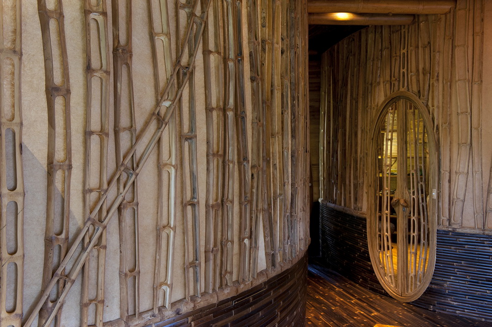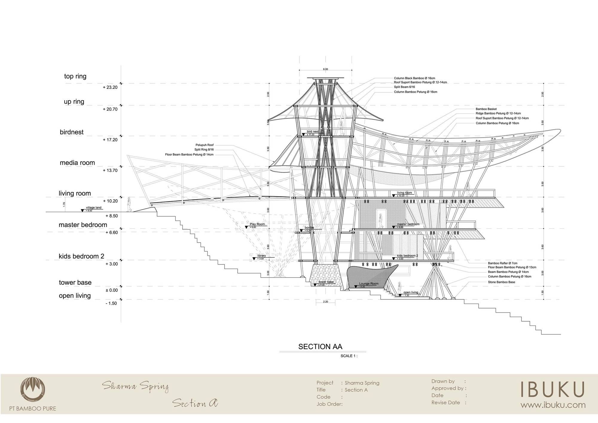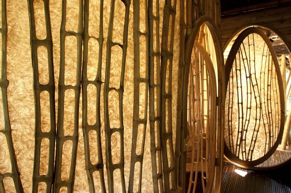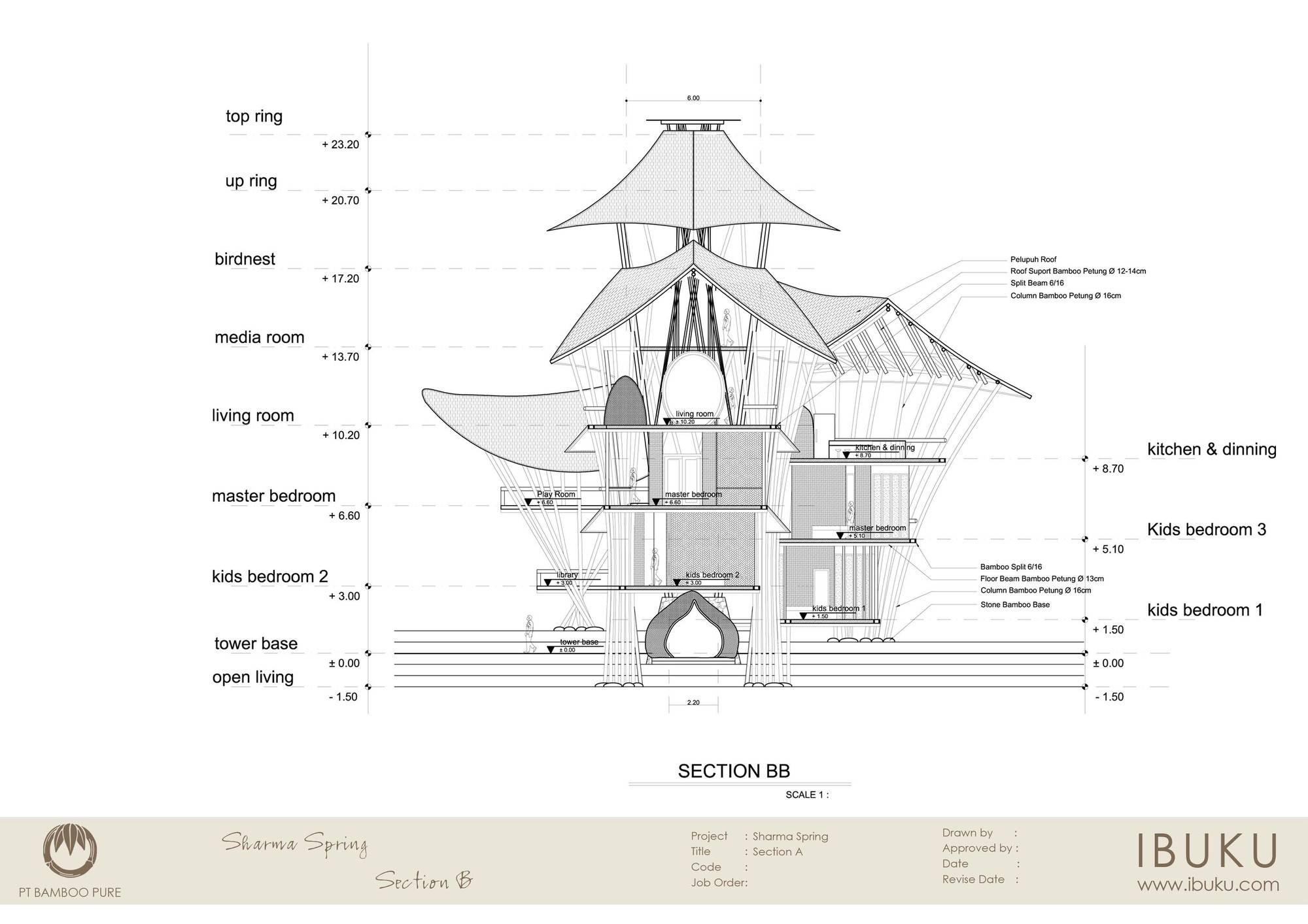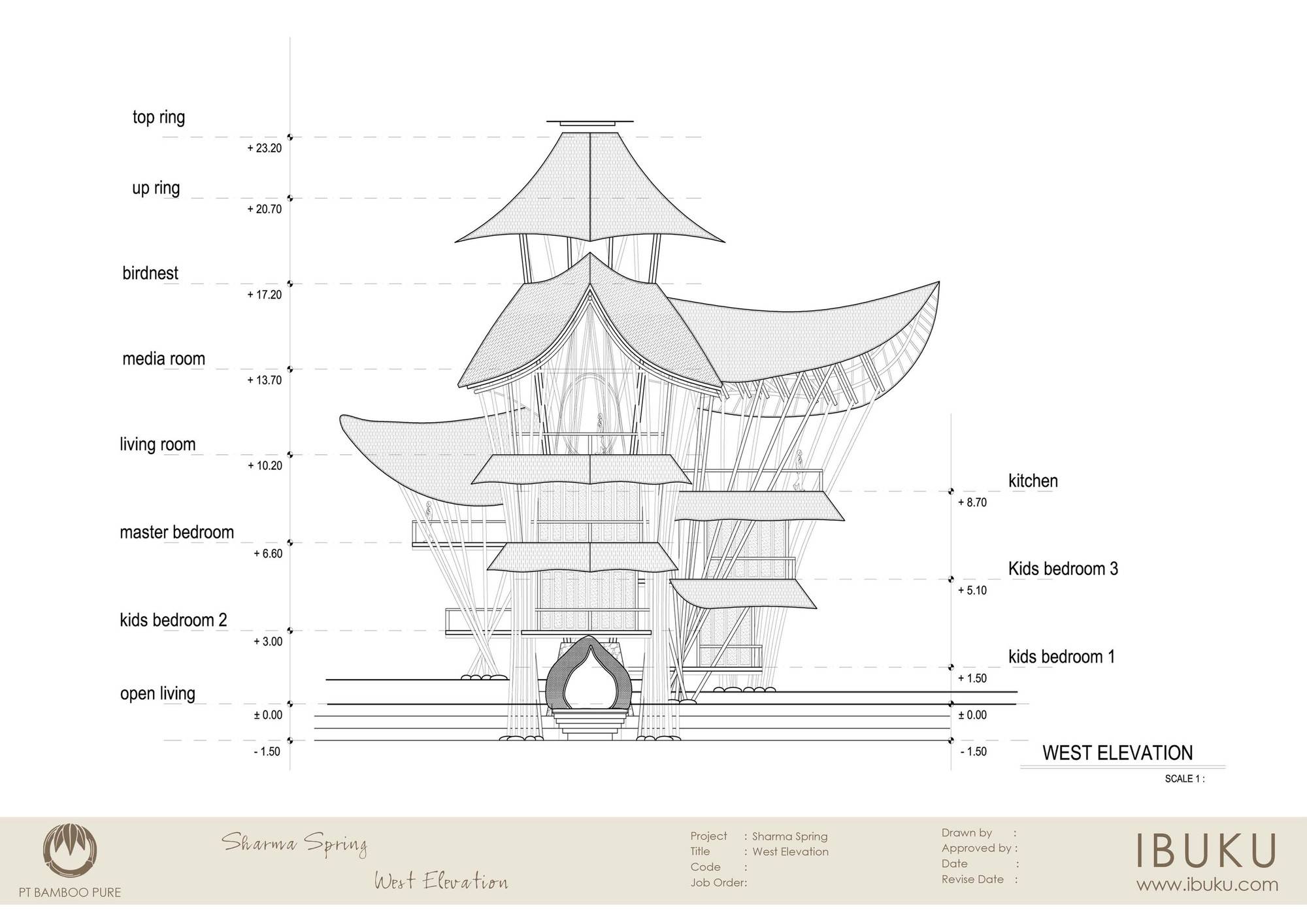 樓梯圍繞著中央塔旋轉至下方的樓層:一個游戲室,四個臥室和一個圖書館,每個房間都配有全長旋轉玻璃門窗,以便封閉起來使用空調。六層觀景臺是一個前傾的平臺,提供座位休息區(qū),可以欣賞到阿漾(Ayung)河谷和格林村令人驚嘆的日落美景。