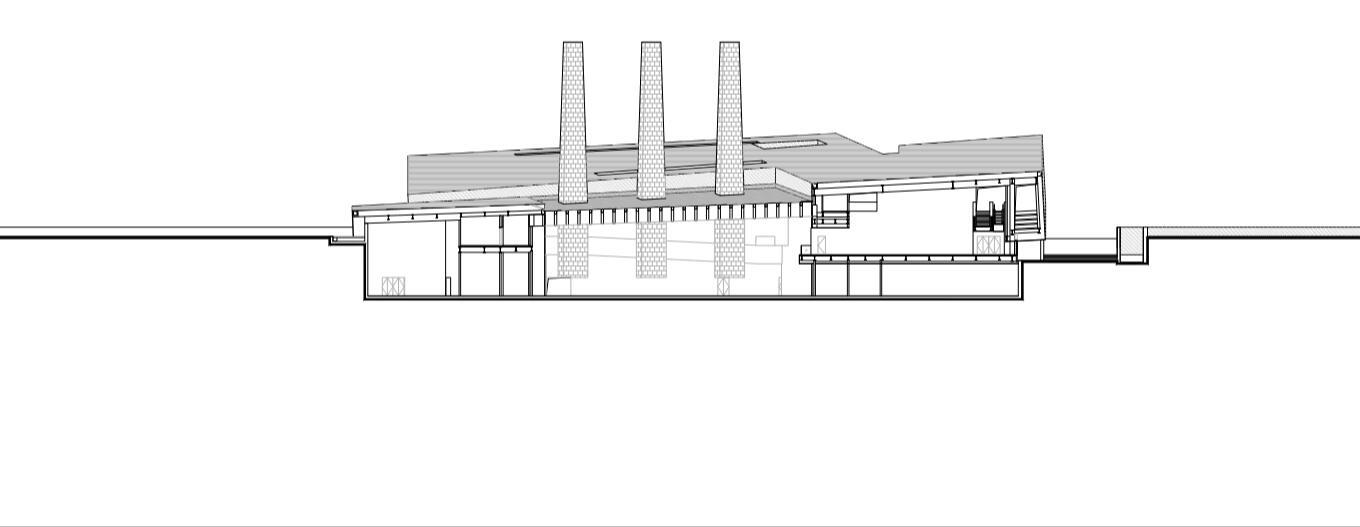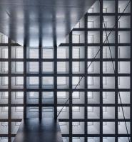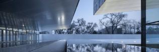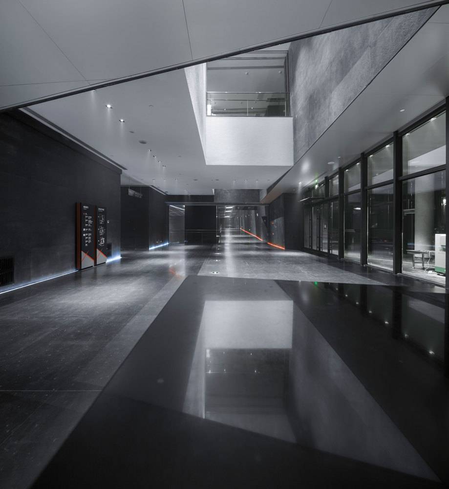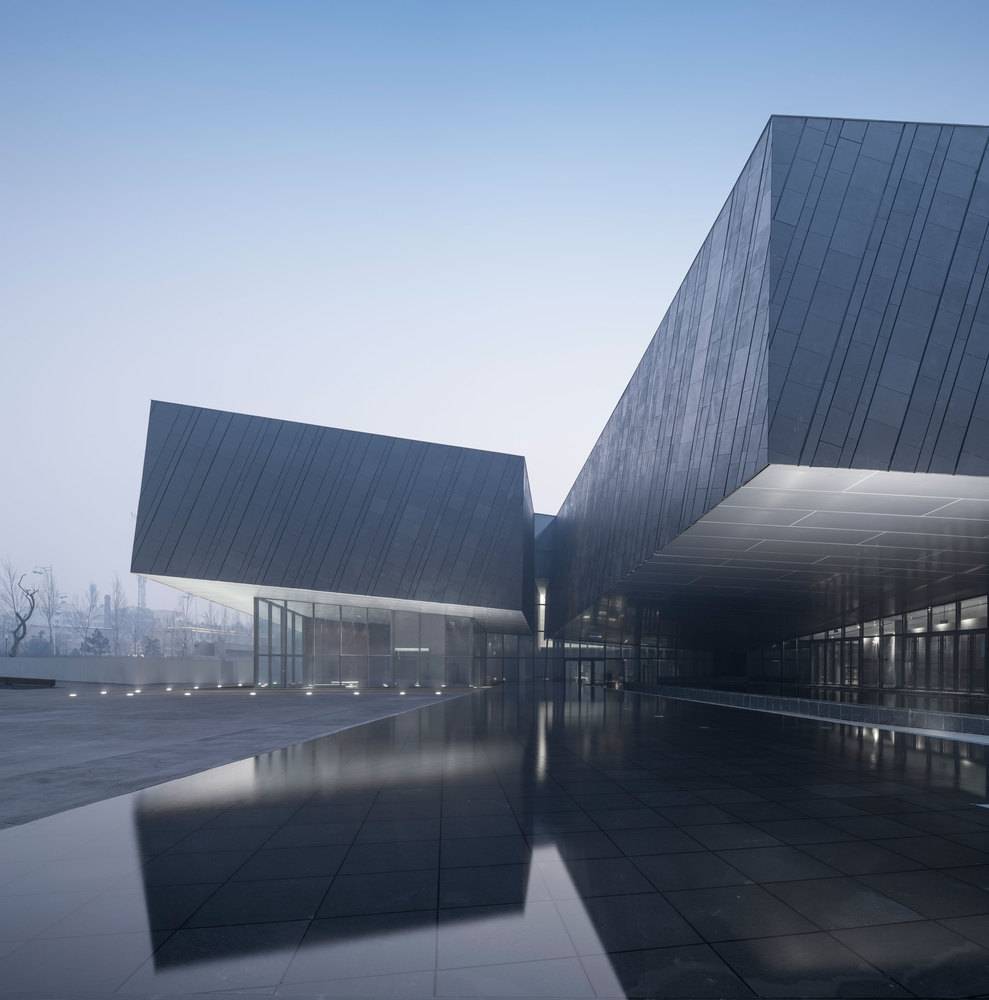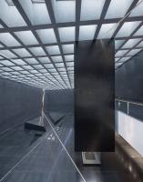 為了消解新建建筑體量對(duì)場(chǎng)地的壓抑,建筑師把主要的展示空間沉入地下,“碎裂”的“黑匣”傾側(cè)于塌陷的場(chǎng)地之上,黑灰色的屋面成為廣場(chǎng)地面的延伸?!皟A側(cè)”的本身體現(xiàn)在設(shè)計(jì)的尺度上,同時(shí)也表達(dá)了一種設(shè)計(jì)的態(tài)度。從本部辦公樓前的廣場(chǎng)向東邊望去,陳列館仿佛只是地形上的些微起伏,雖然是人工的幾何體,卻又像是自然形成的大地景觀。裂縫的存在讓“黑匣”在整體中帶有微小的變化,包括形體、色彩和材質(zhì),這些細(xì)節(jié)為建筑在環(huán)境中的消隱提供了支持。