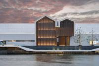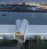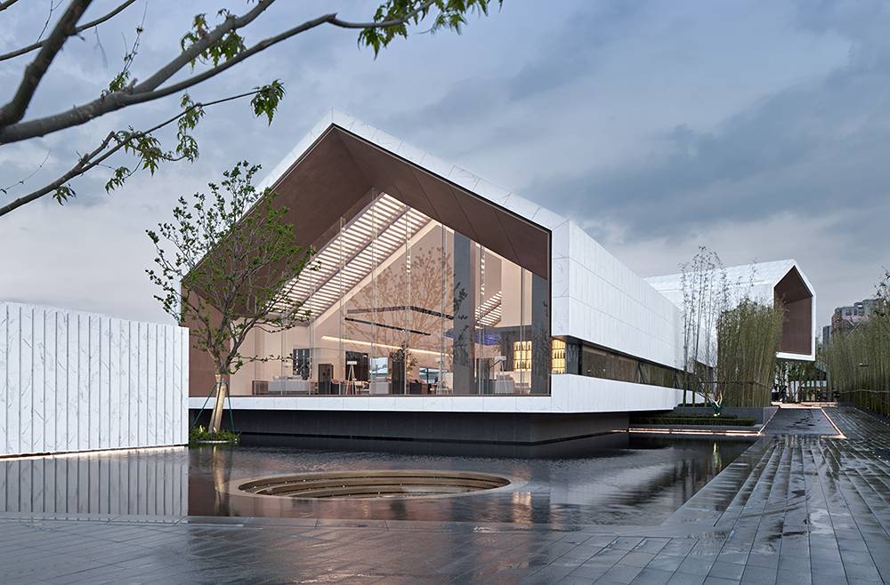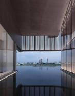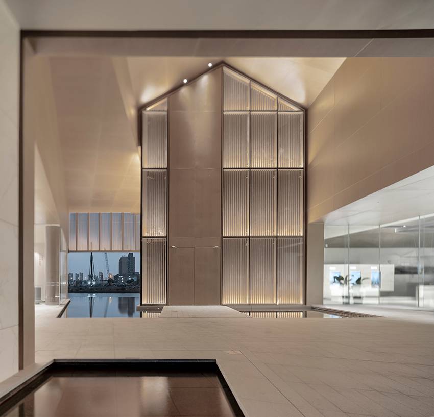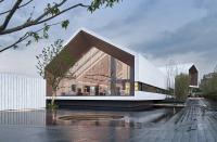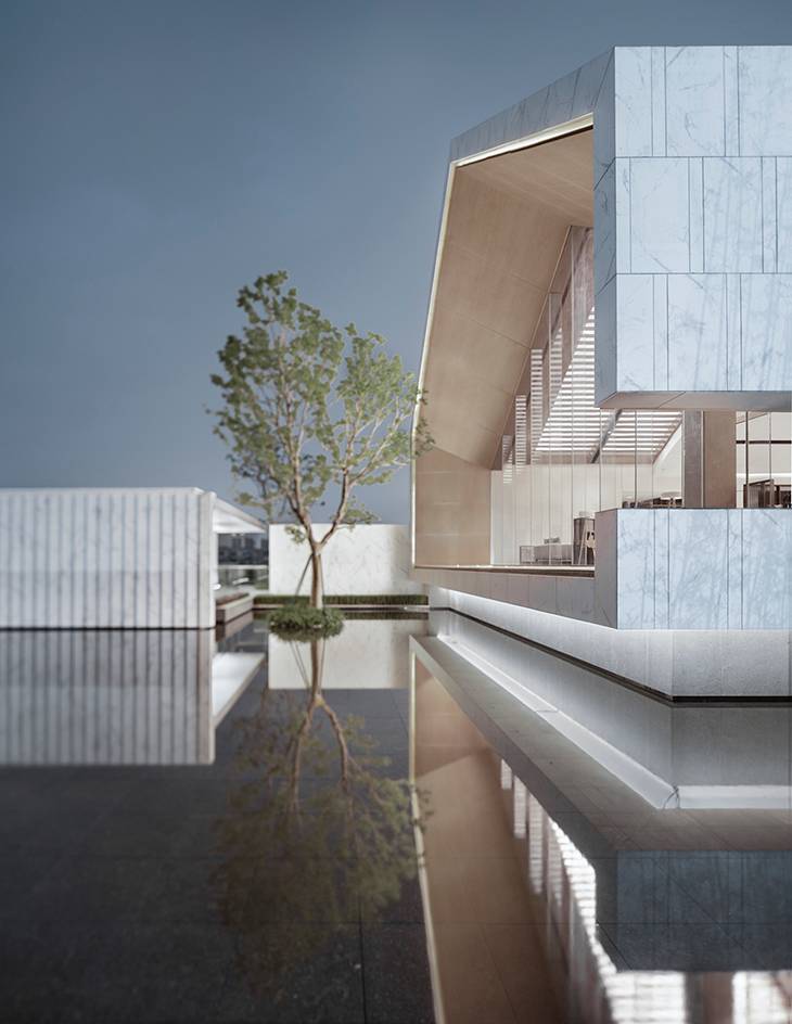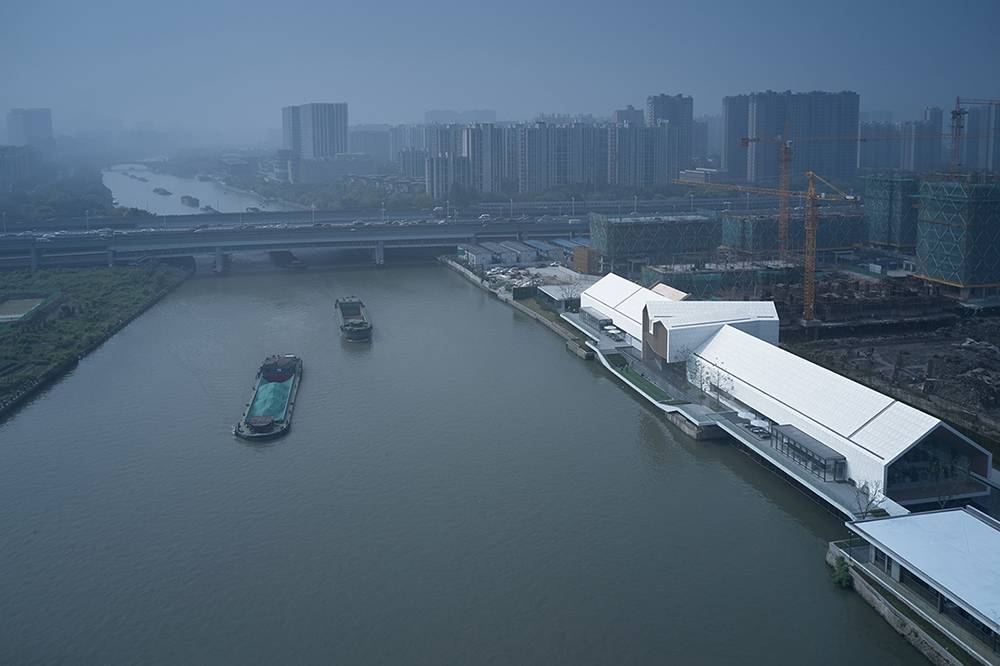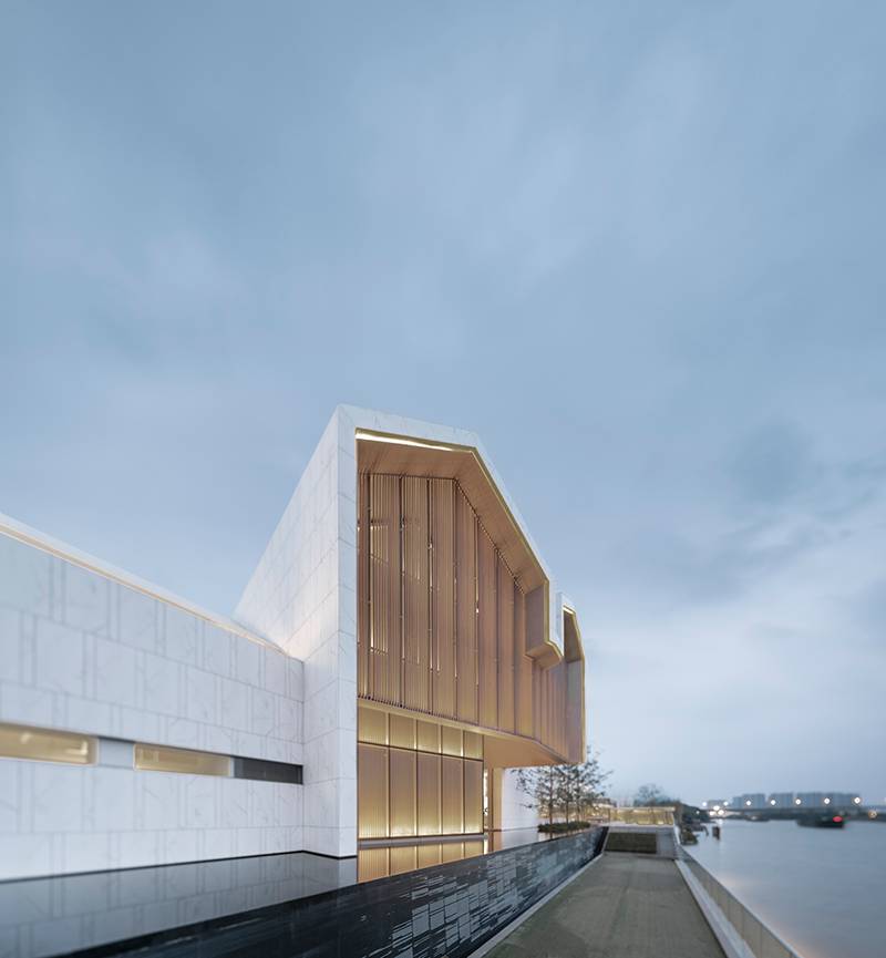 設(shè)計(jì)師以簡潔的現(xiàn)代語言進(jìn)一步演繹運(yùn)河新風(fēng)貌。構(gòu)造一體化的手法,即屋頂和墻面采用同種材質(zhì),為傳統(tǒng)的立面比例關(guān)系賦予相對(duì)當(dāng)代的感官體驗(yàn),塑造出建筑的體積感。建筑前場(chǎng)由一片靜謐的水面圍合,銜接運(yùn)河,純粹的體量呈現(xiàn)一種上浮姿態(tài)。停留于入口處,輕巧的坡道在水面上鋪開,硬朗通透的剖切面映入眼簾,得以遙遙領(lǐng)略室內(nèi)典雅的氣息。材料色彩與質(zhì)感亦從周邊傳統(tǒng)建筑中提取,采用素雅的干掛瓷磚,更增添了整體的輕盈感。