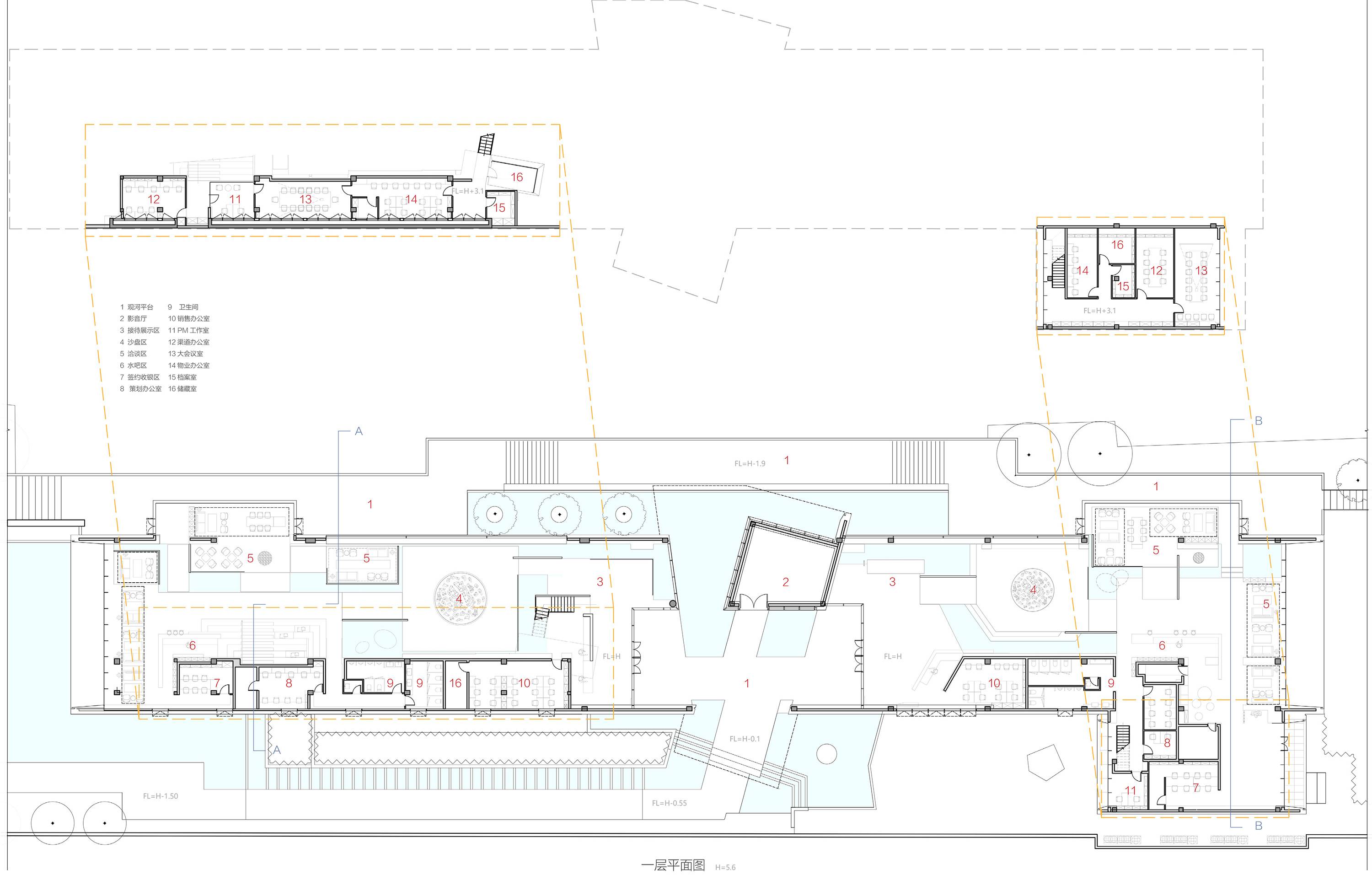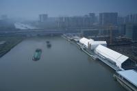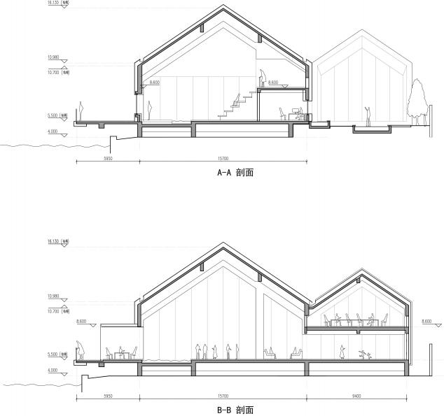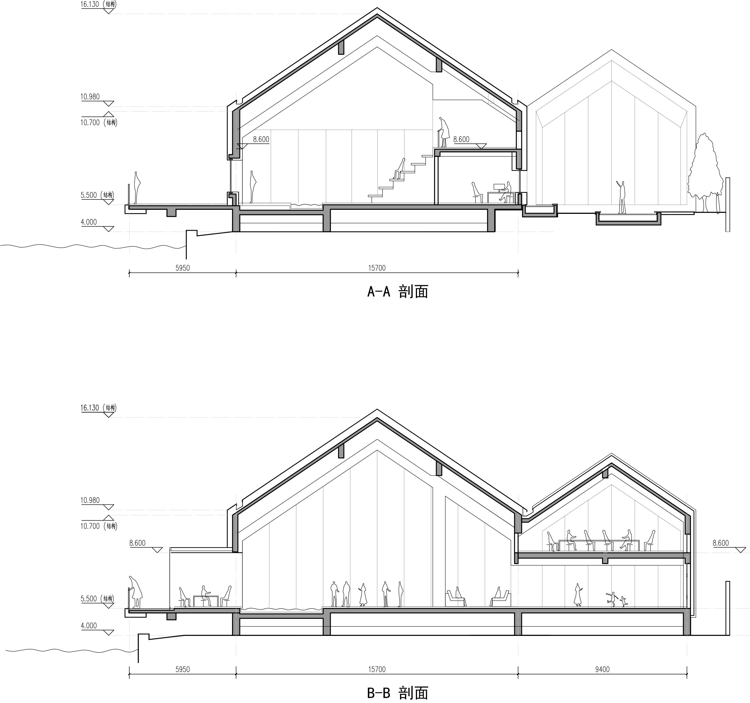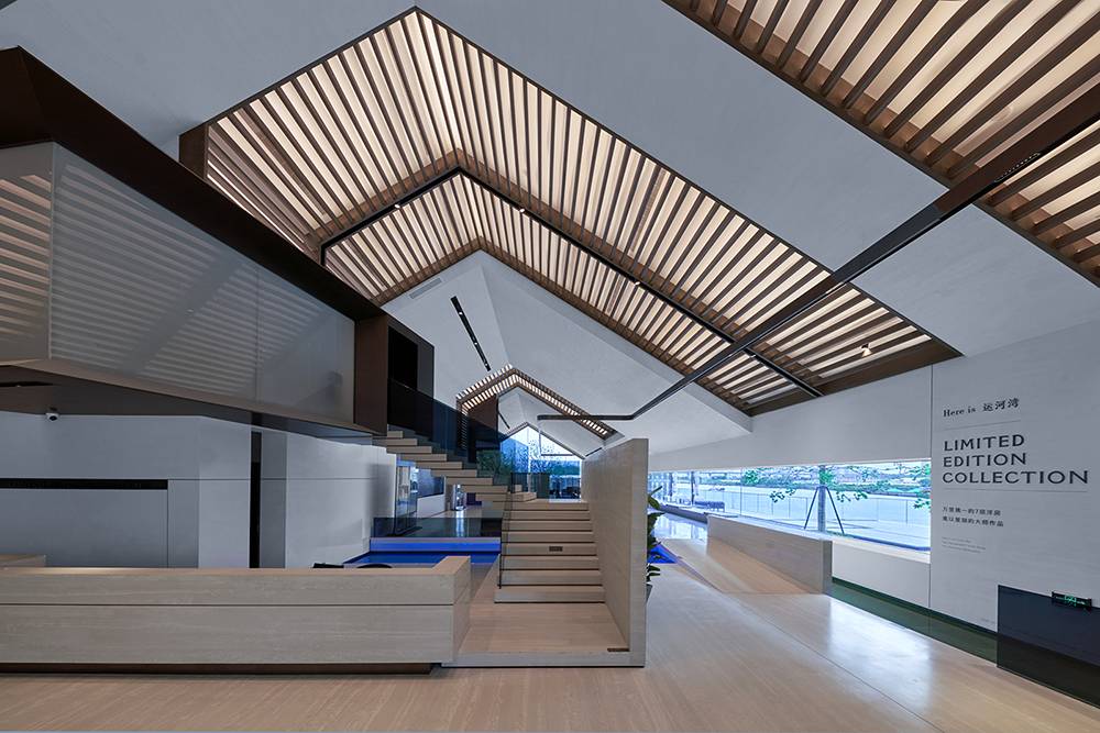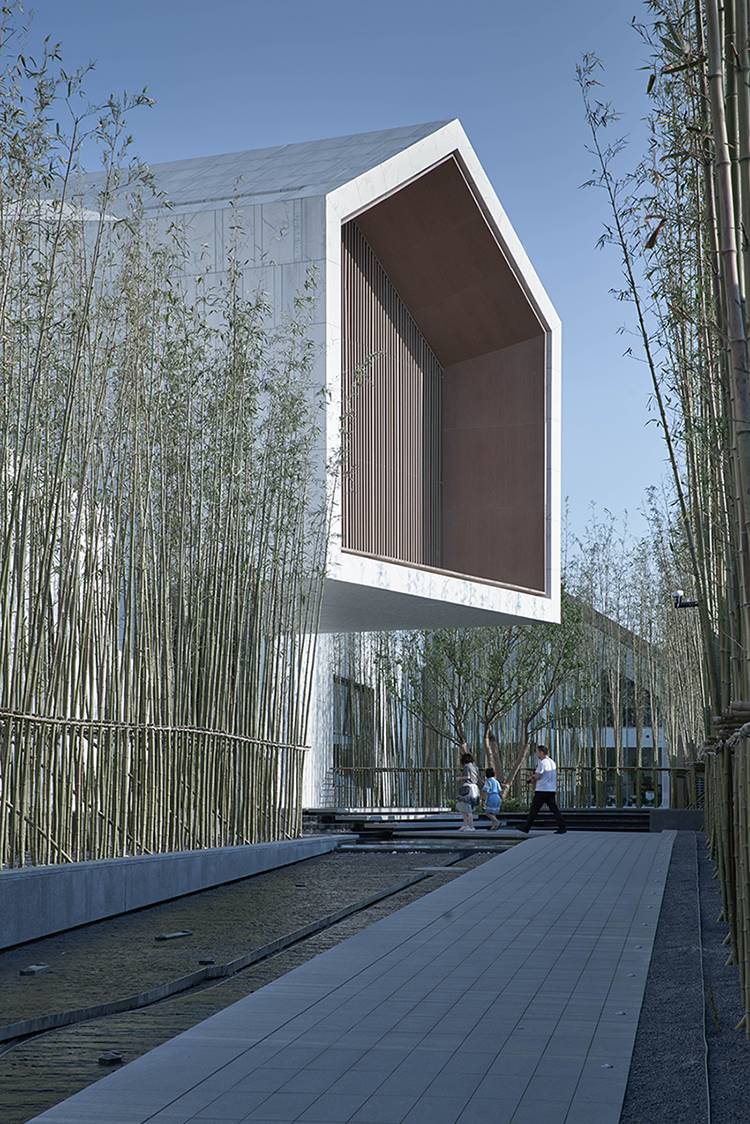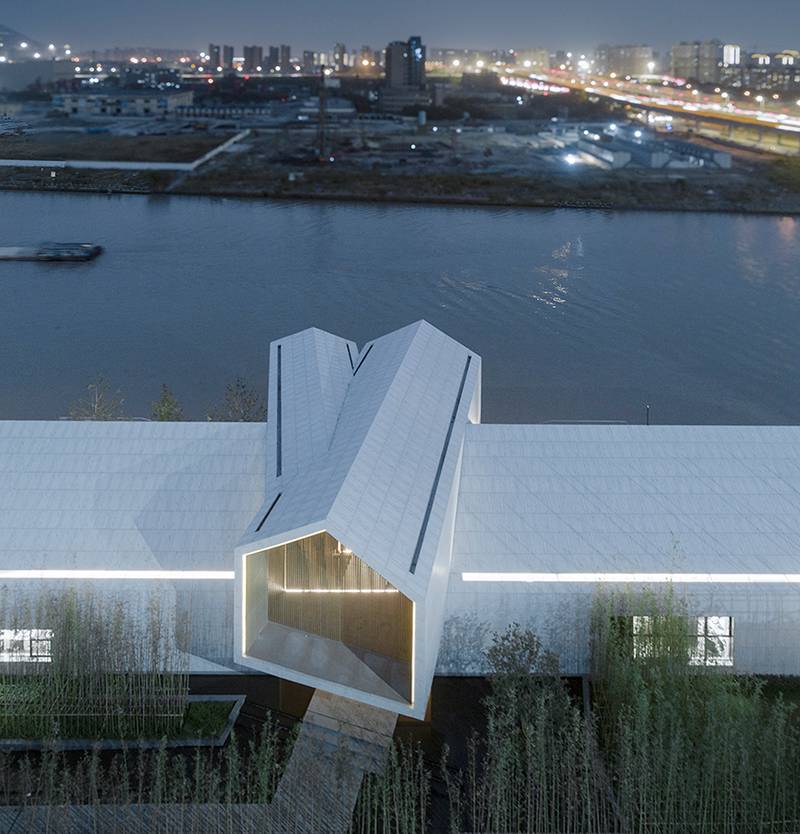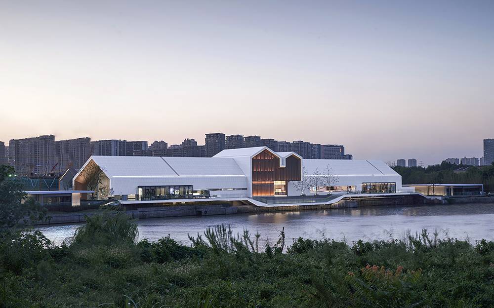因基地狹長且共享入口,出于對(duì)人流動(dòng)線的引導(dǎo),加入交錯(cuò)坡屋頂體量,強(qiáng)化入口中心區(qū)域,并豐富建筑形態(tài)。坡道兩側(cè)密植修竹,與建筑格柵元素的光影婆娑交映,訪客體驗(yàn)情緒鋪墊后達(dá)成空間的轉(zhuǎn)換,觀覽面向運(yùn)河的開敞全景。兩側(cè)室內(nèi)區(qū)域設(shè)置無邊框長條寬熒幕大窗,將運(yùn)河及對(duì)岸城市景觀納入框景,充分利用了運(yùn)河資源。沿河展開的室內(nèi)界面錯(cuò)落靈動(dòng),步移景異中可走出室外,深入貼近濱河場(chǎng)景。