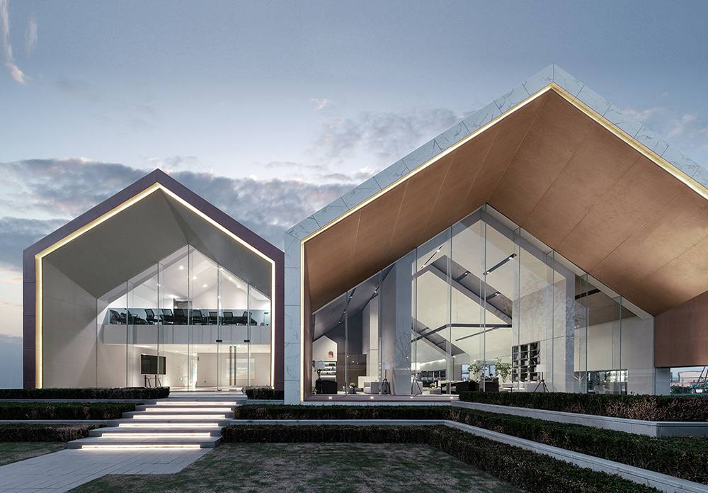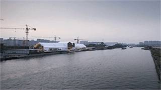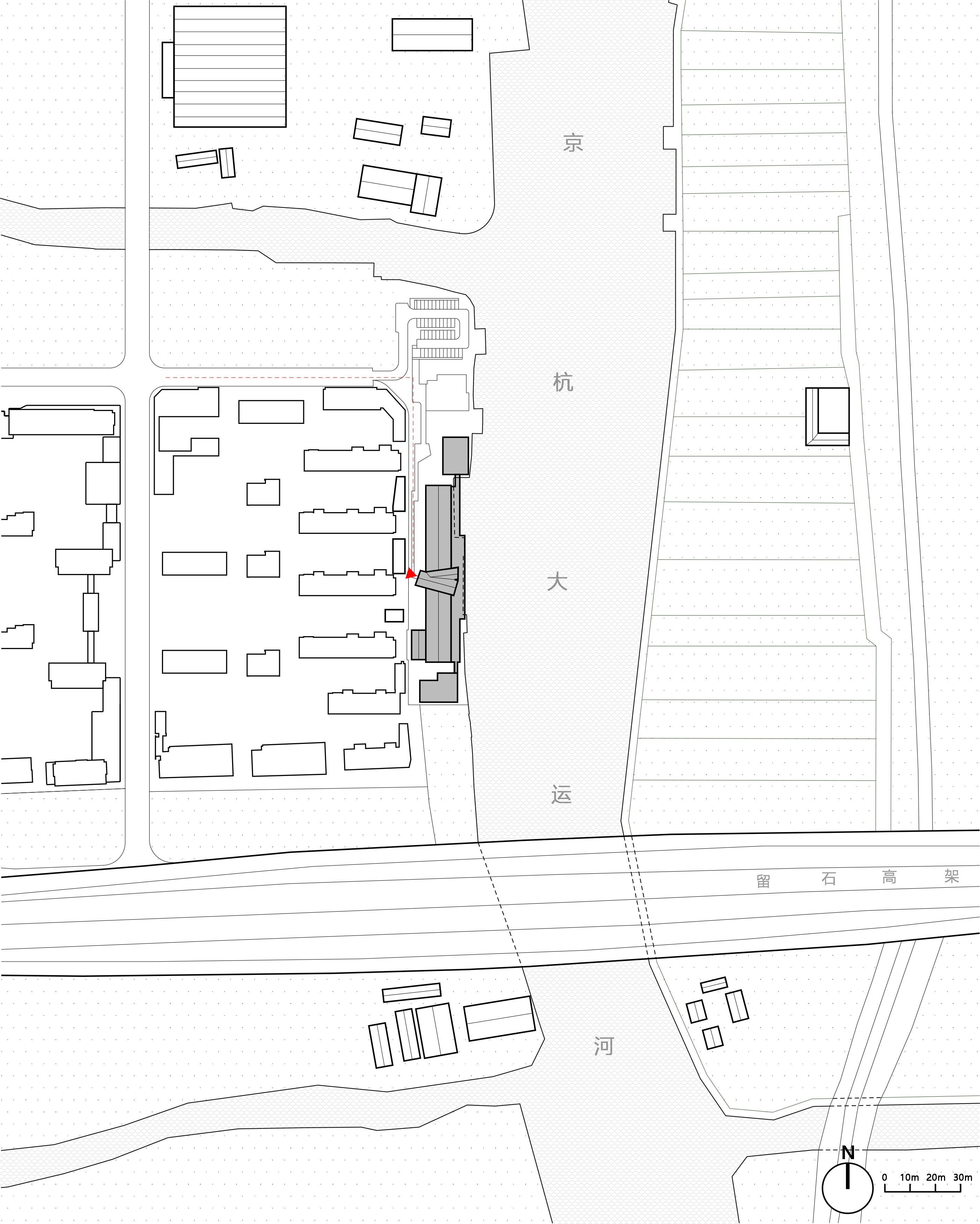 建筑坐落于杭州拱墅區(qū)運(yùn)河西畔,與拱宸橋直線距離約1.5千米,設(shè)定為清晰明確的展示功能,由兩個(gè)獨(dú)立展示中心組成。周邊的橋西直街歷史街區(qū),見證了清末到民國杭州近現(xiàn)代工業(yè)發(fā)展軌跡。由于城市的擴(kuò)展,此區(qū)域已經(jīng)成為杭州城市中心區(qū)的一部分。隨著時(shí)代的變遷,沿河的運(yùn)輸功能逐漸被休閑娛樂、文化展示功能覆蓋,保留下來的歷史建筑帶有一定的共通符號(hào)。不論是清末之前低矮的灰墻黛瓦民居,還是民國時(shí)期興建的聯(lián)排廠房或碼頭倉庫,均具備「坡屋頂」元素。我們從建筑形制上做出歸納,為項(xiàng)目積載傳統(tǒng)底蘊(yùn),呼應(yīng)基地的原生肌理。