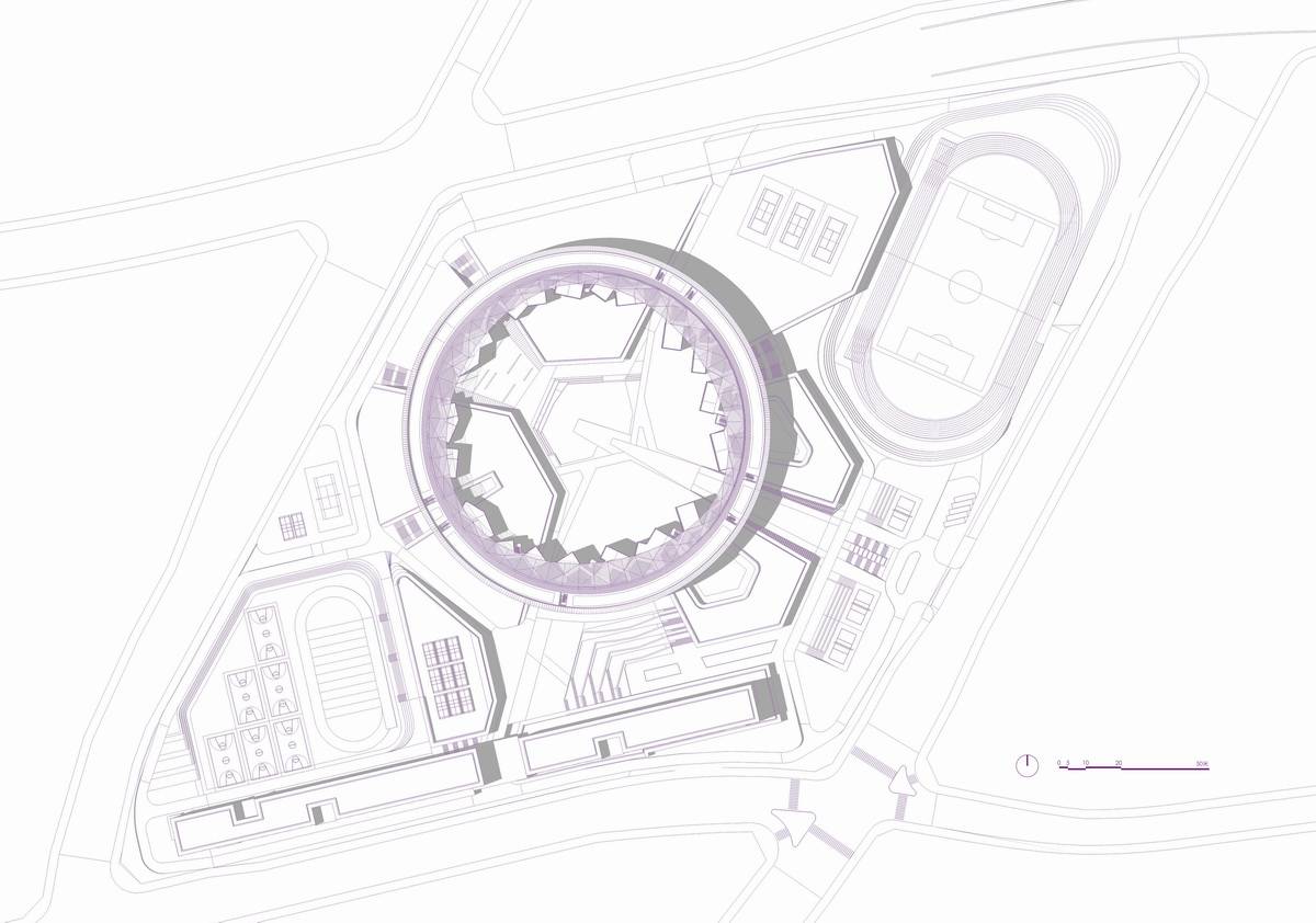本部的校園教學(xué)樓呈現(xiàn)圍繞操場布局的狀態(tài),經(jīng)推敲得出這種布局之下的校園空間尺度更為充裕,設(shè)計(jì)之中也在延續(xù)南開中學(xué)本部的空間邏輯。然而基地范圍內(nèi),高差、噪音、用地范圍均構(gòu)成了設(shè)計(jì)的限制因素。在綜合考慮空間效率的同時(shí),南開中學(xué)校園文化中開放、進(jìn)取的精神也無一不在影響著對(duì)中學(xué)設(shè)計(jì)的考量。