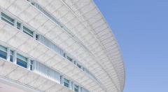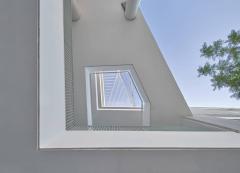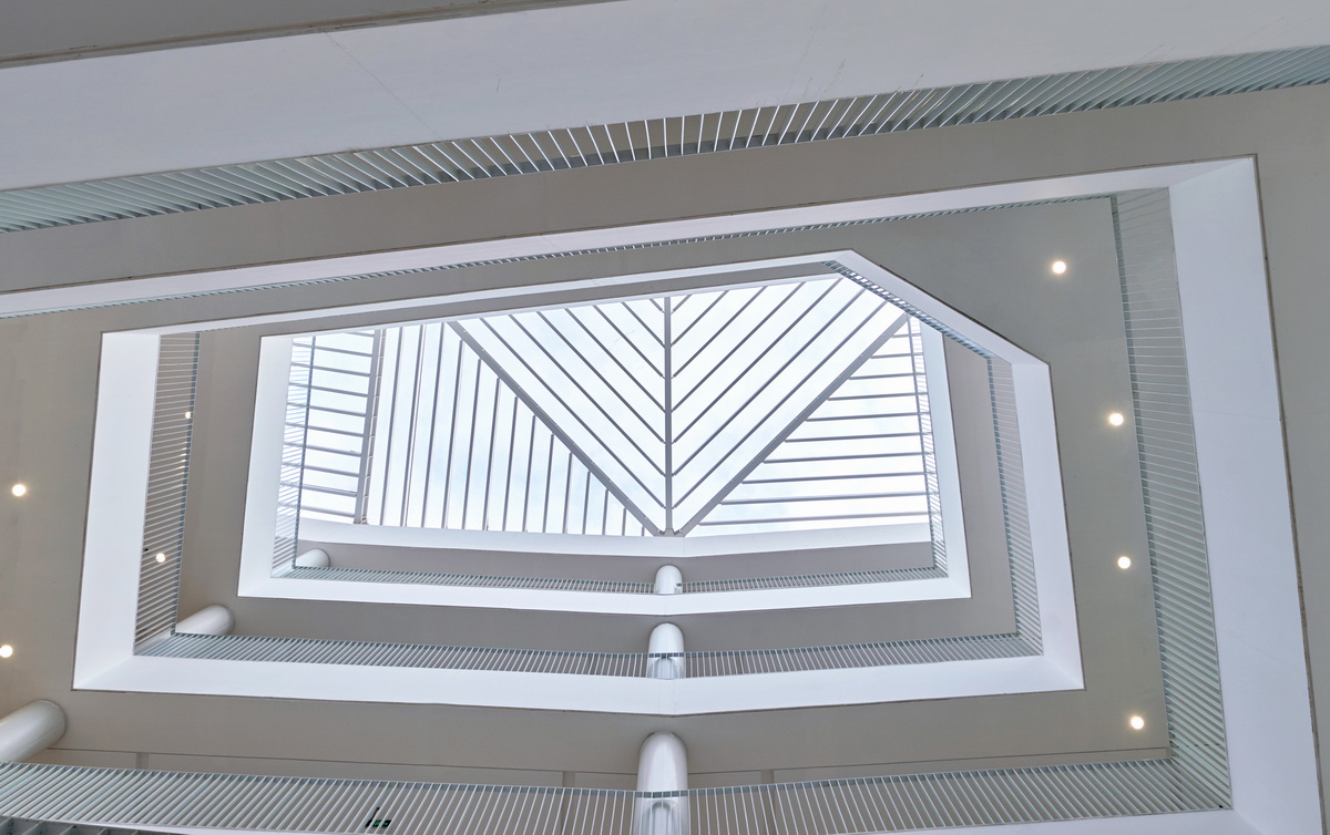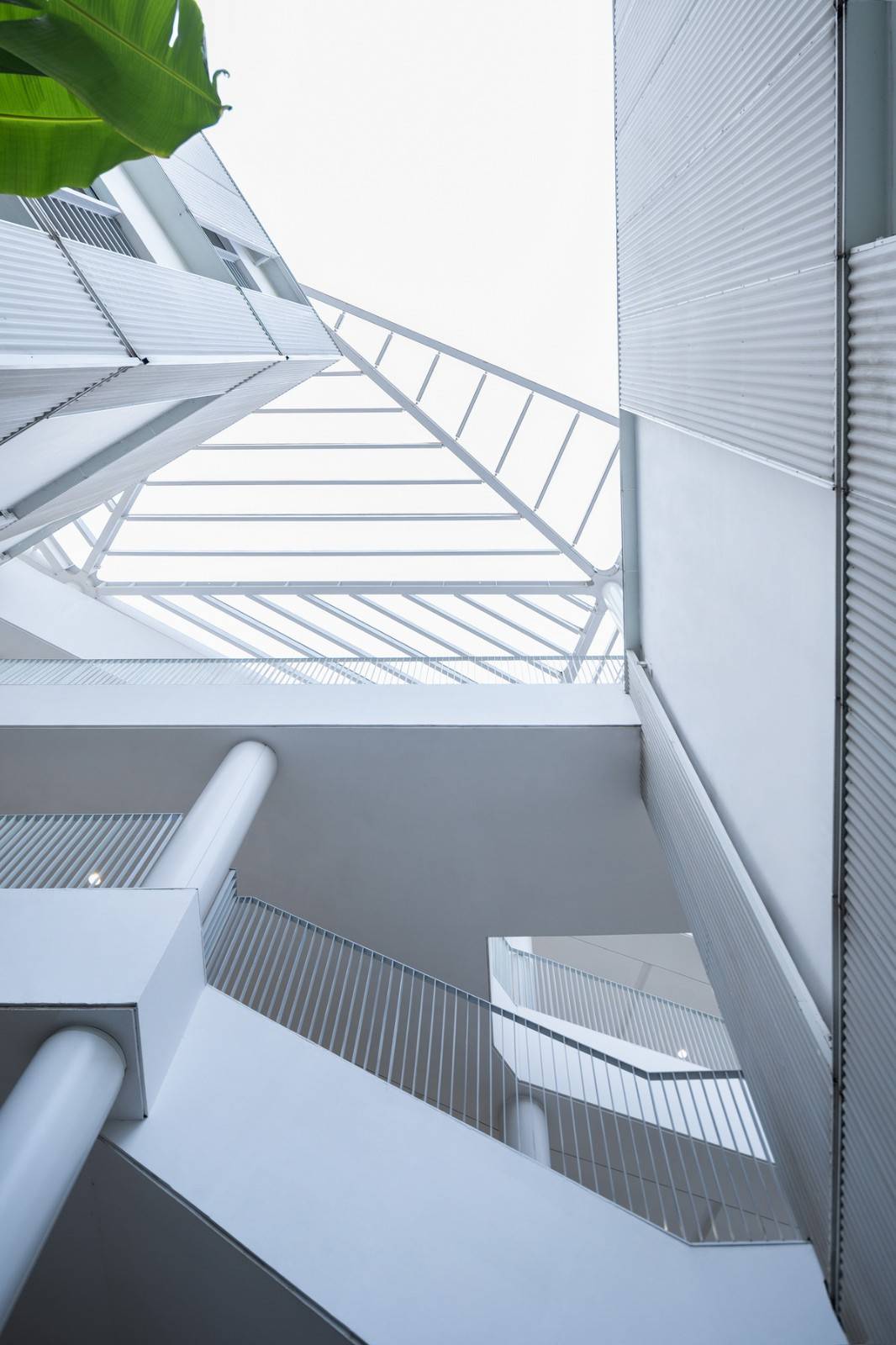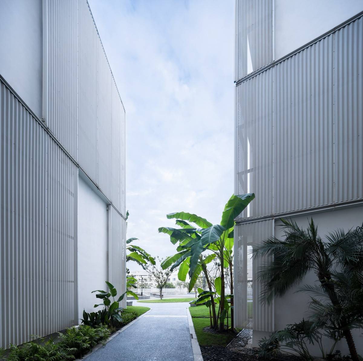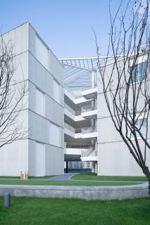 動(dòng)靜有致的校園,成為課間10分鐘的活力催化劑。內(nèi)庭院猶如峽谷般的高低起伏,學(xué)術(shù)報(bào)告廳和禮堂則順勢而建,場地中不乏生態(tài)氣息,內(nèi)圈模數(shù)化頂棚為場地帶來了必要的光線控制,整體立面則采用豎向格柵遮擋黑板區(qū)直射光線,這樣的方式也為空間加入些許律動(dòng)。