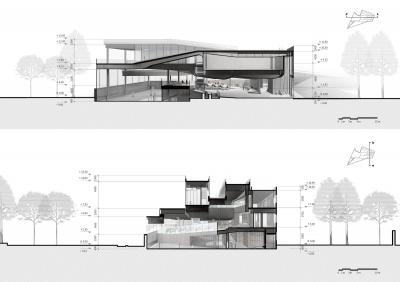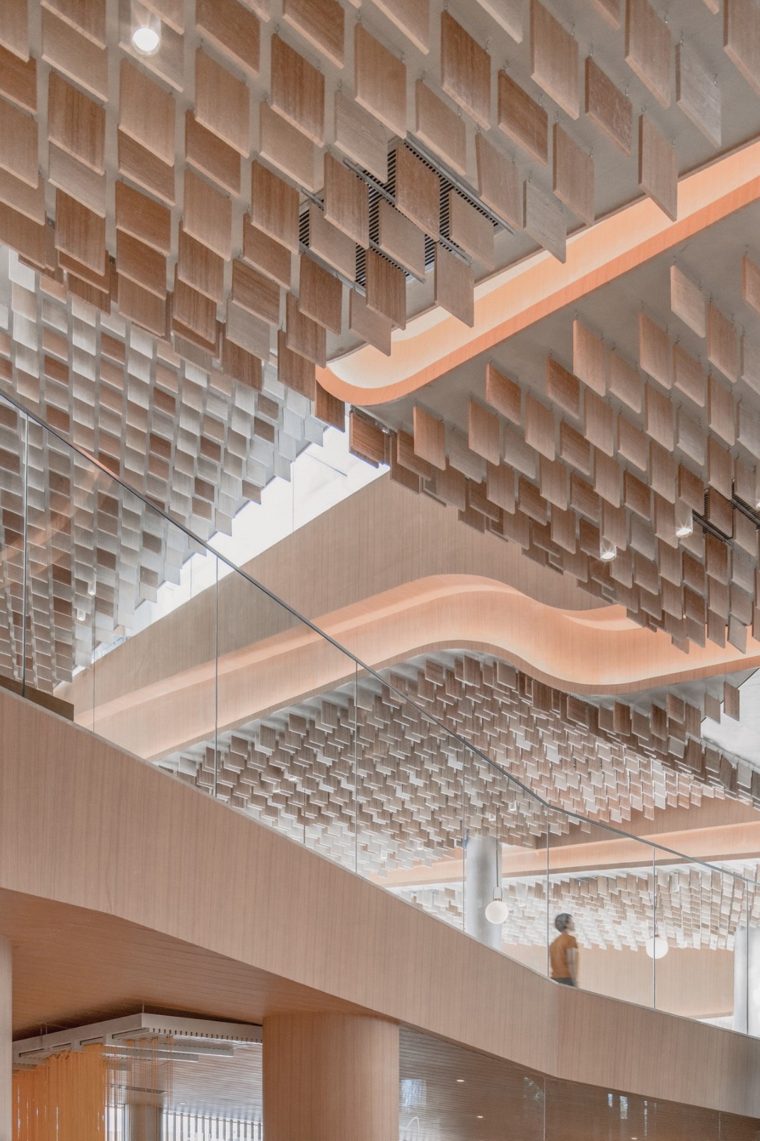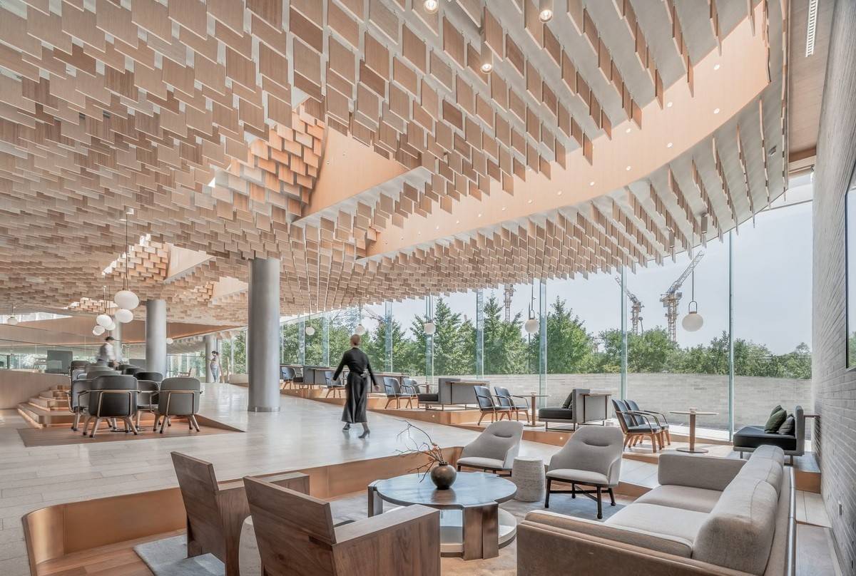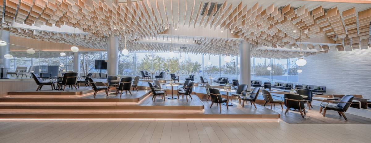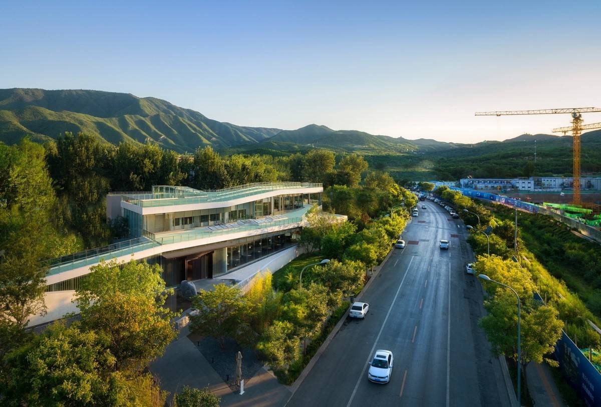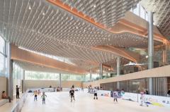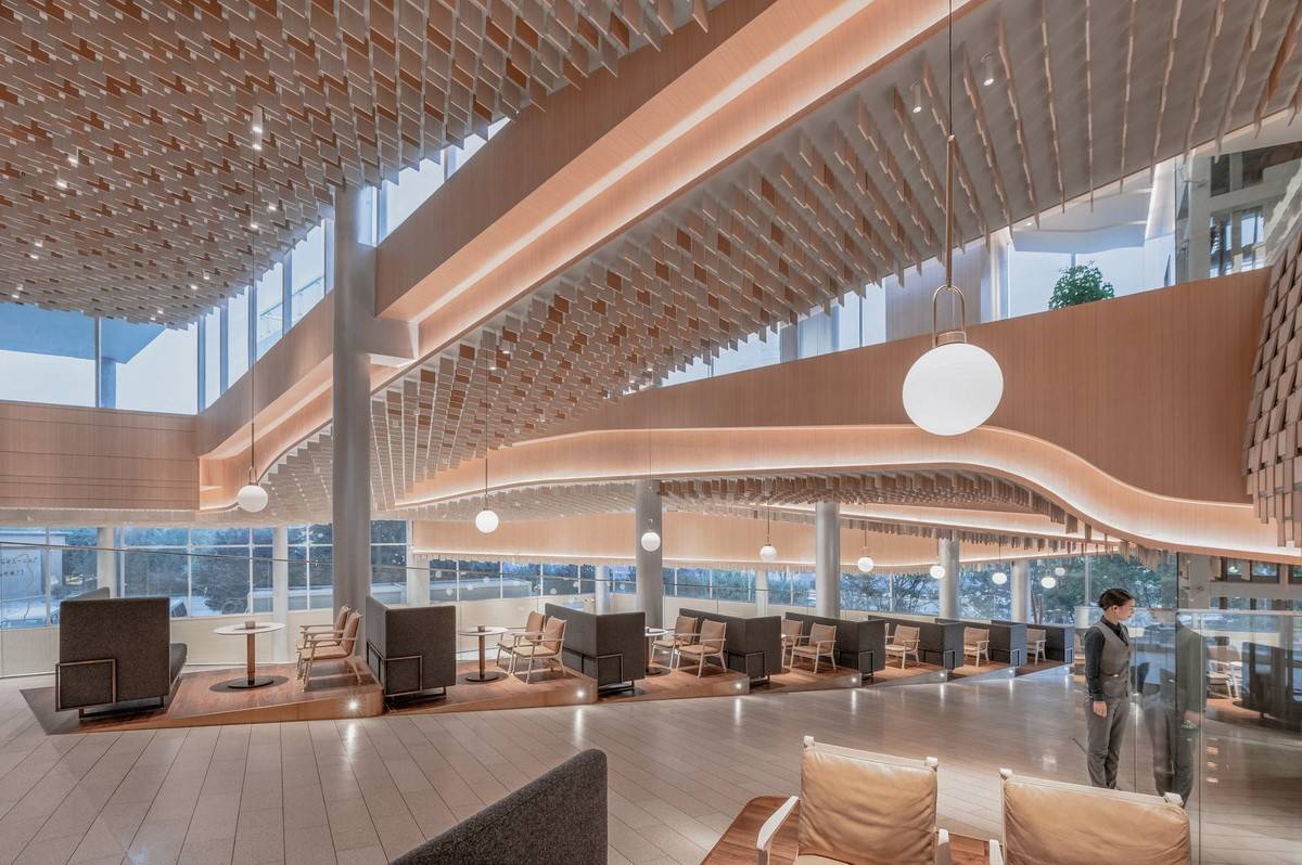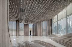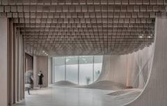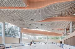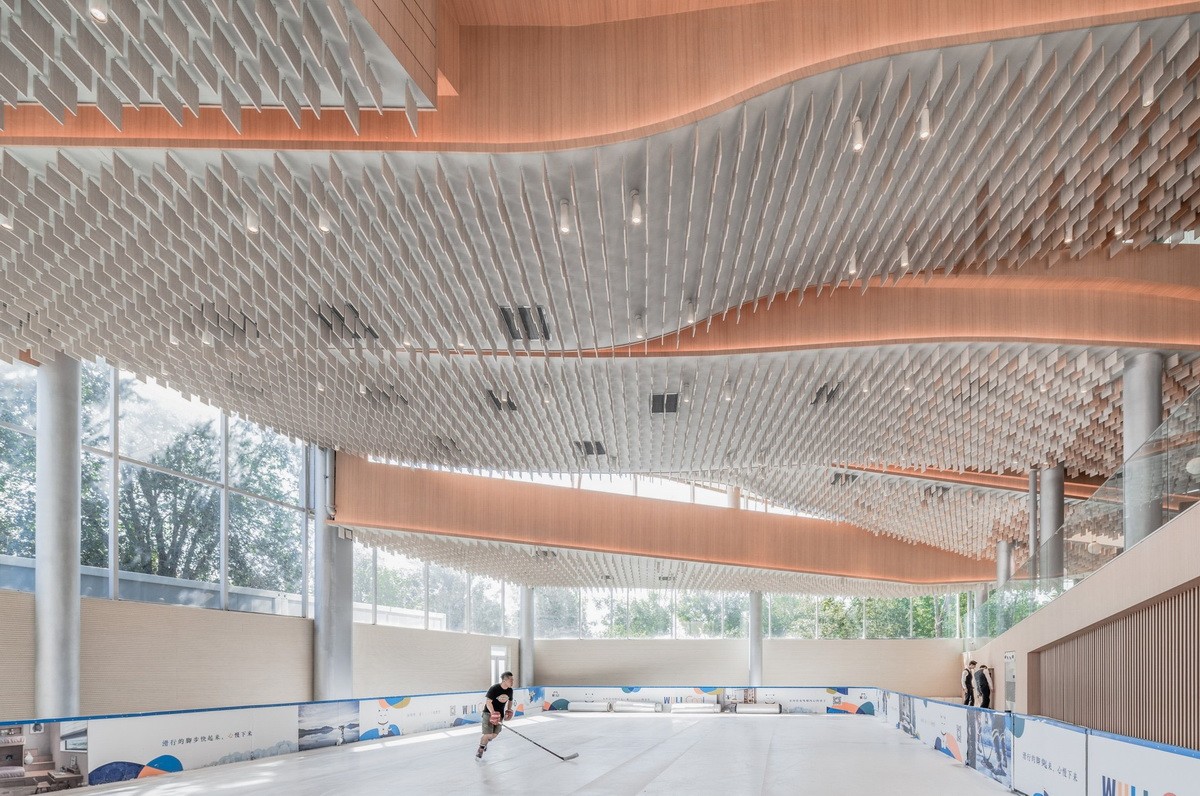項(xiàng)目以三種方式詮釋了自然:第一,室內(nèi)空間以數(shù)字化的方式描繪了自然:“西山秋葉”的標(biāo)志性印象在這里以天花板上粼粼的木質(zhì)垂片加以呈現(xiàn),其顏色由溫暖的黃色變成了白色,暗示著從入口到滑冰場的過渡;在更大的尺度上,天花板的層疊遞進(jìn)的曲線形成了“倒置西山”的形態(tài)。
