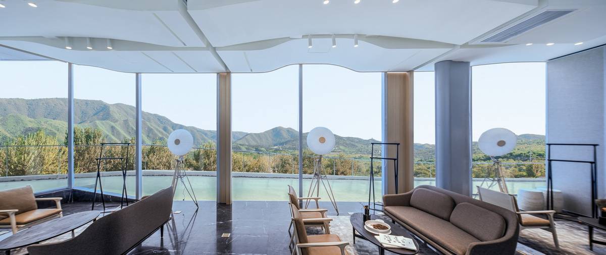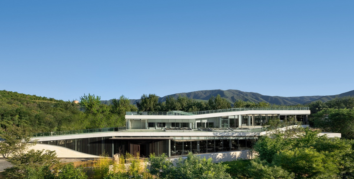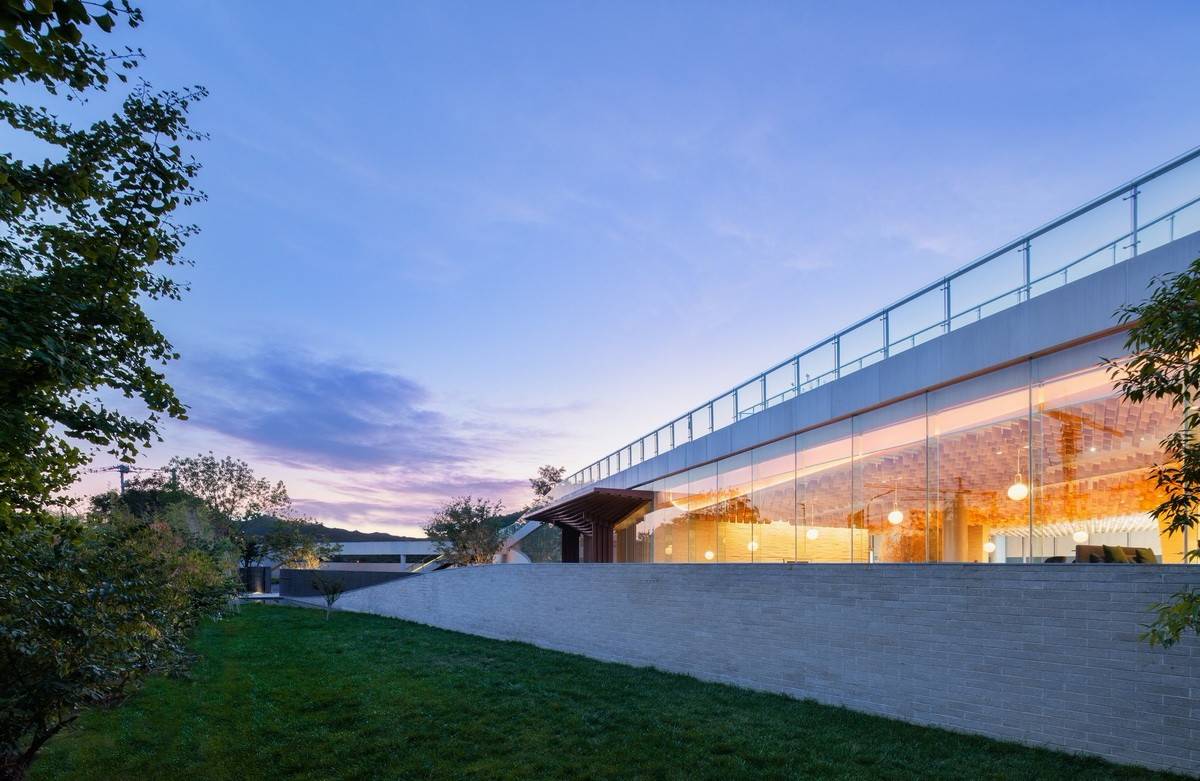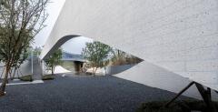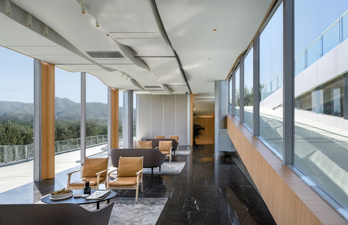 被北京壯麗的西山景觀包圍的五里春秋泛文化藝術(shù)中心試圖創(chuàng)造一個(gè)建筑、景觀、室內(nèi)三位一體的項(xiàng)目,它的建筑和室內(nèi)設(shè)計(jì)試圖讓觀者體驗(yàn)身臨其境的被景觀環(huán)繞的感受。一條連續(xù)的從外到內(nèi)的坡道盤旋上升,遠(yuǎn)處的景觀被動(dòng)態(tài)地而不是靜止地引入到建筑中來,此時(shí),景觀的“第一本質(zhì)”便和室內(nèi)的“第二本質(zhì)”無縫的聯(lián)系在了一起。由于室內(nèi)外都緊密圍繞著景觀展開,這個(gè)向上的路徑空間的氣氛在某種程度上具有了一種朝拜自然的儀式感。