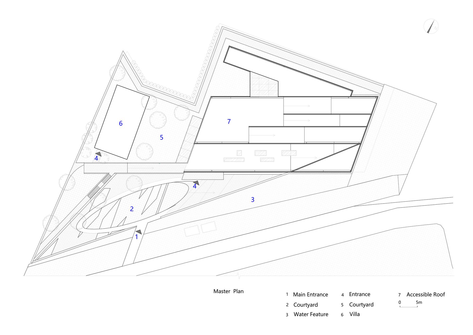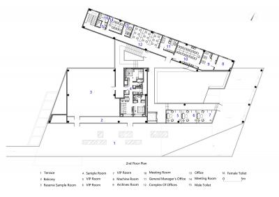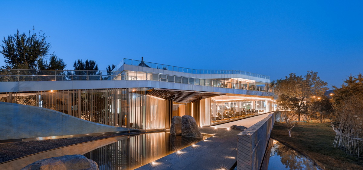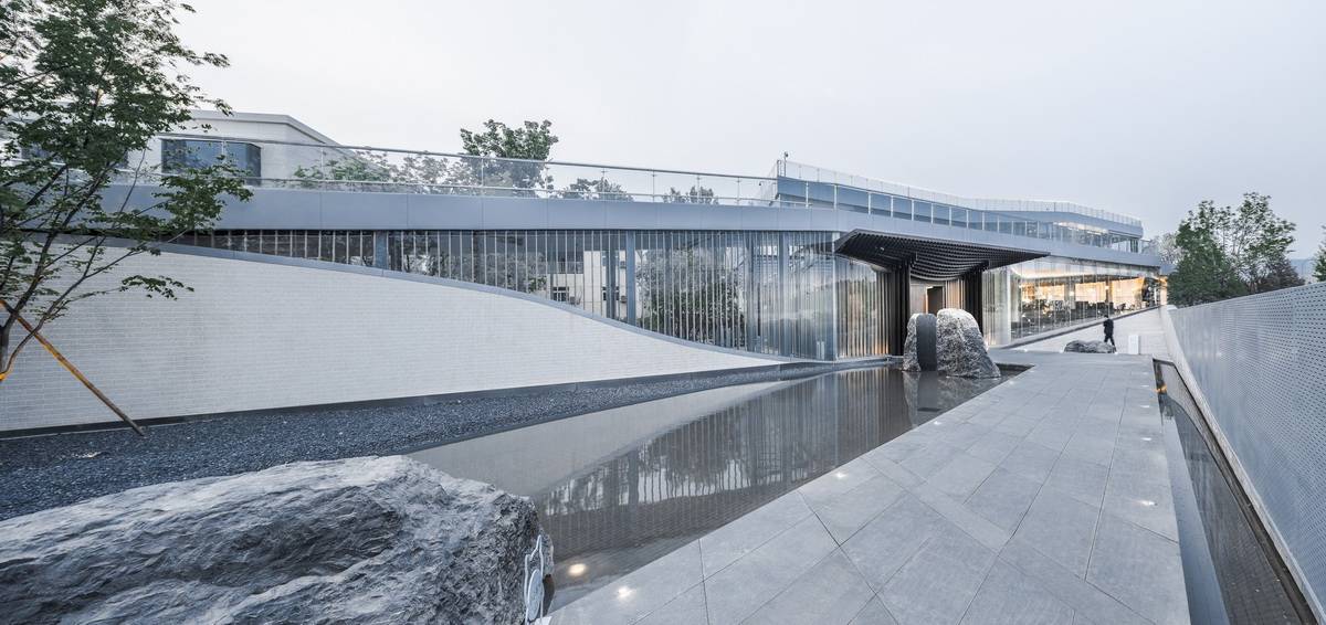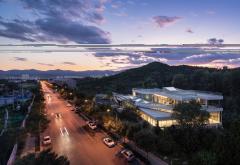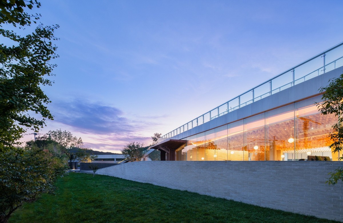 被北京壯麗的西山景觀包圍的五里春秋泛文化藝術(shù)中心試圖創(chuàng)造一個(gè)建筑、景觀、室內(nèi)三位一體的項(xiàng)目,它的建筑和室內(nèi)設(shè)計(jì)試圖讓觀者體驗(yàn)身臨其境的被景觀環(huán)繞的感受。一條連續(xù)的從外到內(nèi)的坡道盤旋上升,遠(yuǎn)處的景觀被動(dòng)態(tài)地而不是靜止地引入到建筑中來,此時(shí),景觀的“第一本質(zhì)”便和室內(nèi)的“第二本質(zhì)”無縫的聯(lián)系在了一起。由于室內(nèi)外都緊密圍繞著景觀展開,這個(gè)向上的路徑空間的氣氛在某種程度上具有了一種朝拜自然的儀式感。